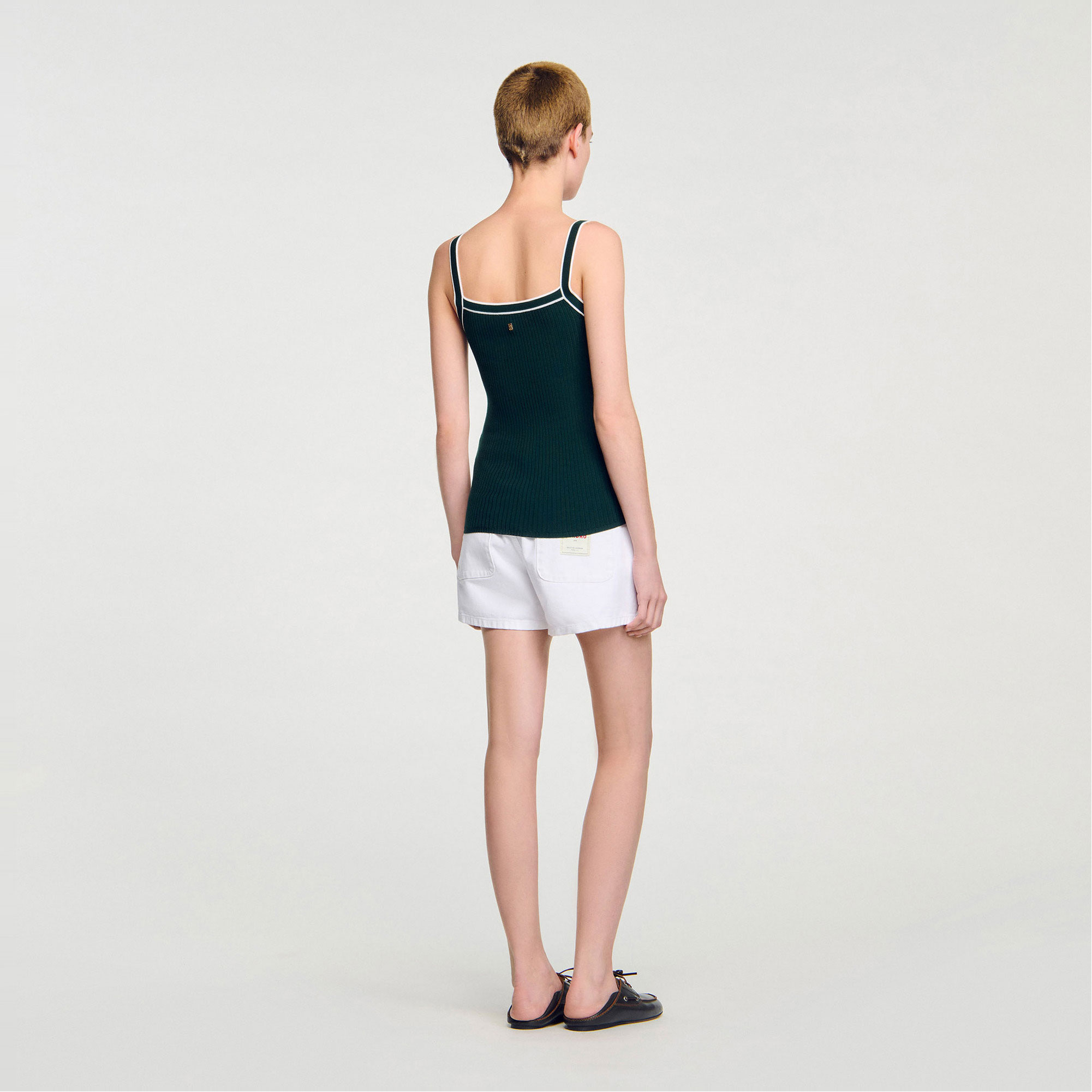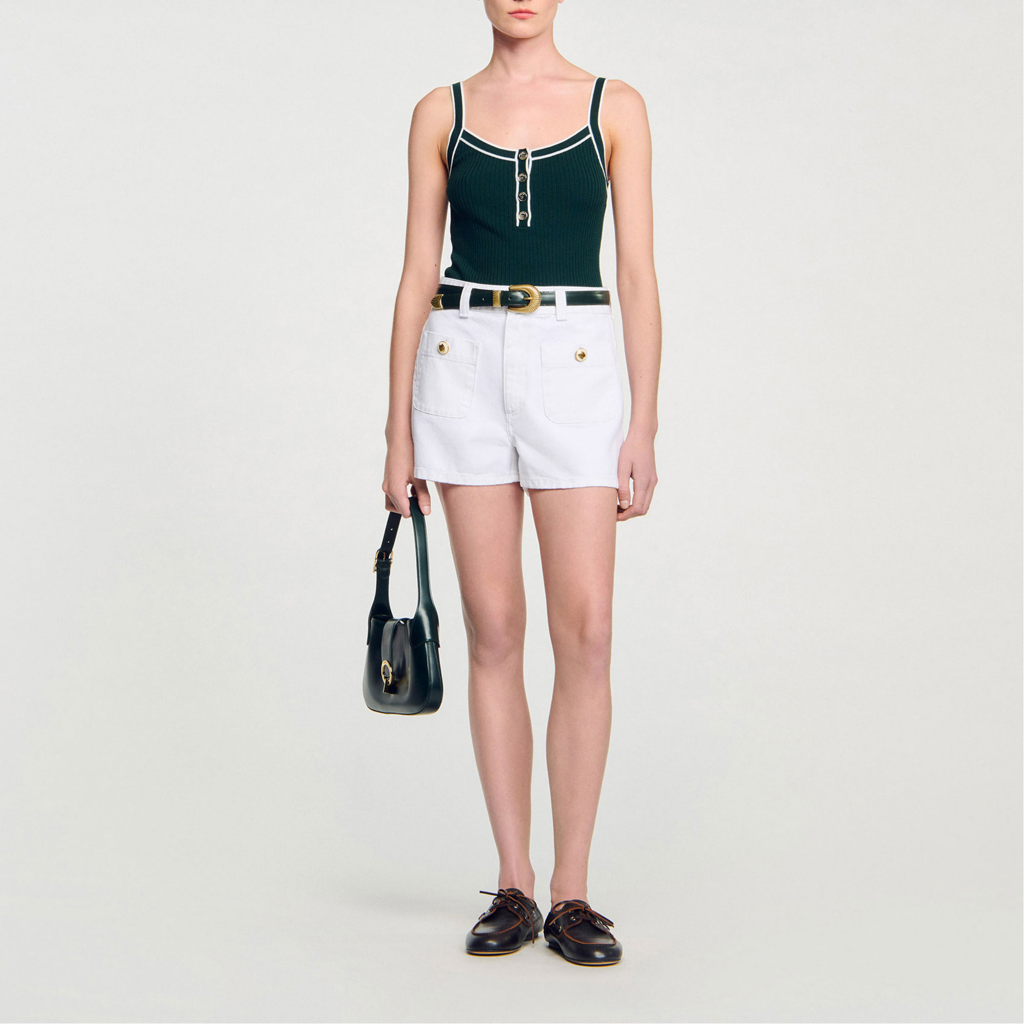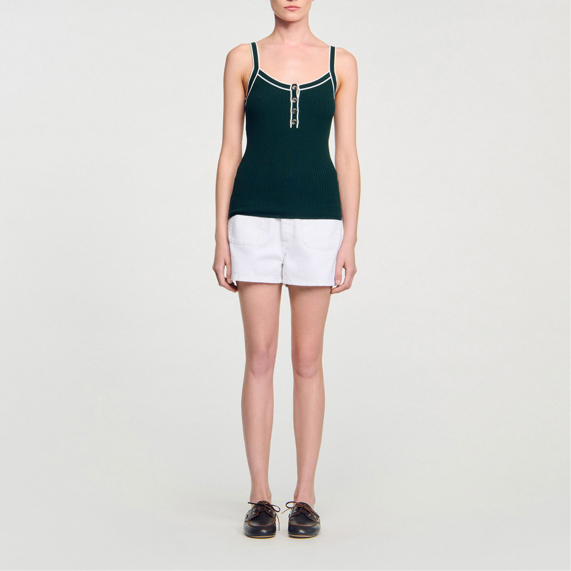 - Fine rib knit, contrast piping, straps, decorative button placket, slim fit