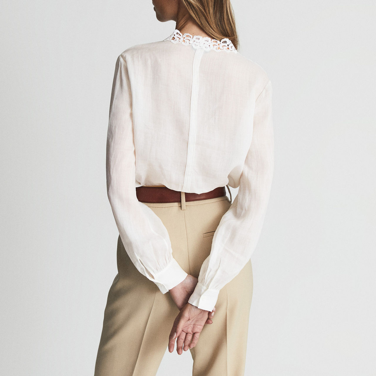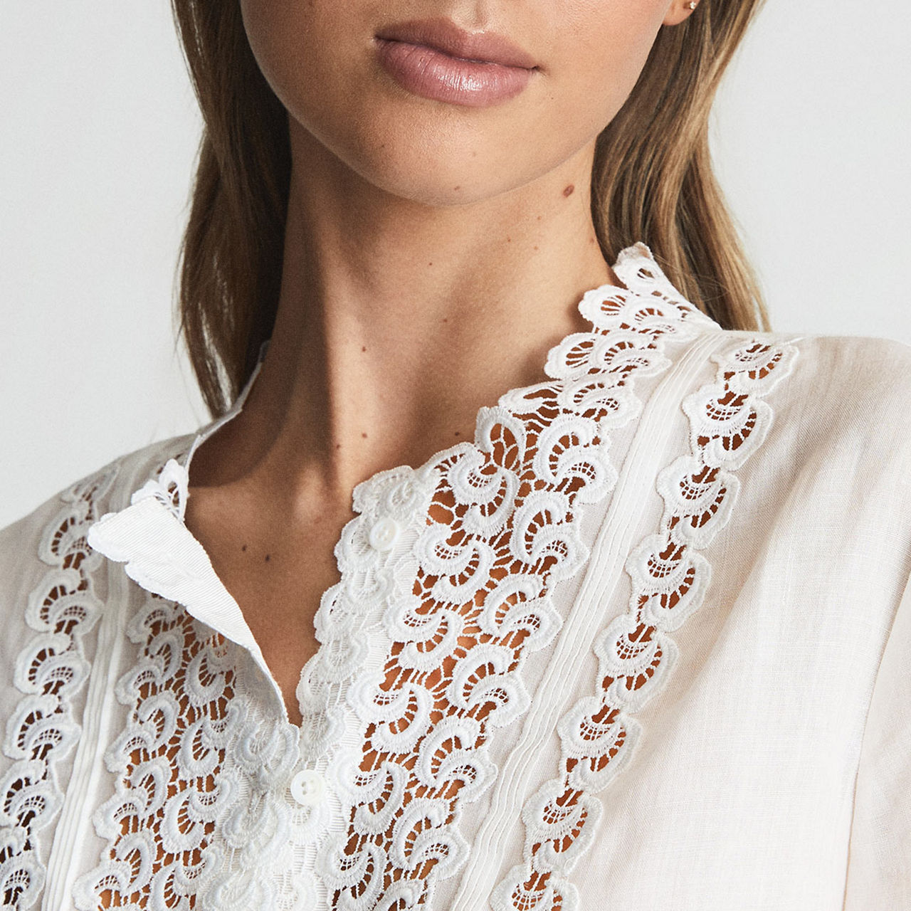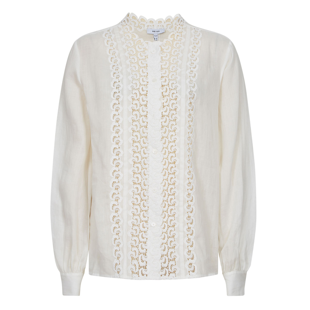 Detailed with delicate lace inserts, the Ellison blouse from Reiss is an elegant addition to your summer wardrobe. Constructed from lightweight ramie, it is perfect for teaming with denim shorts on hot summer evenings.