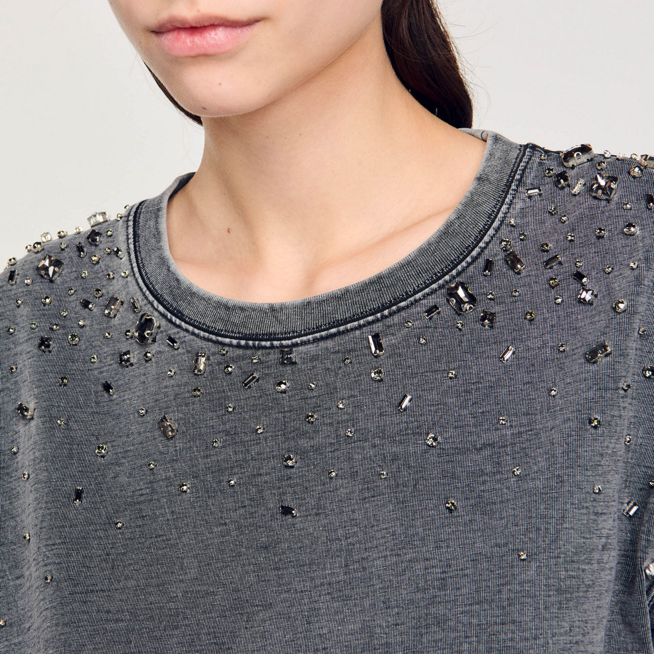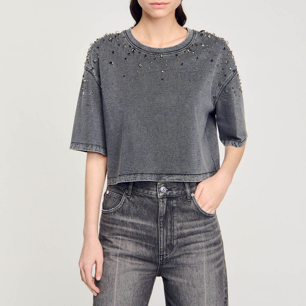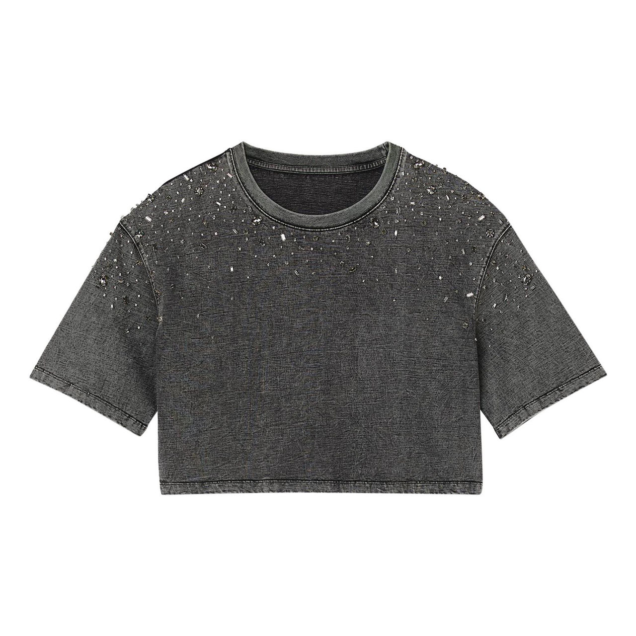 - Faded-effect, short sleeves, round neckline, hand-embroidered rhinestone embellishment