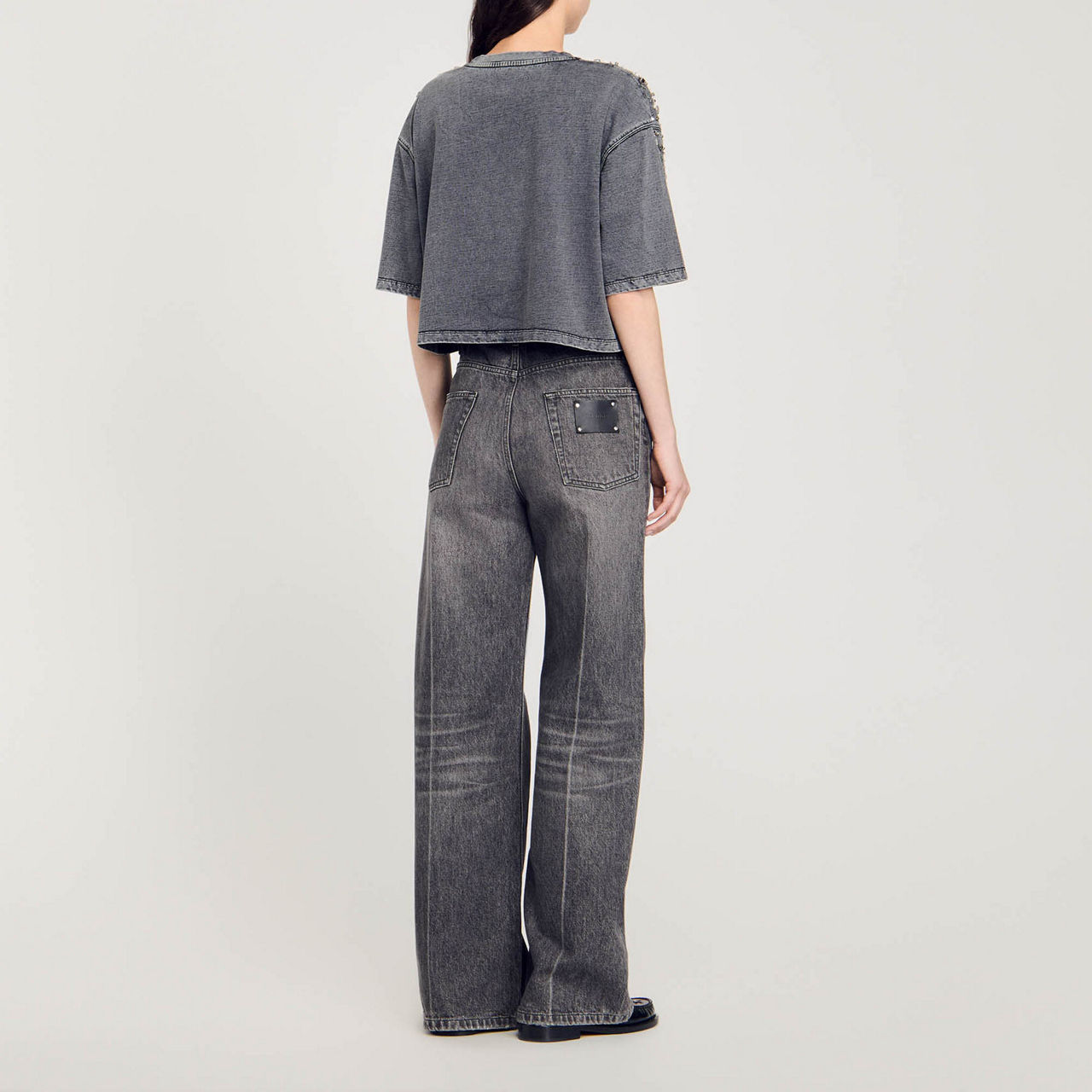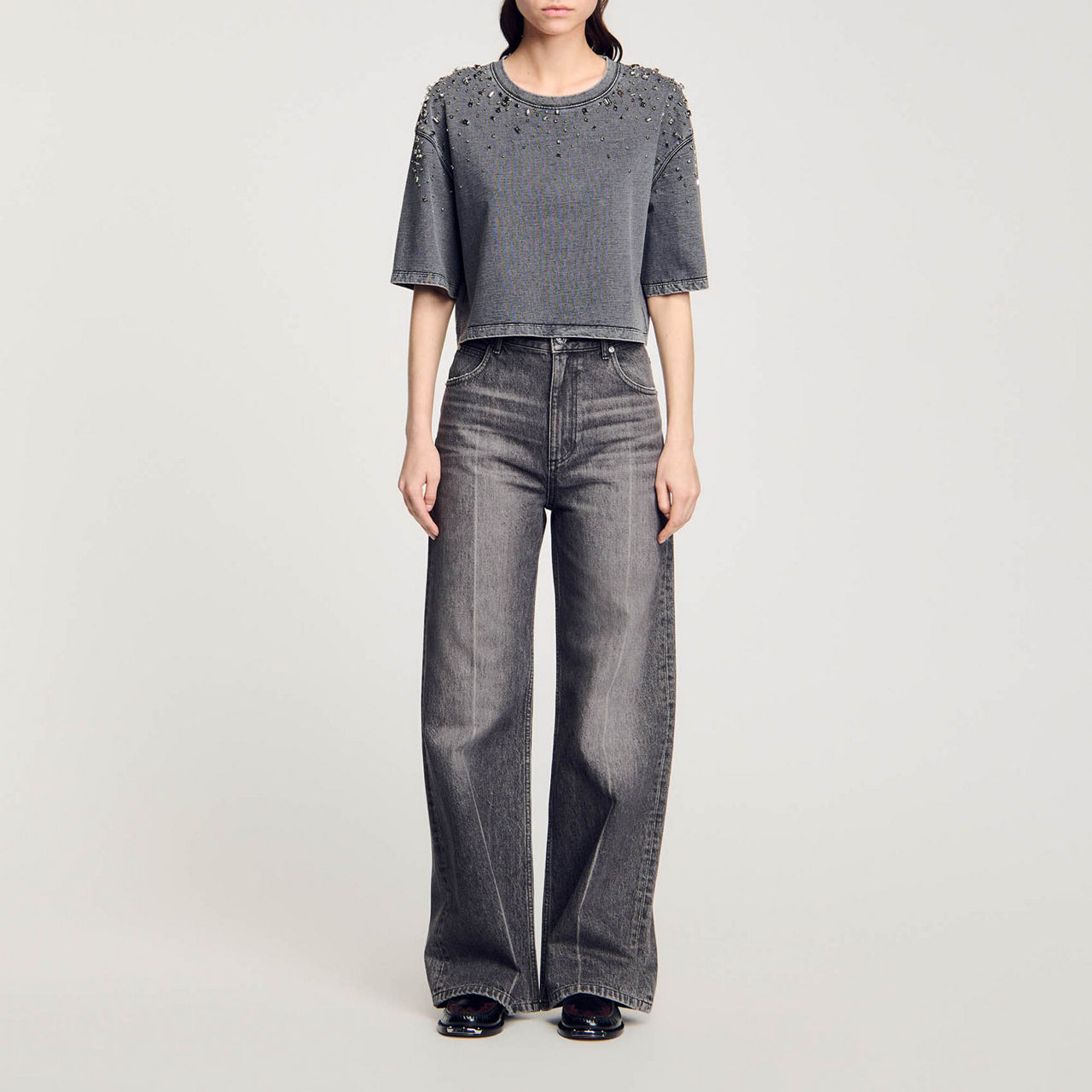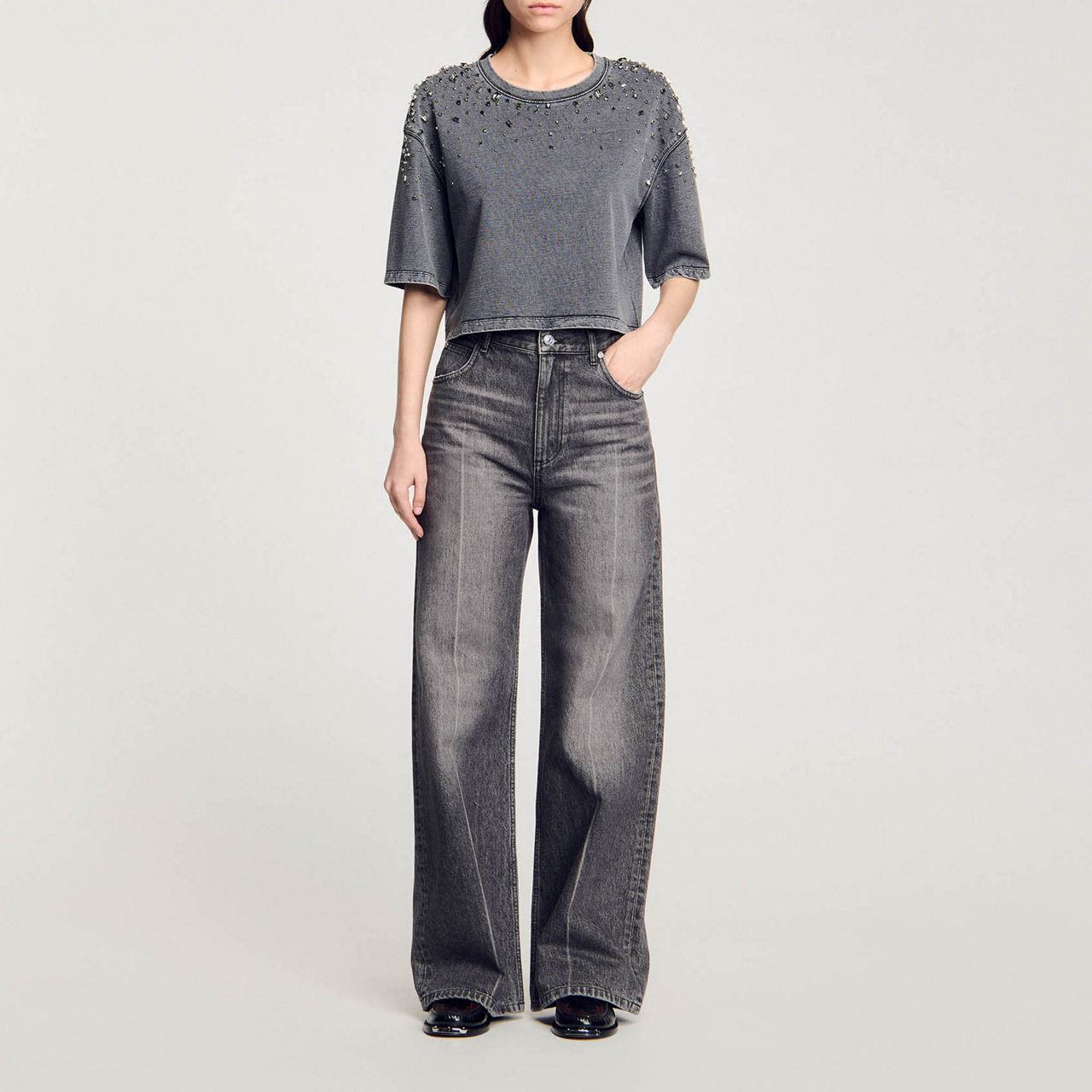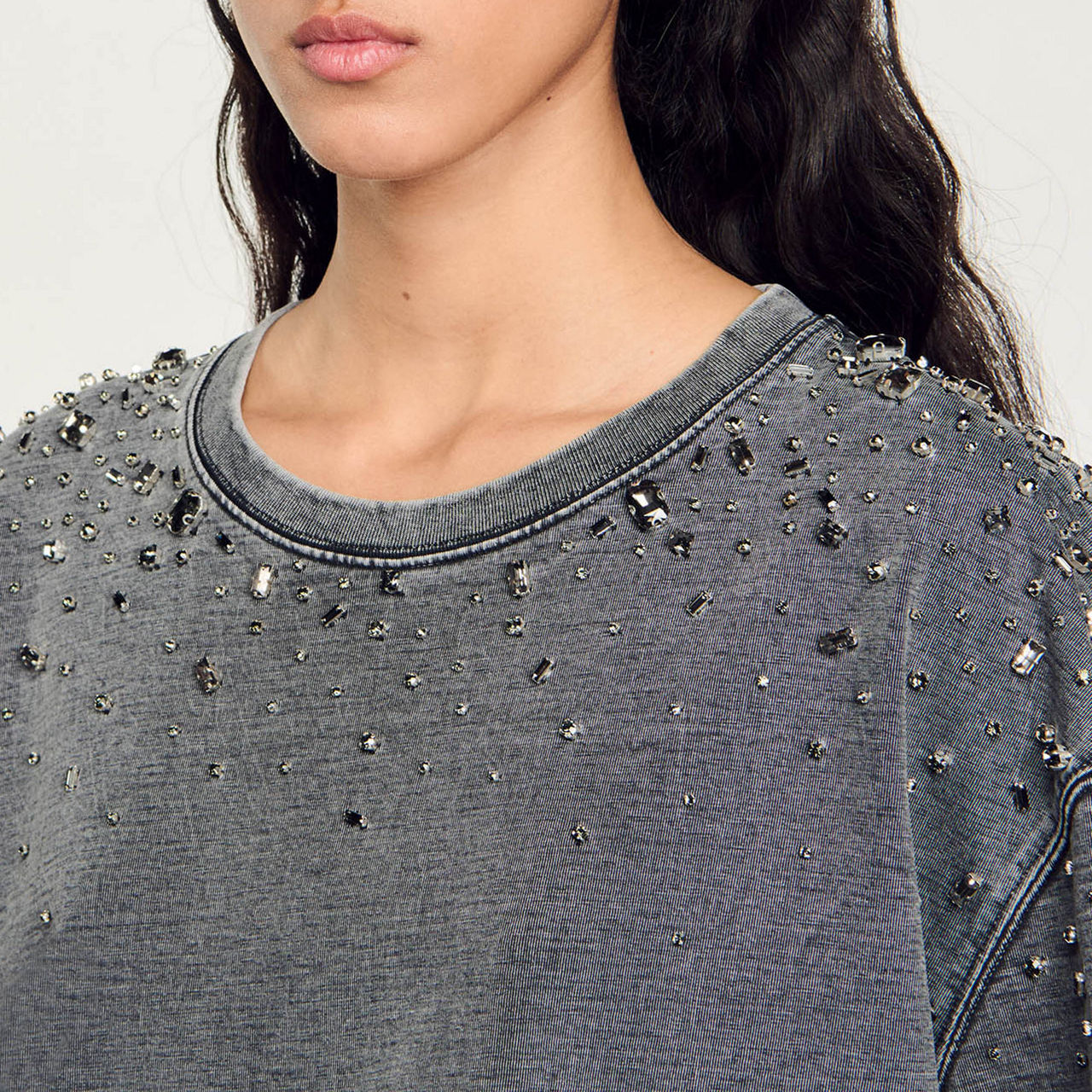 - Faded-effect, short sleeves, round neckline, hand-embroidered rhinestone embellishment