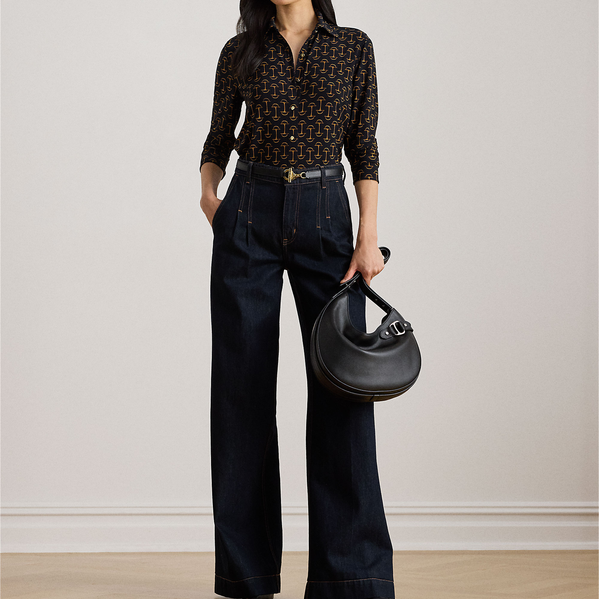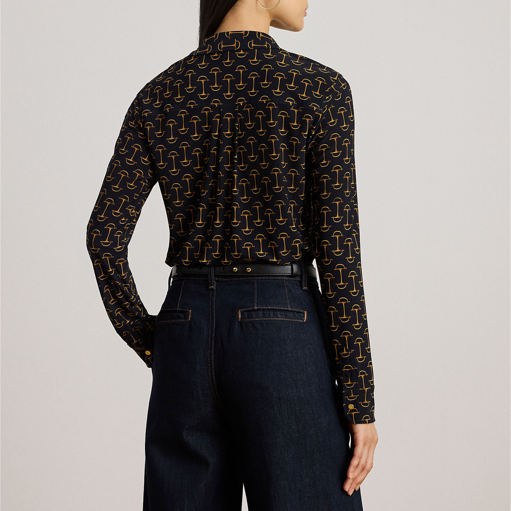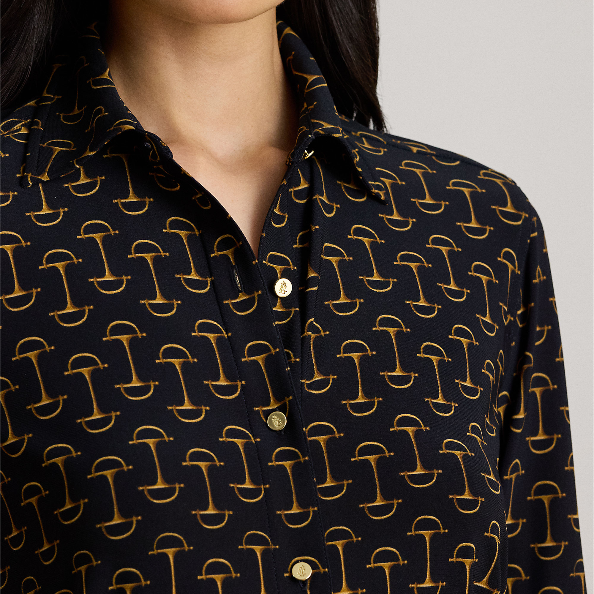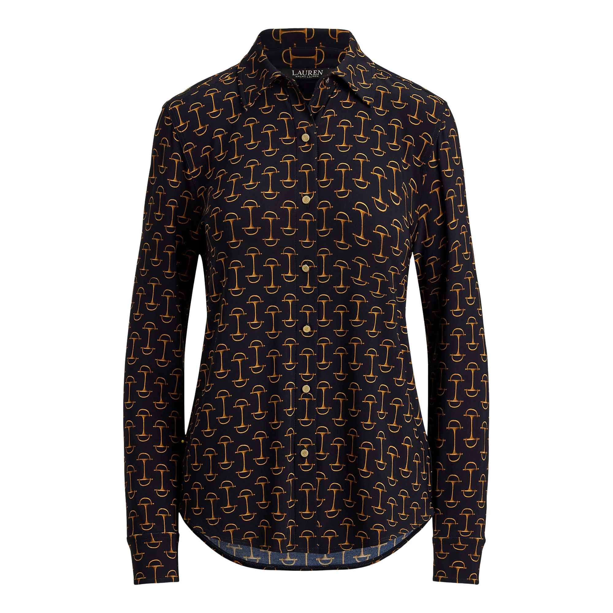 - Soft stretch-fused jersey fabric, button-down design, equestrian-inspired geometric print, spread collar, buttoned placket, metal buttons with “LRL” logo detail, long sleeves, buttoned barrel cuffs, box-pleated back yoke, shirttail hem