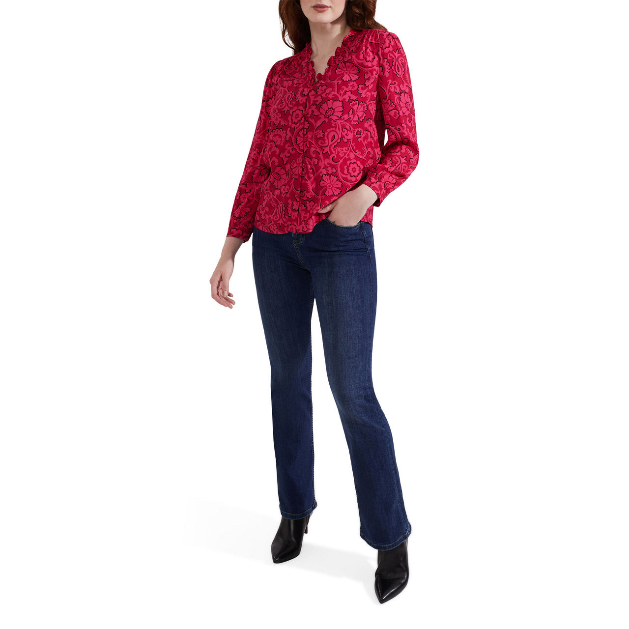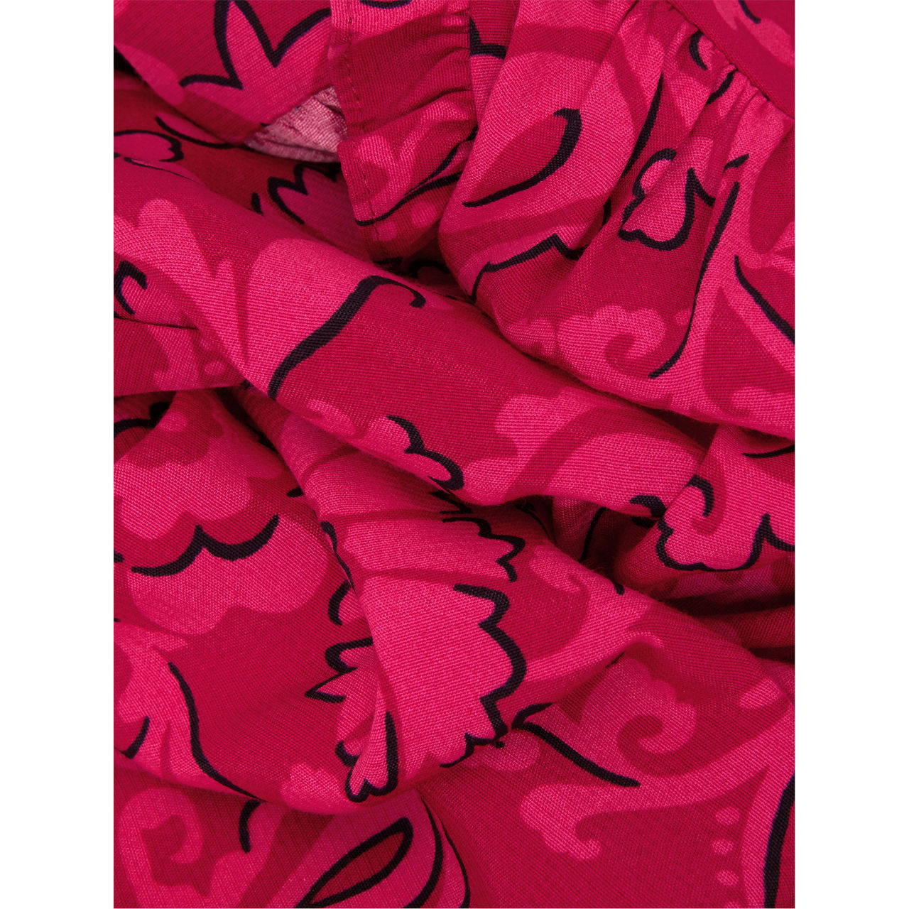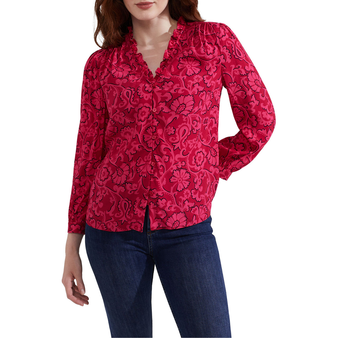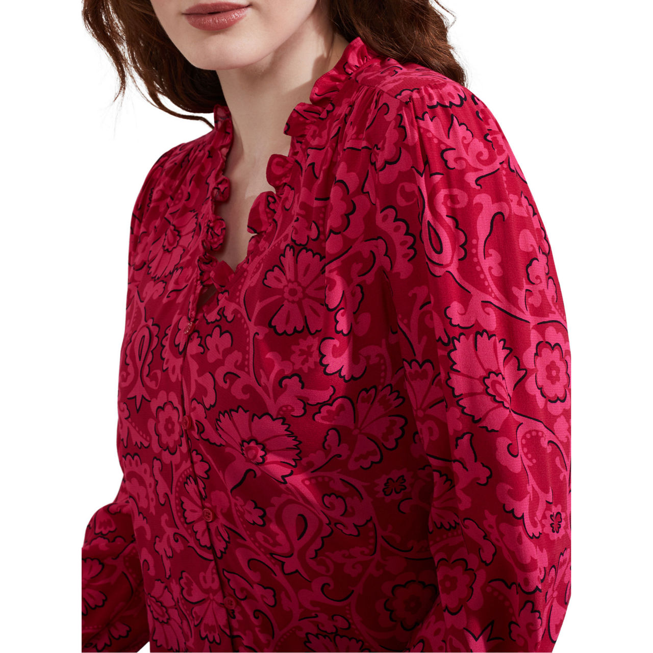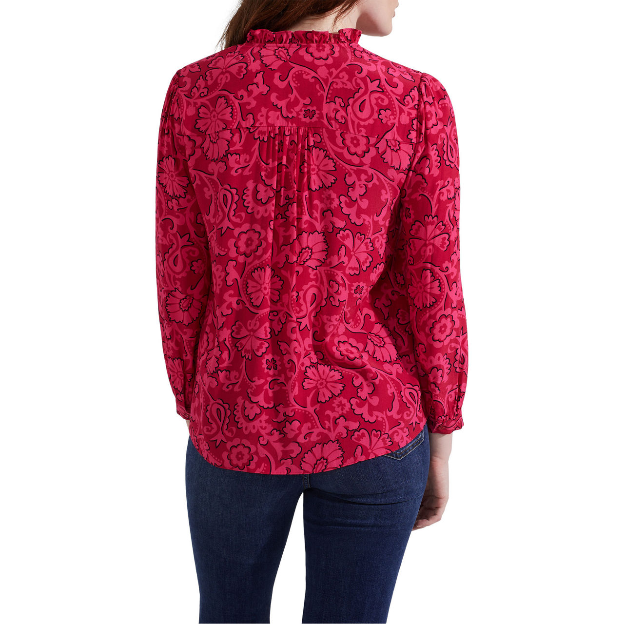 - Ruffle trimmed V-neckline, button fastening, long blouson-style sleeves, paisley print, pleated details at back
