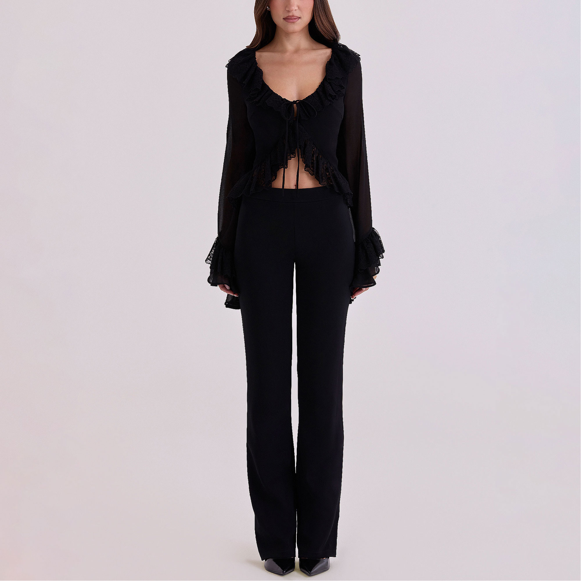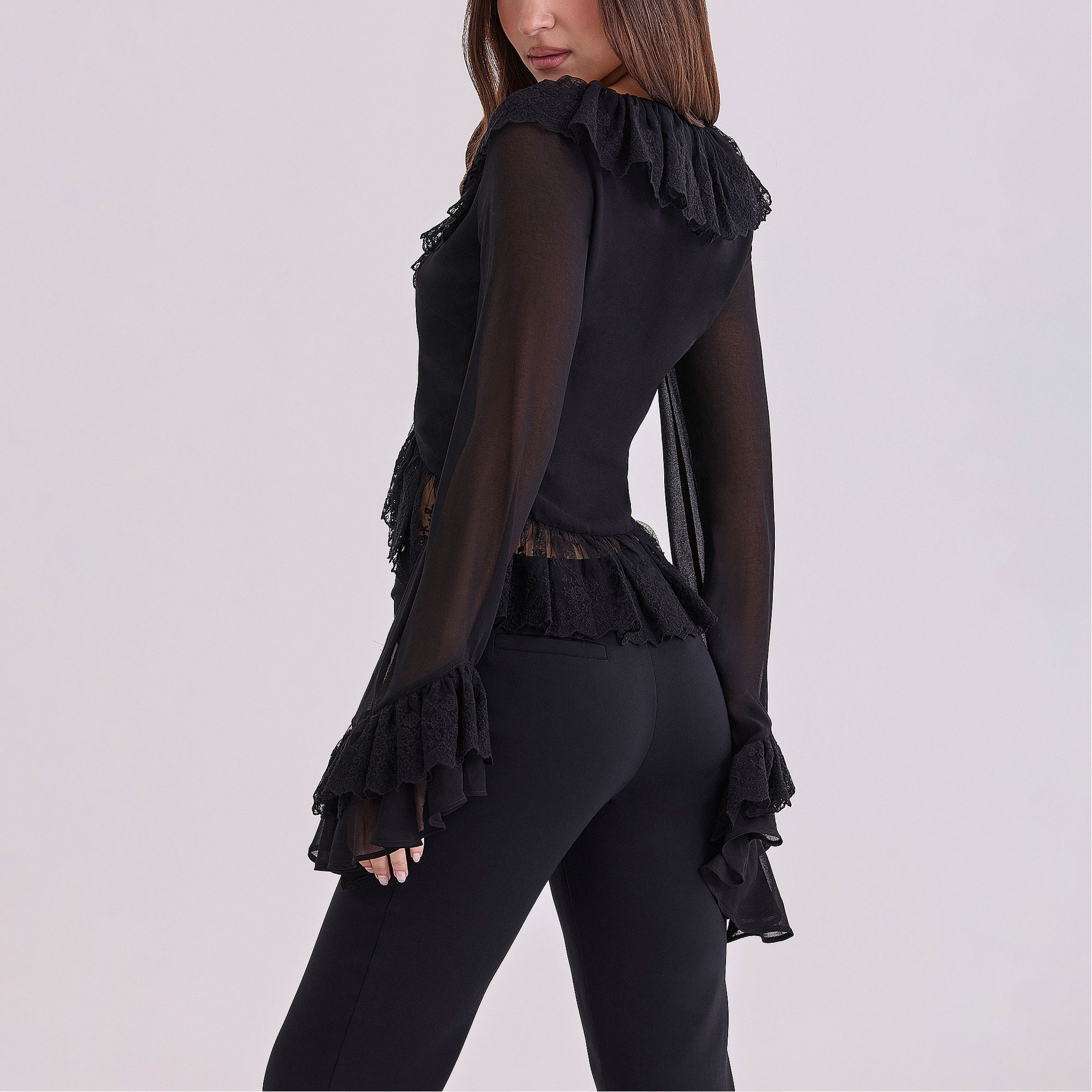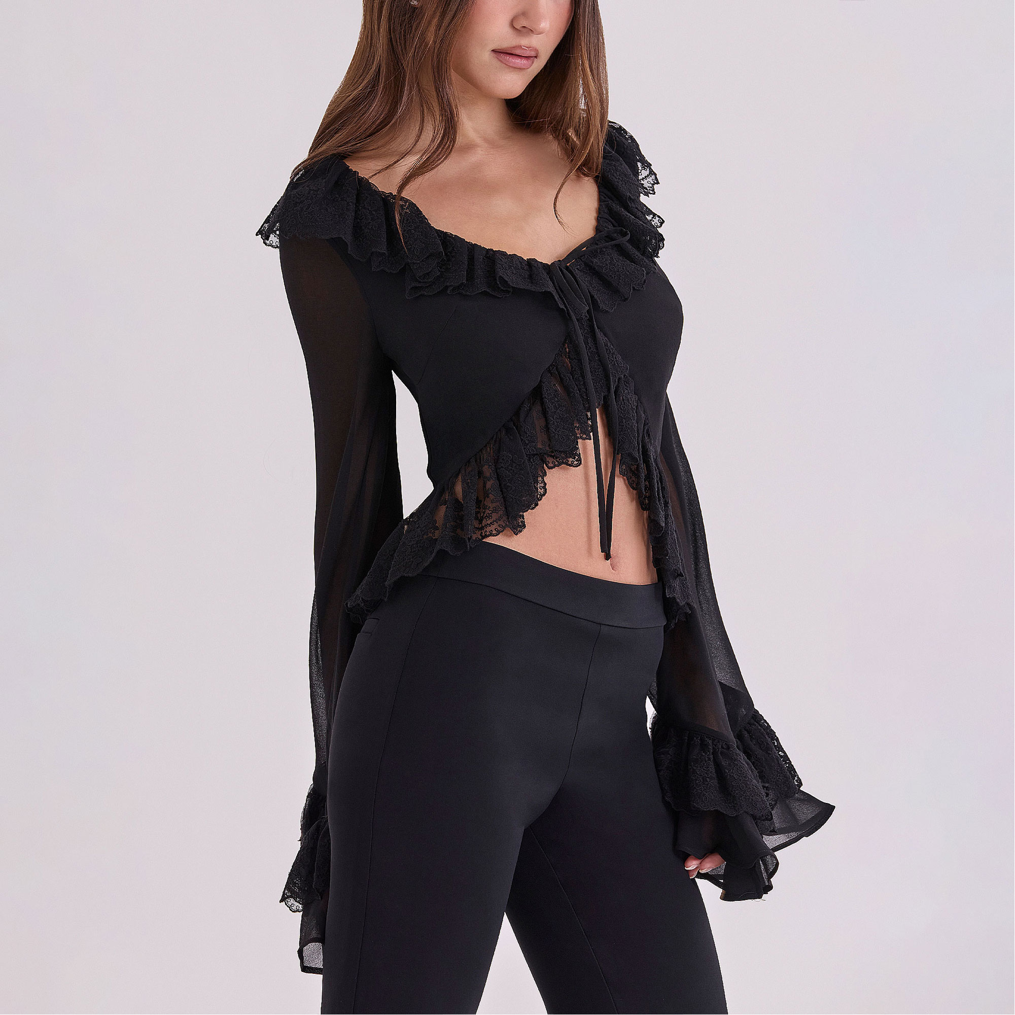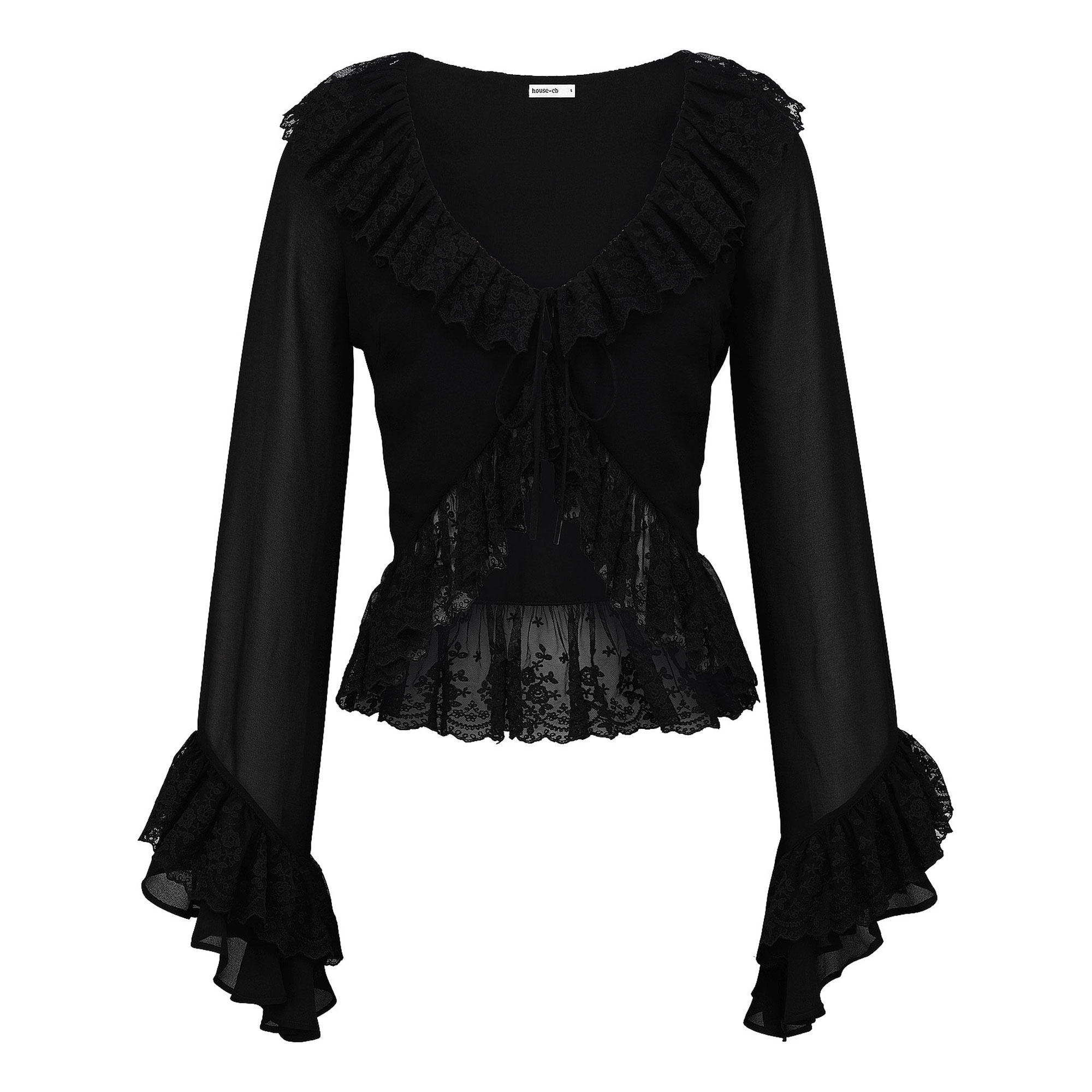 - Textured detailing, long sleeve, floral lace ruffle trims, tie fastening, sleeves