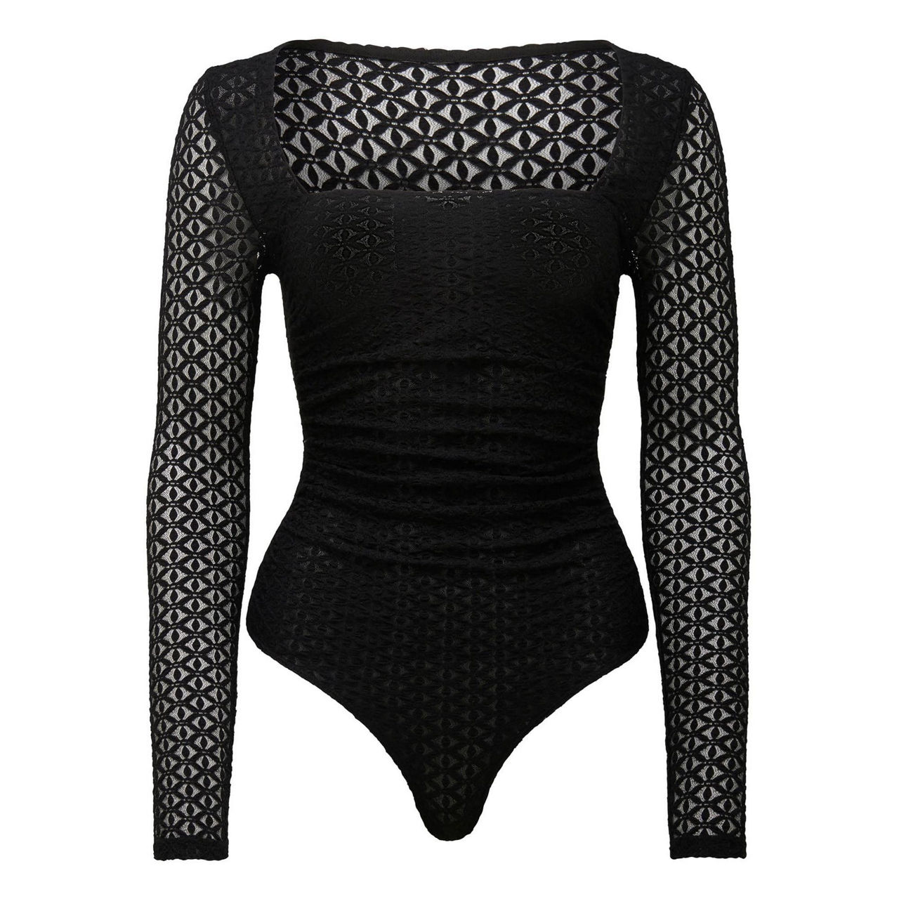- Lace, square neck, soft ruching through the waist, full sleeves, snap button at leg opening