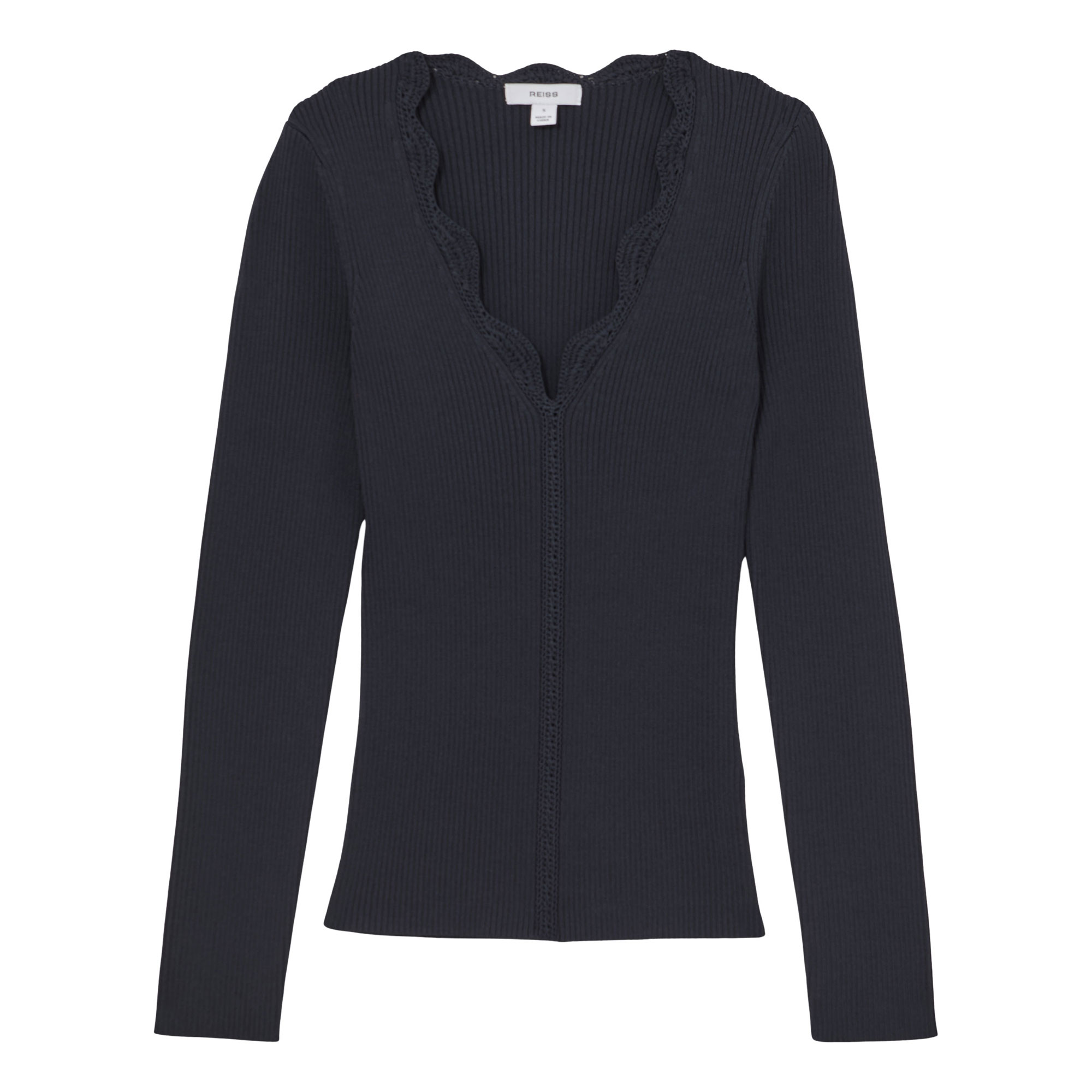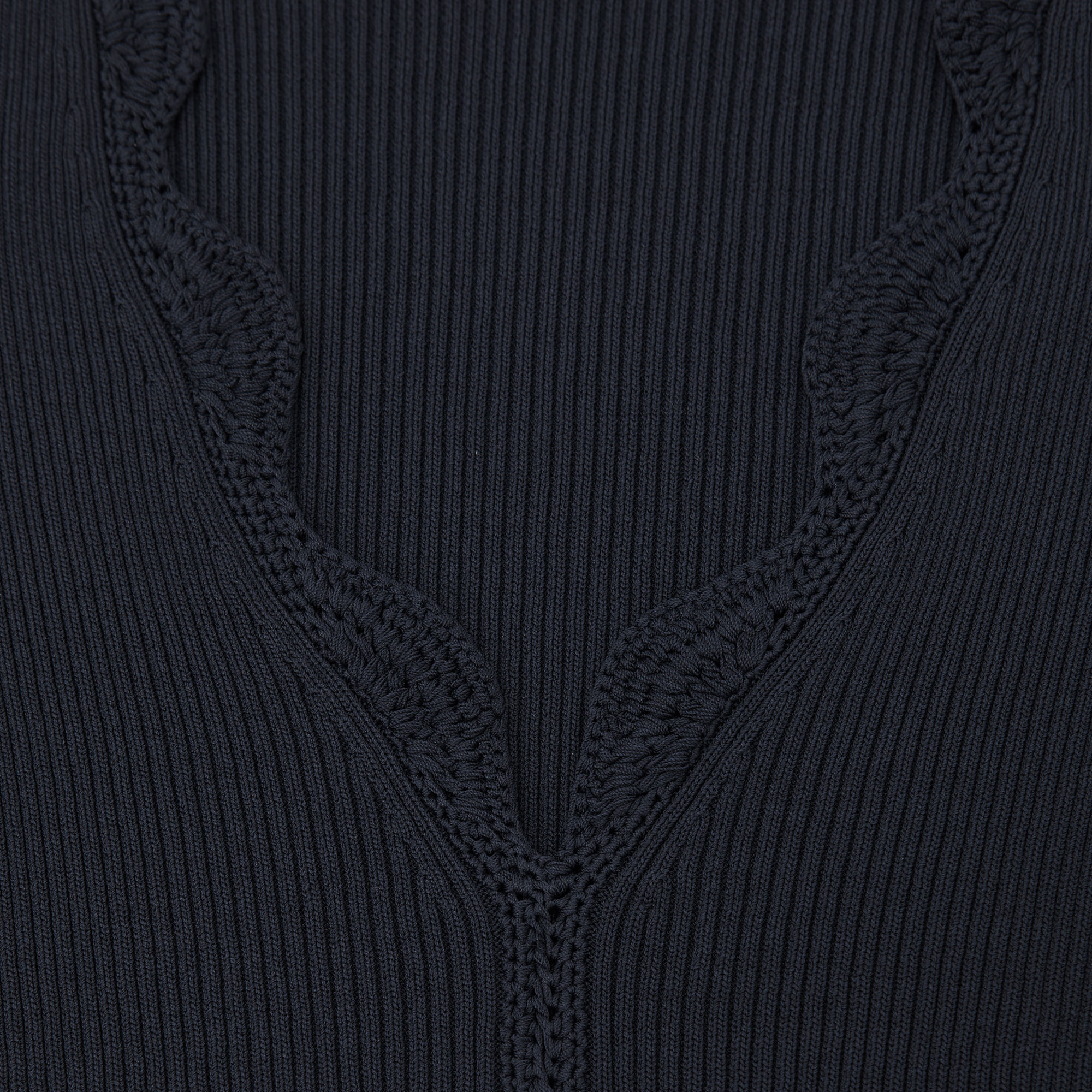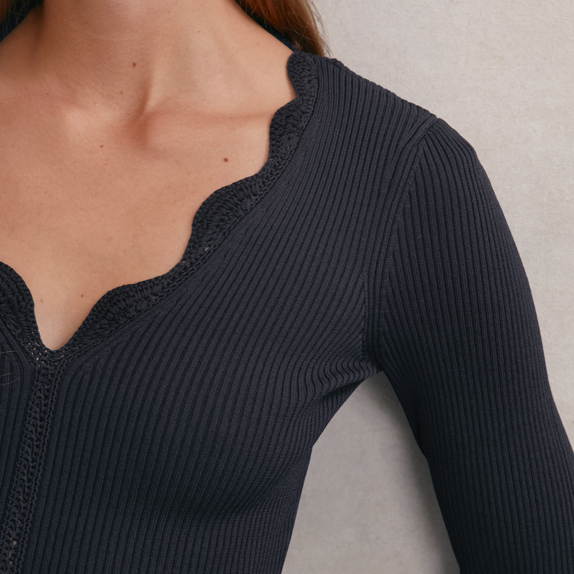- V-neckline with crochet trim, long sleeves, rib-knit construction