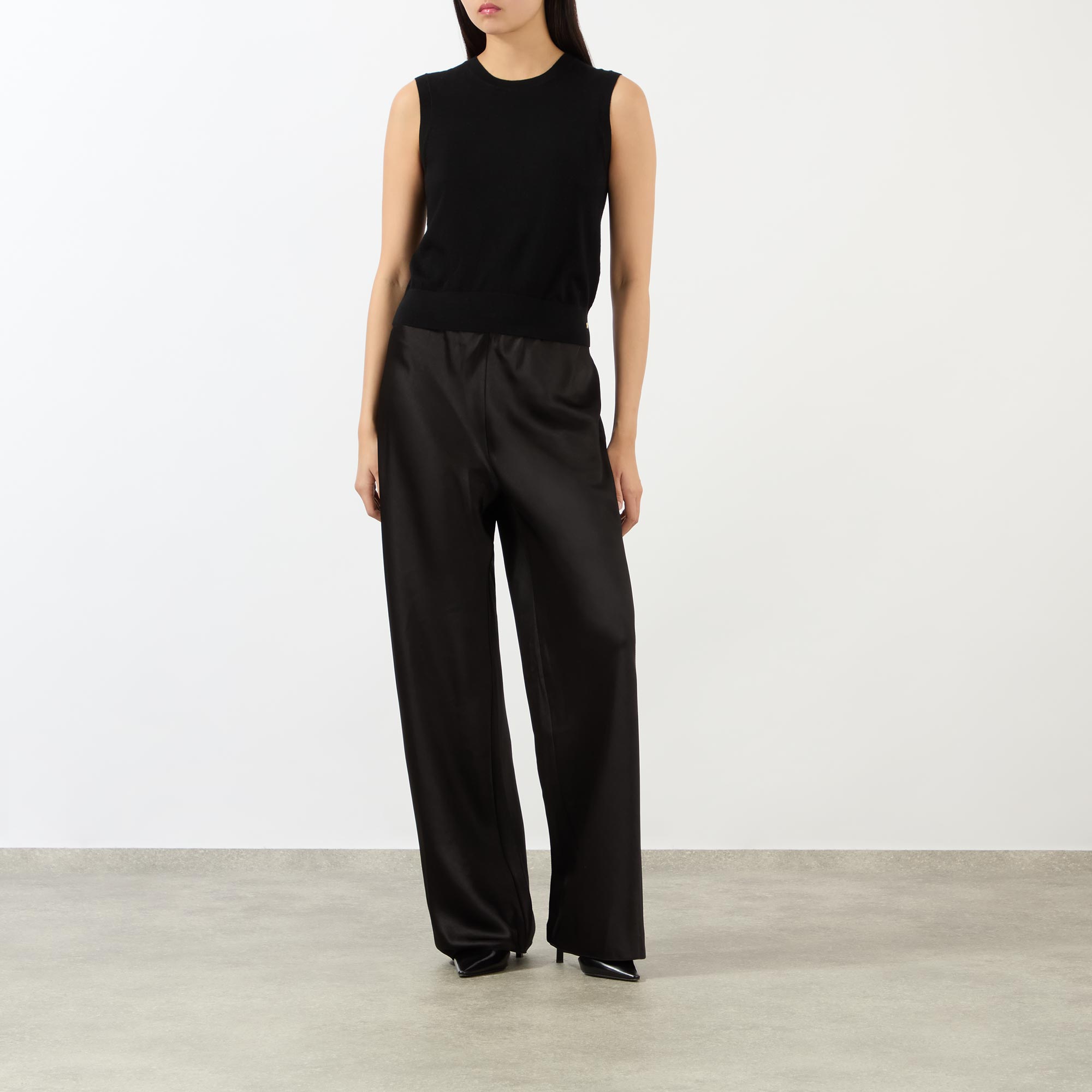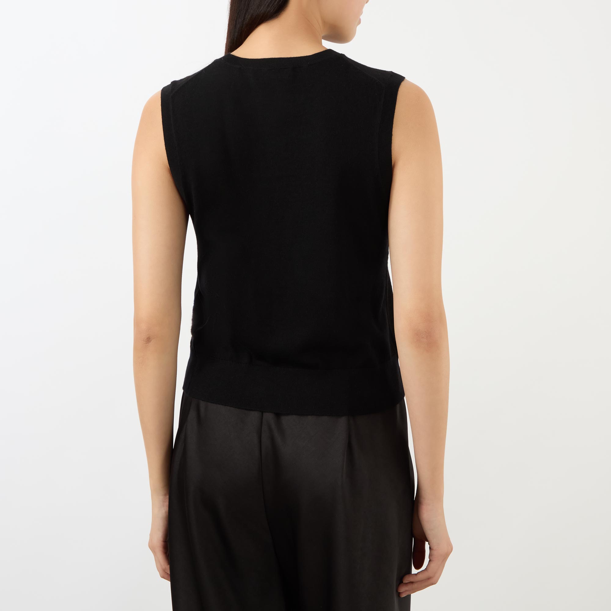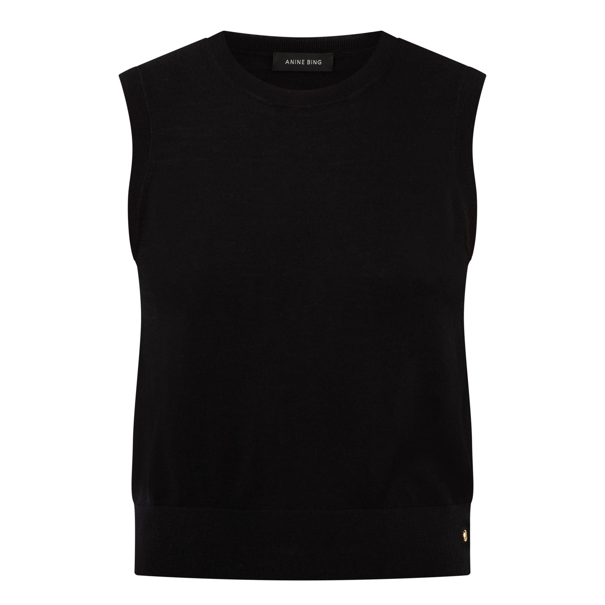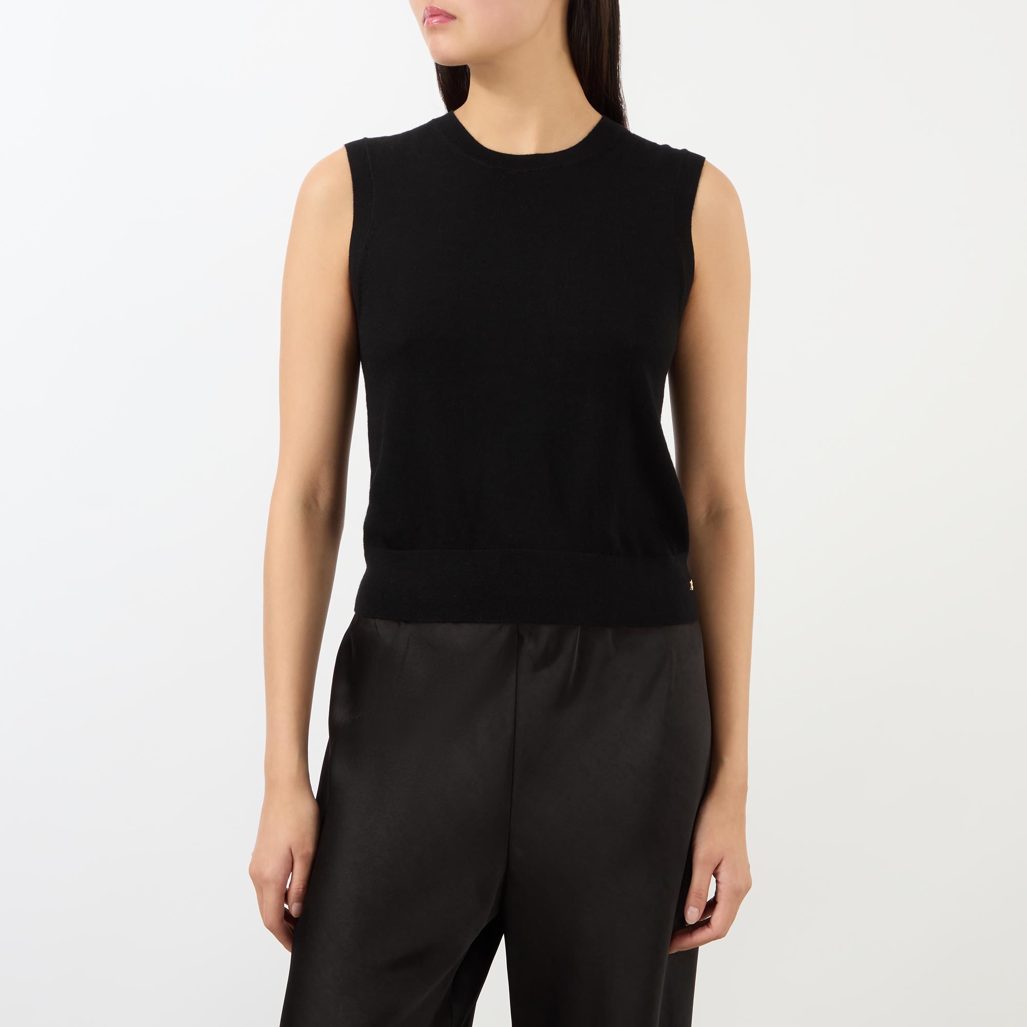 - Round neckline, sleeveless, fine knit structure, ribbed trims, logo hardware detail, straight hemline