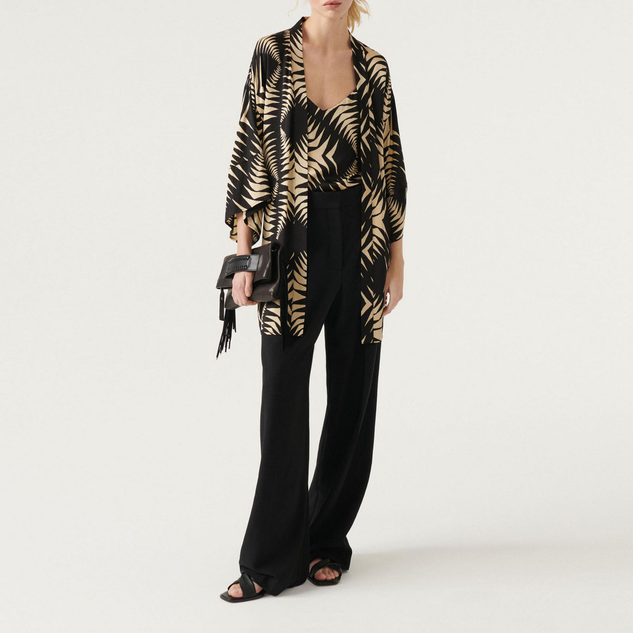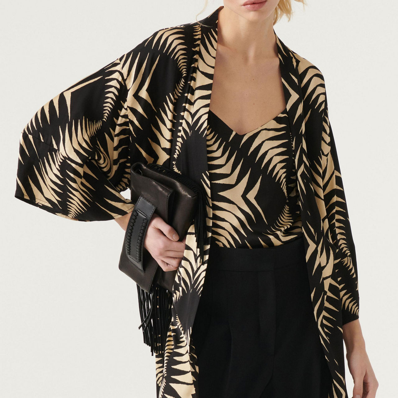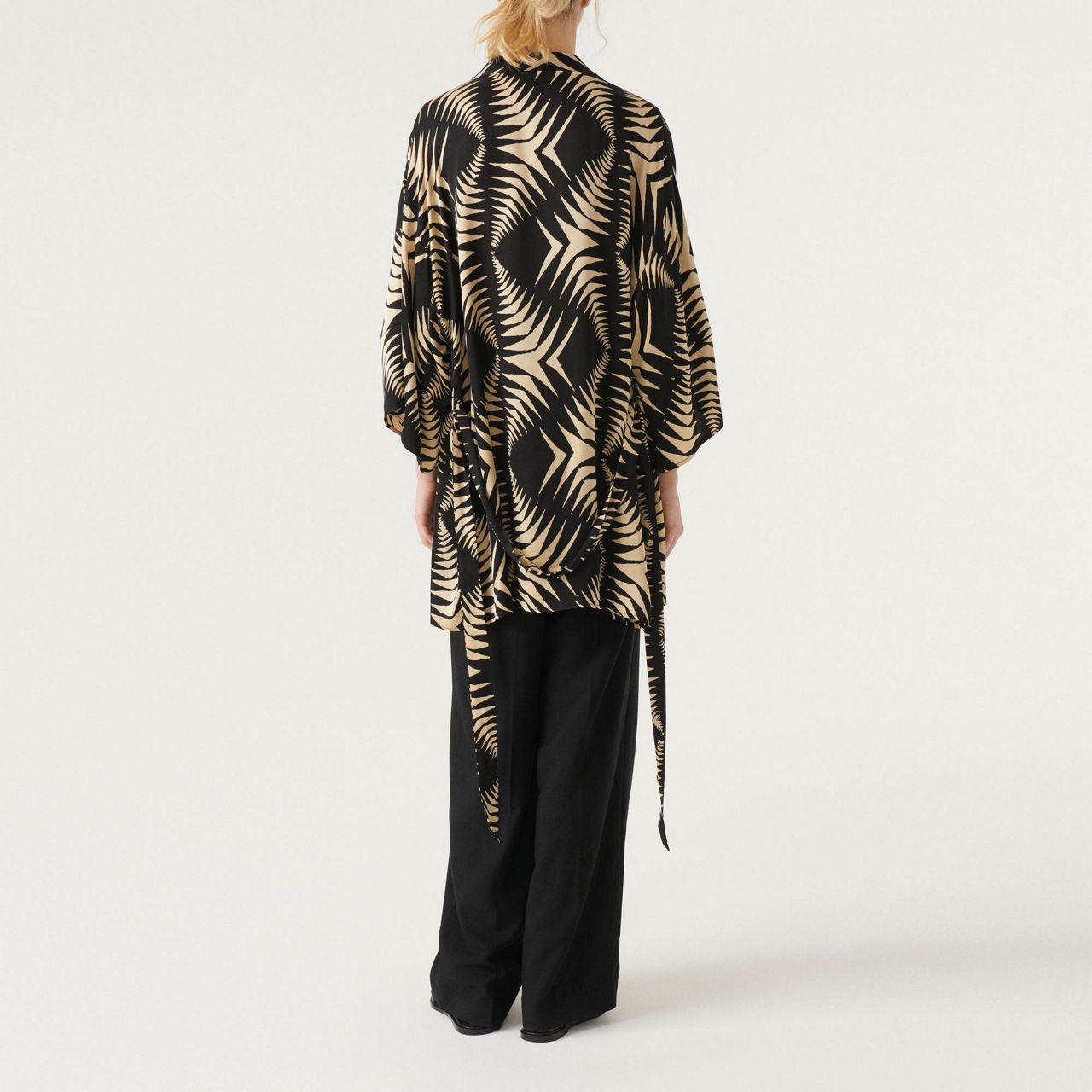The Nigel jacket puts a cool twist on the kimono. This long jacket is inspired by the iconic shape of a kimono with very wide sleeves, drop armholes and a buttonless wrap closure. It can be tied around the waist using the long belt made from the same fabric.