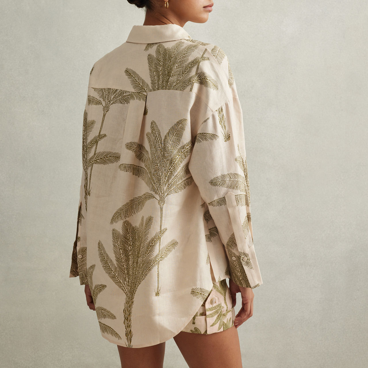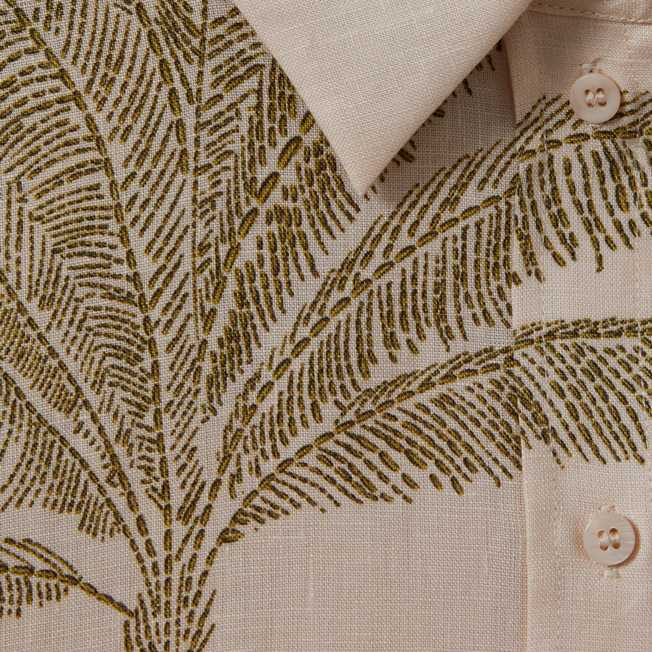 - Front button fastening, long sleeves, collared neckline, lightweight style, tropical palm print, split hem, pleated cuffs, pleated detail to the back, buttoned cuffs