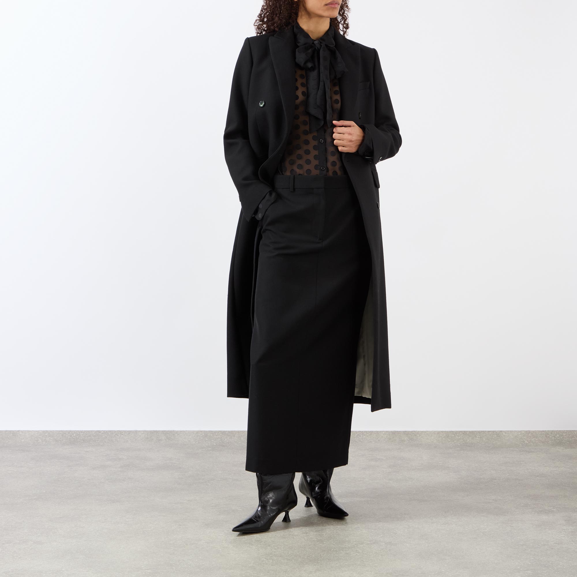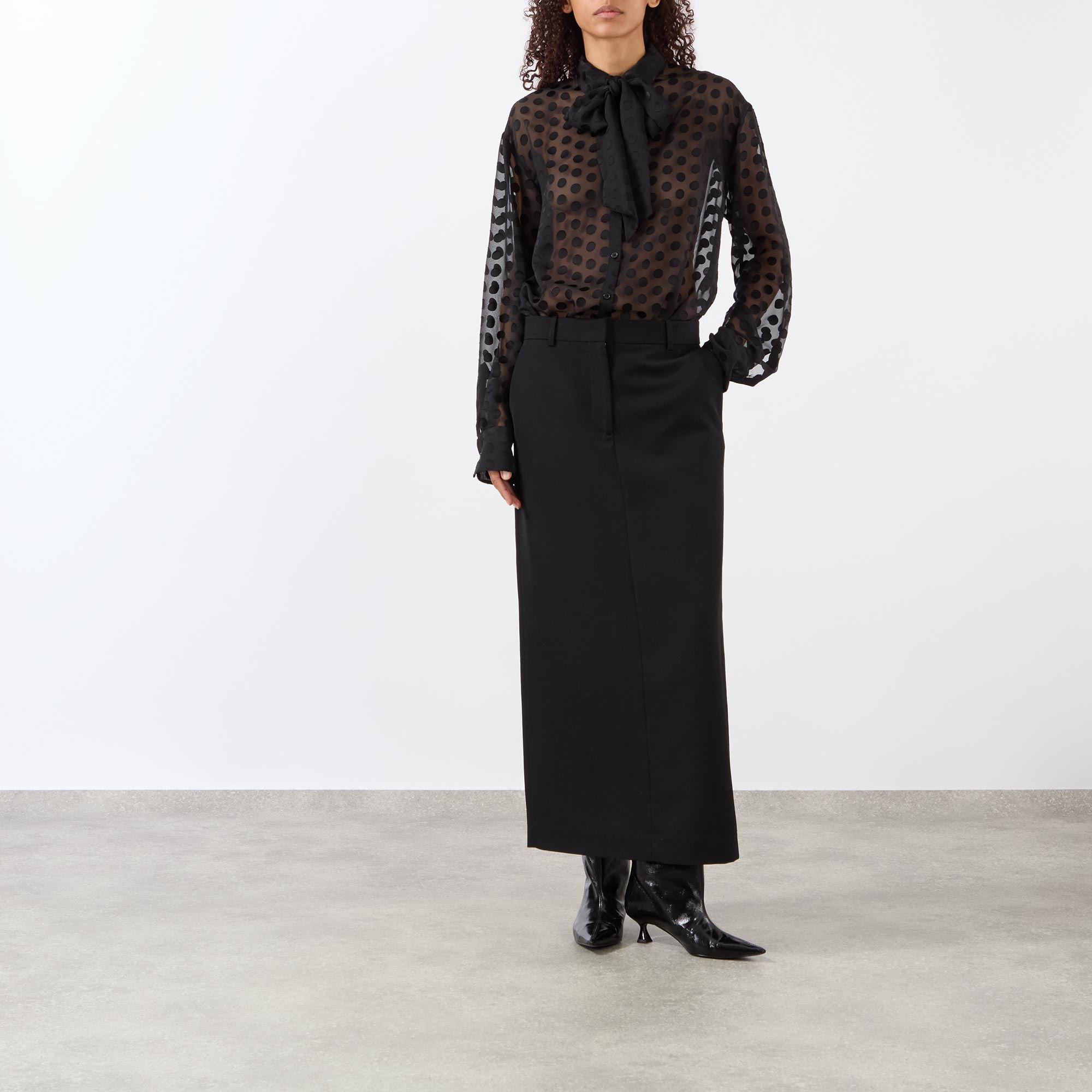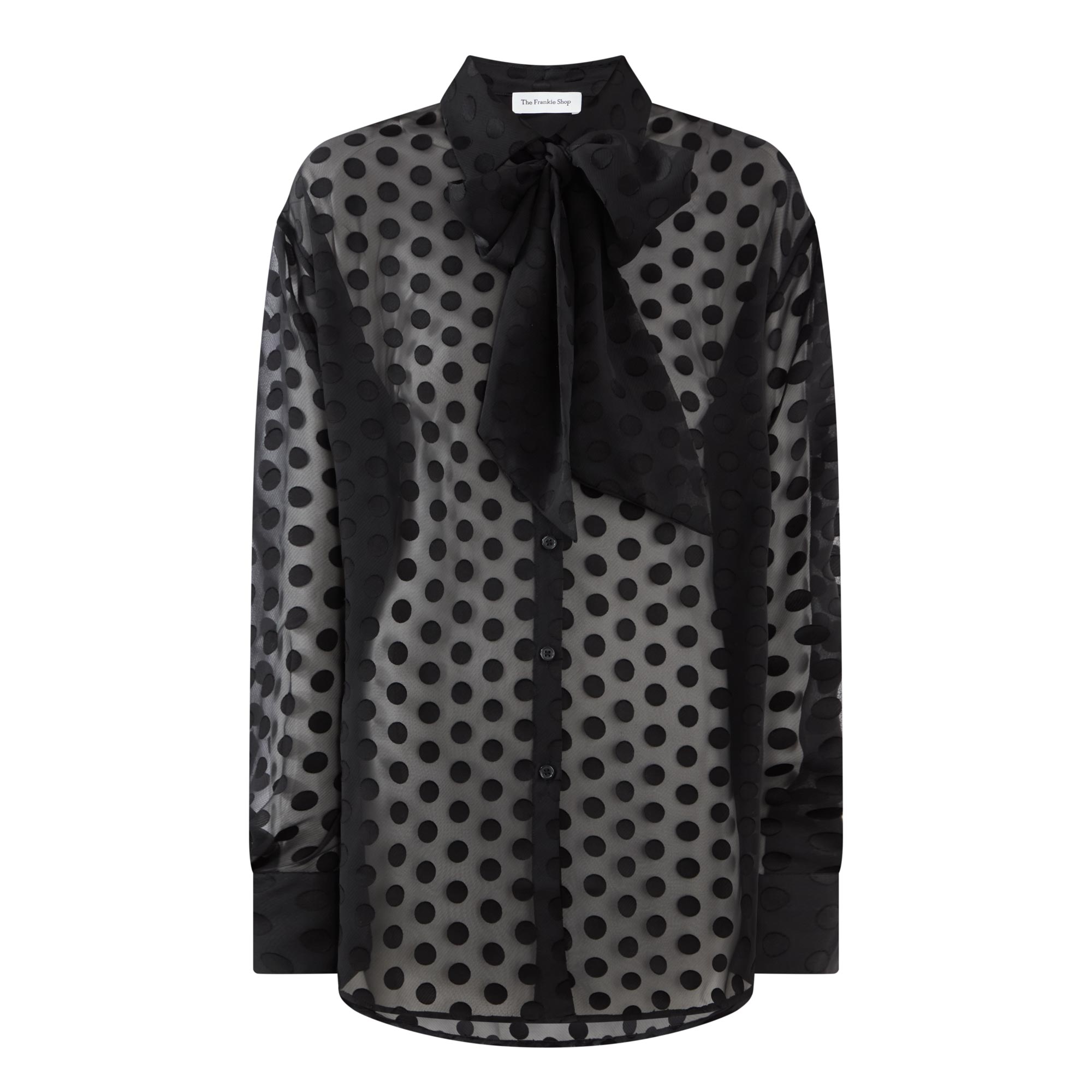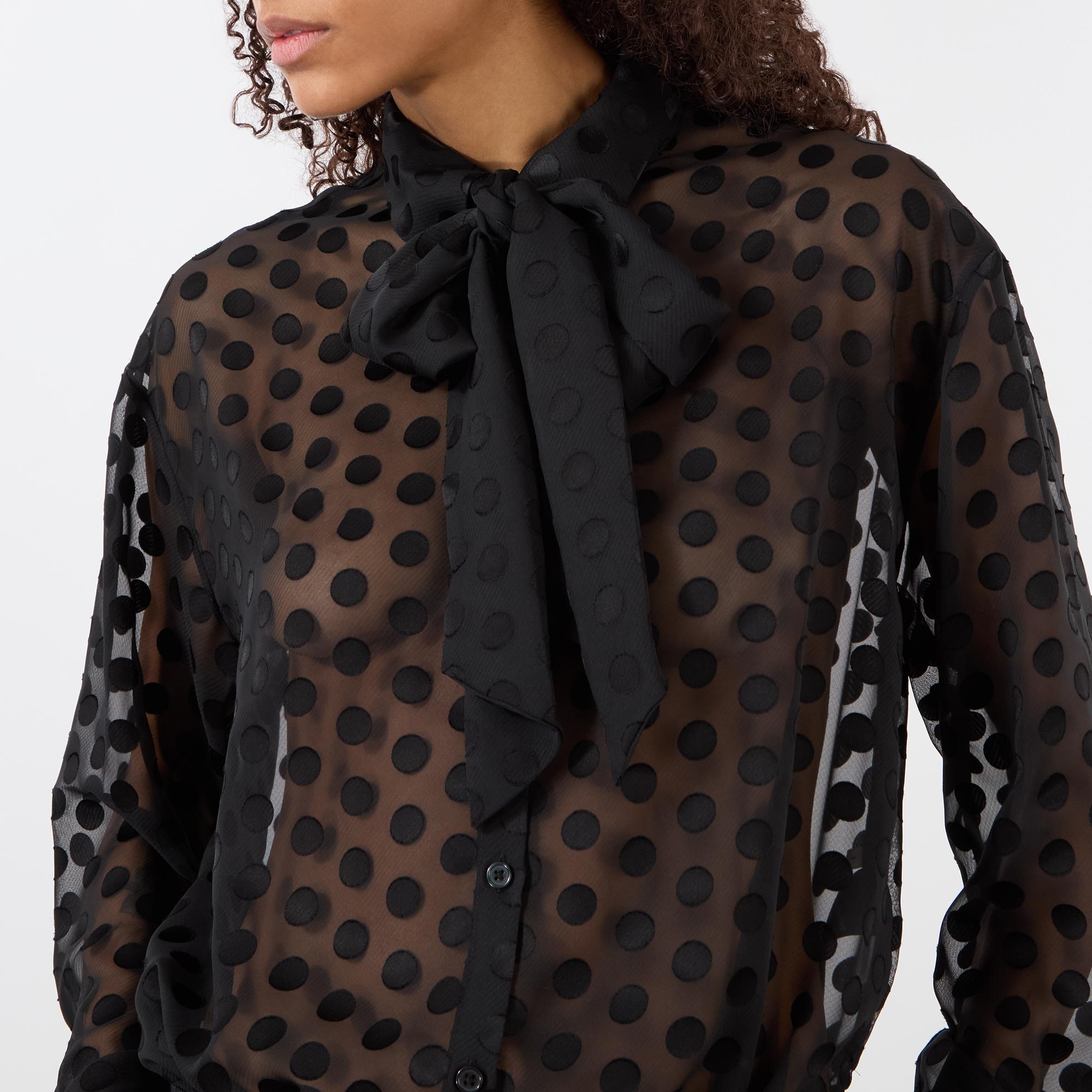 - Point collar, scarf tie fastenings, dropped shoulders, long sleeves, buttoned cuffs, front button fastening, curved hem, tonal stitching, textured polka dot design, semi-sheer finish