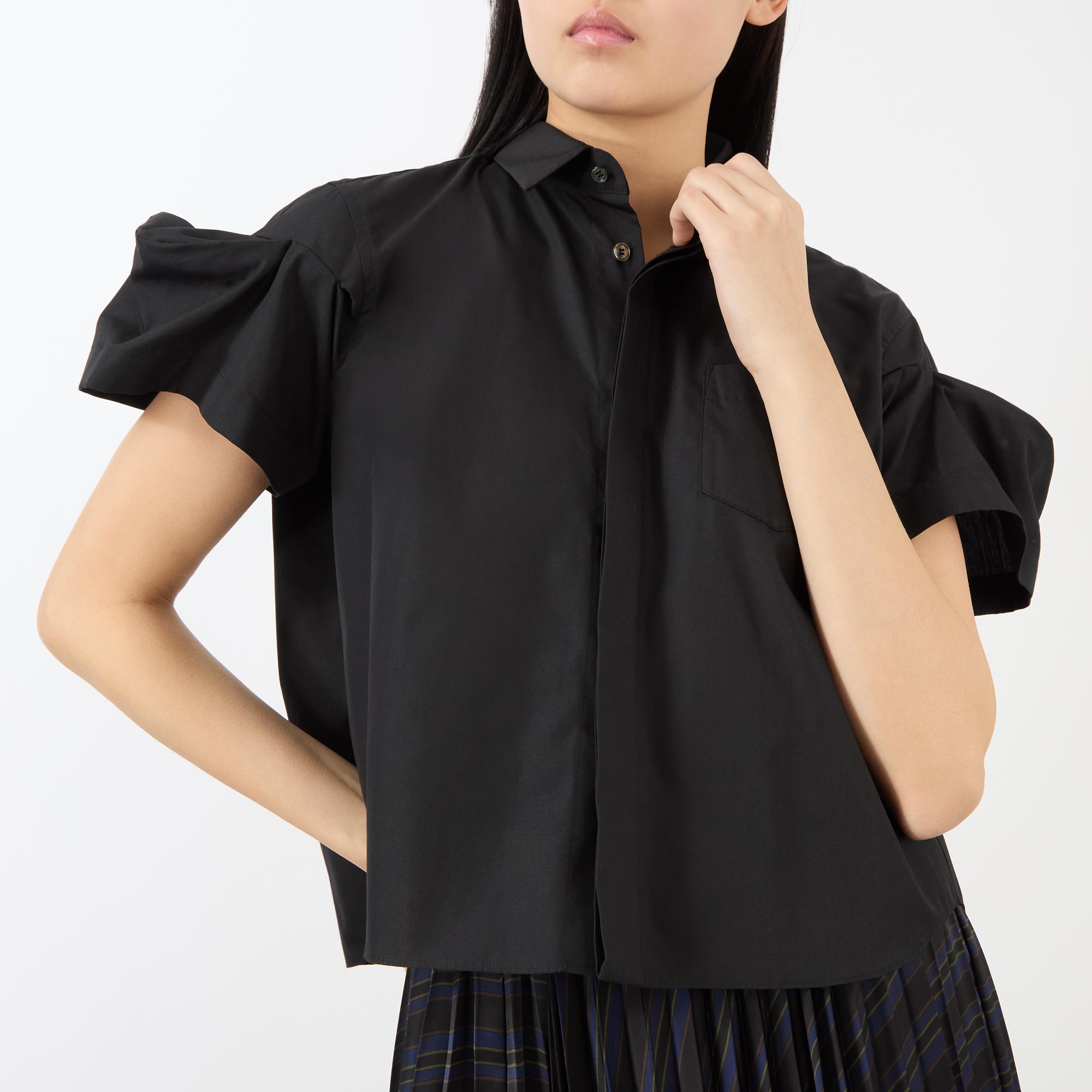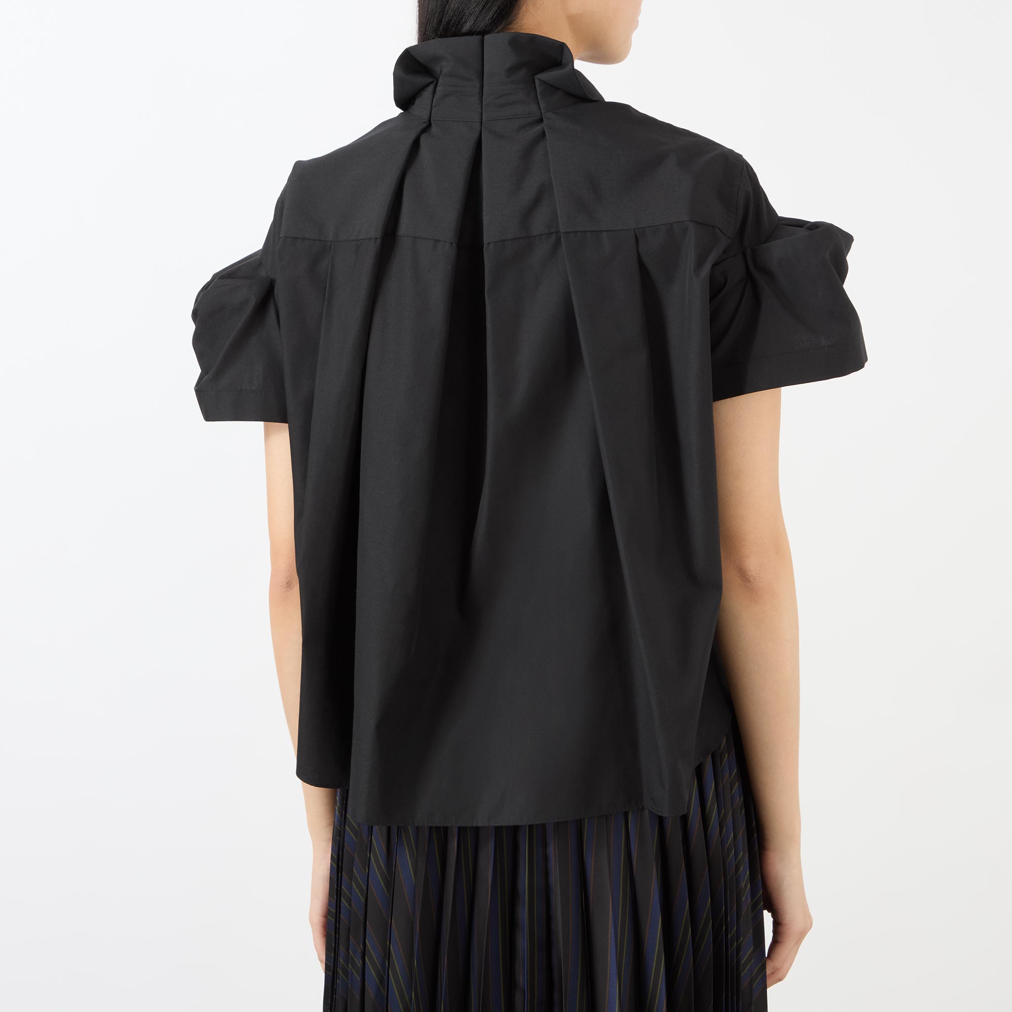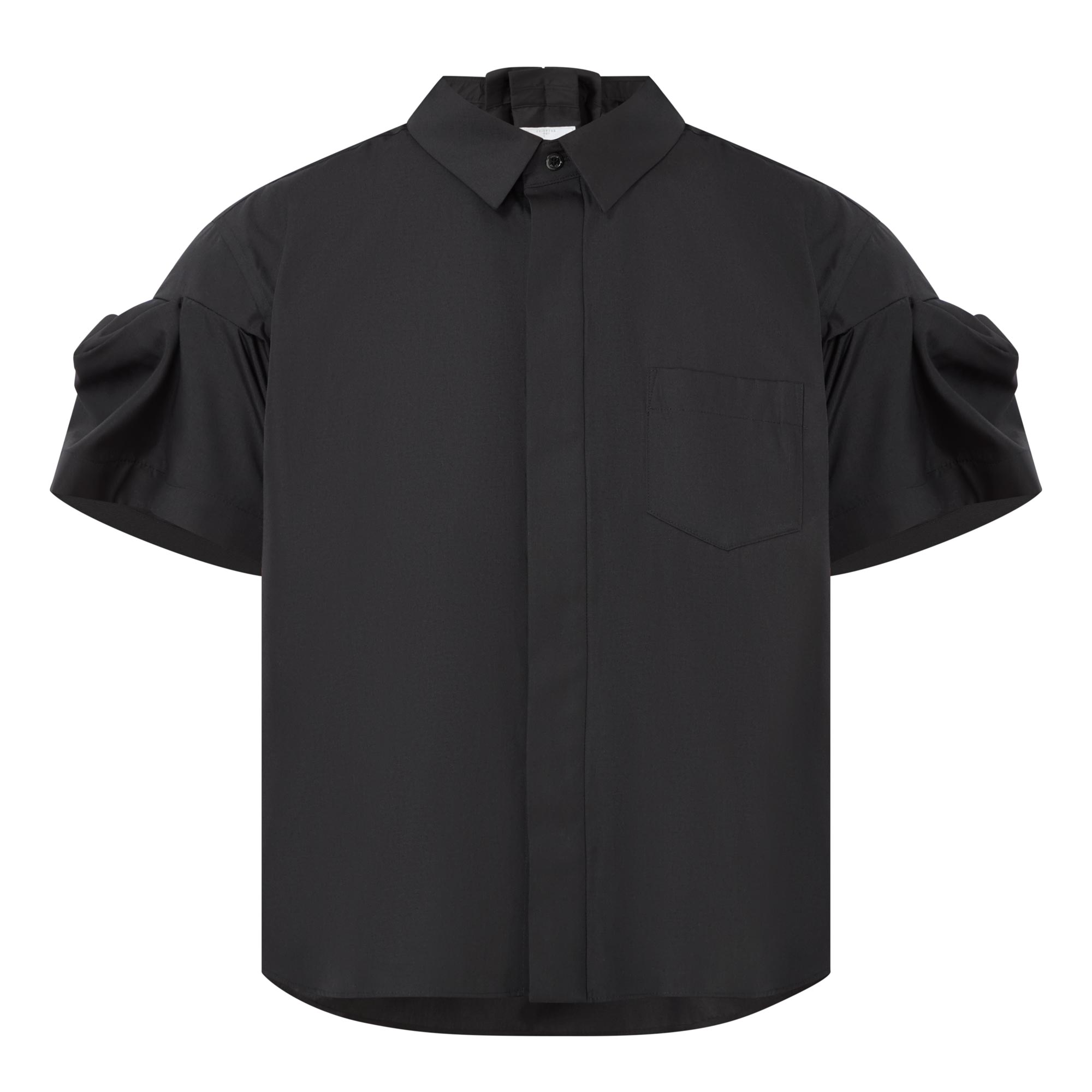 Tailored silhouettes elevated with subtle details fill the SS26 collection by Sacai, seen in the design of this shirt. Cut from a poplin-blend fabric, it features a structured collar that stands to the back before folding into a classic shape to the front, finished with puff sleeves.