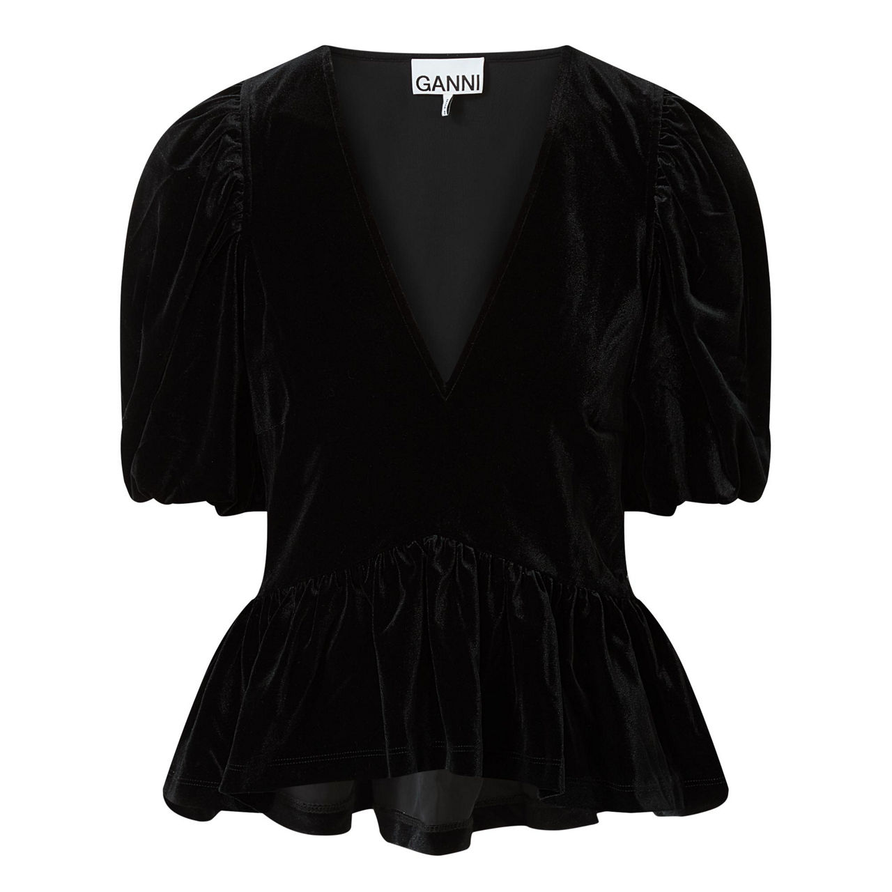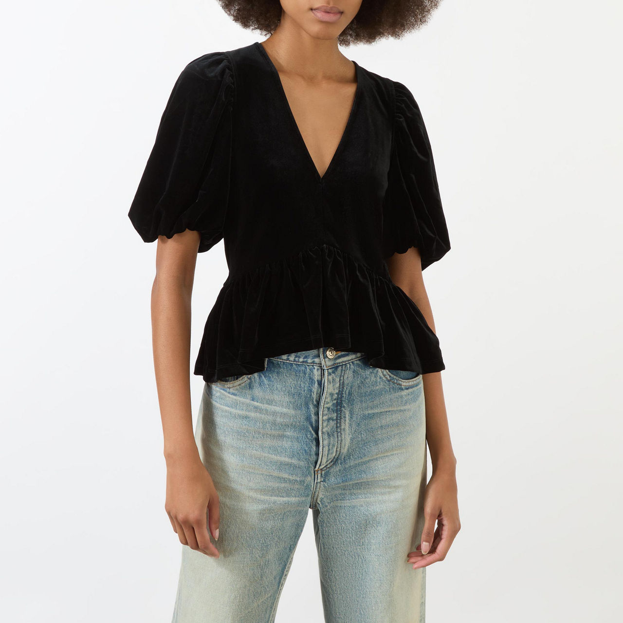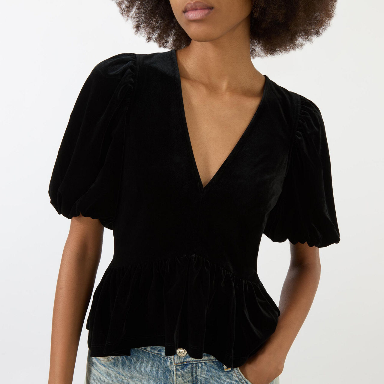 - V-neck, short puff sleeves, elasticated cuffs, flounce hem, velvet finish