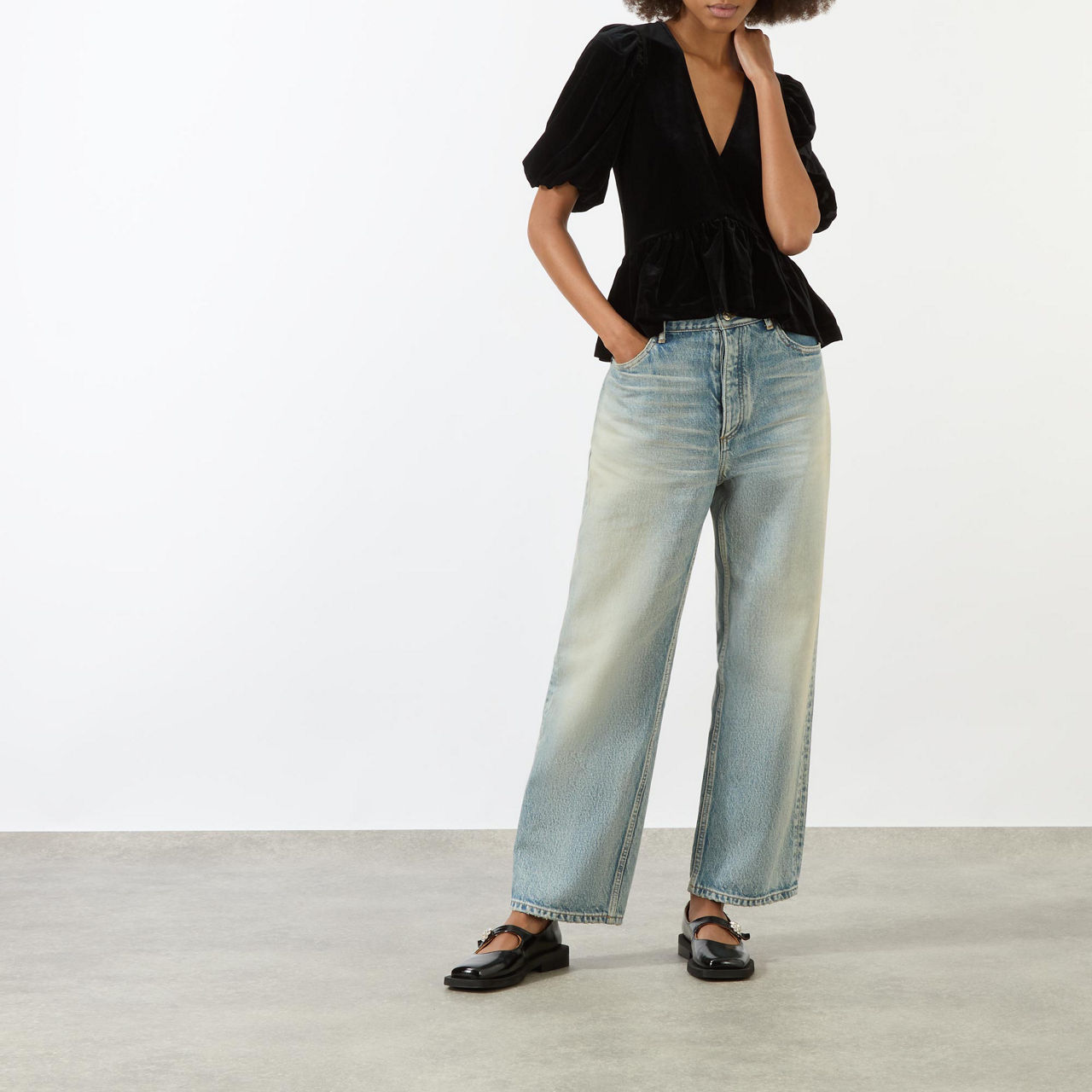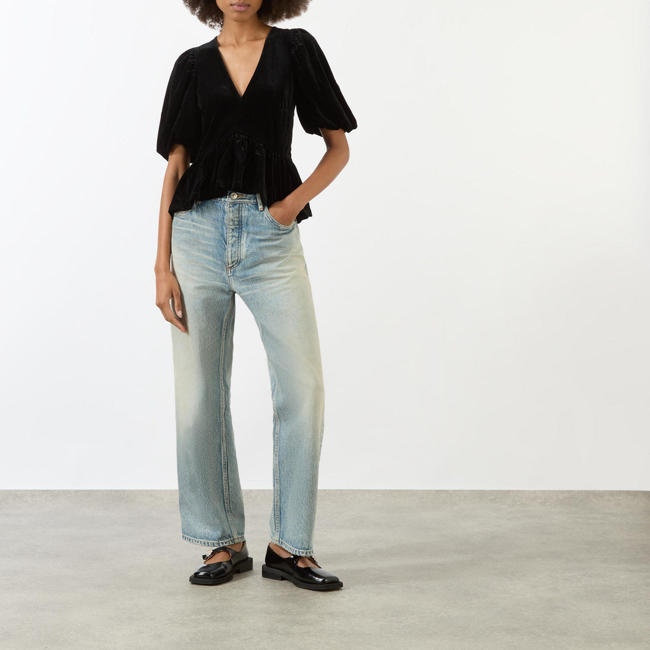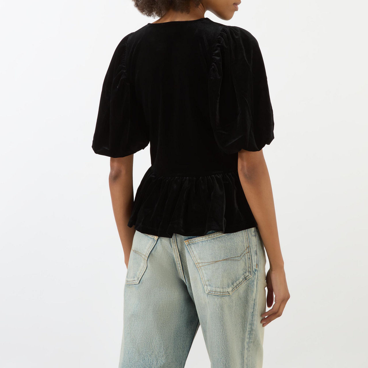 - V-neck, short puff sleeves, elasticated cuffs, flounce hem, velvet finish
