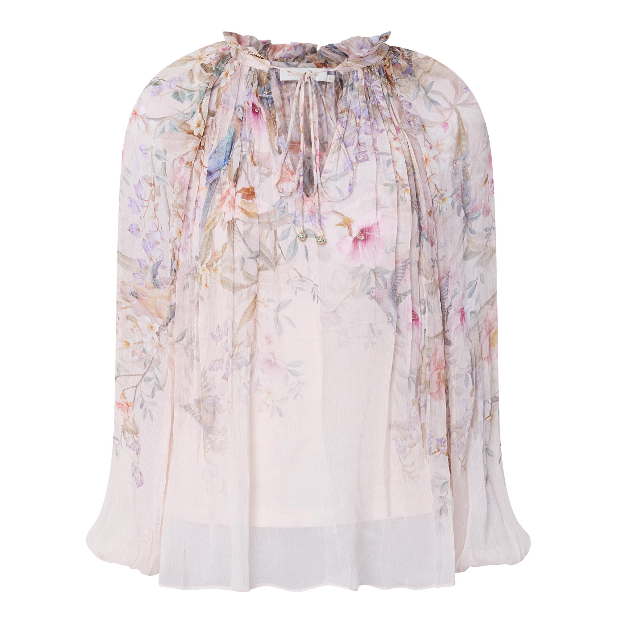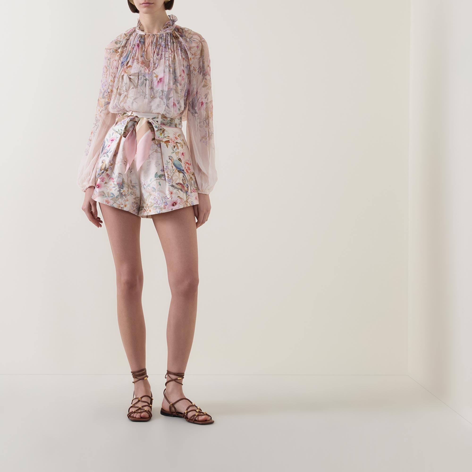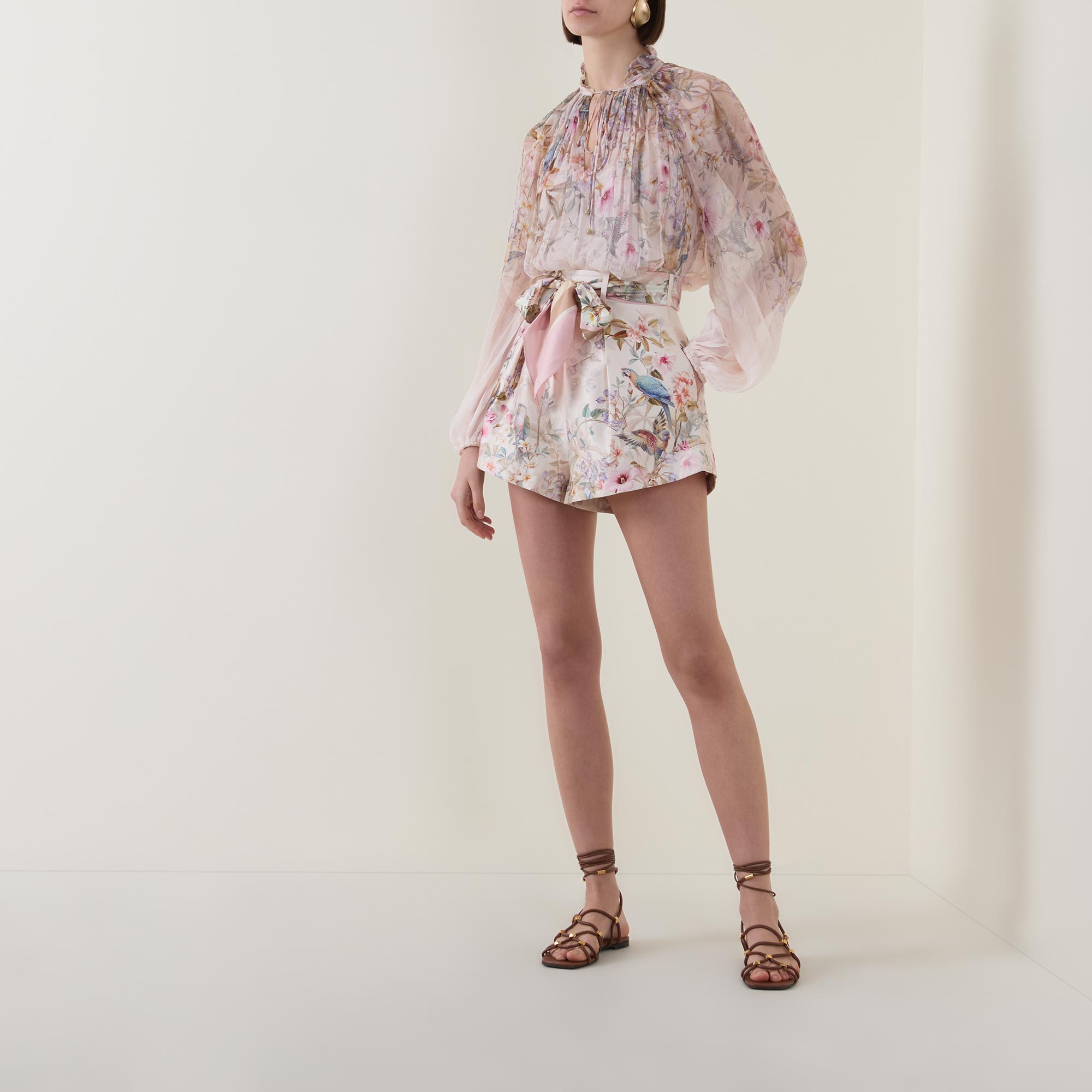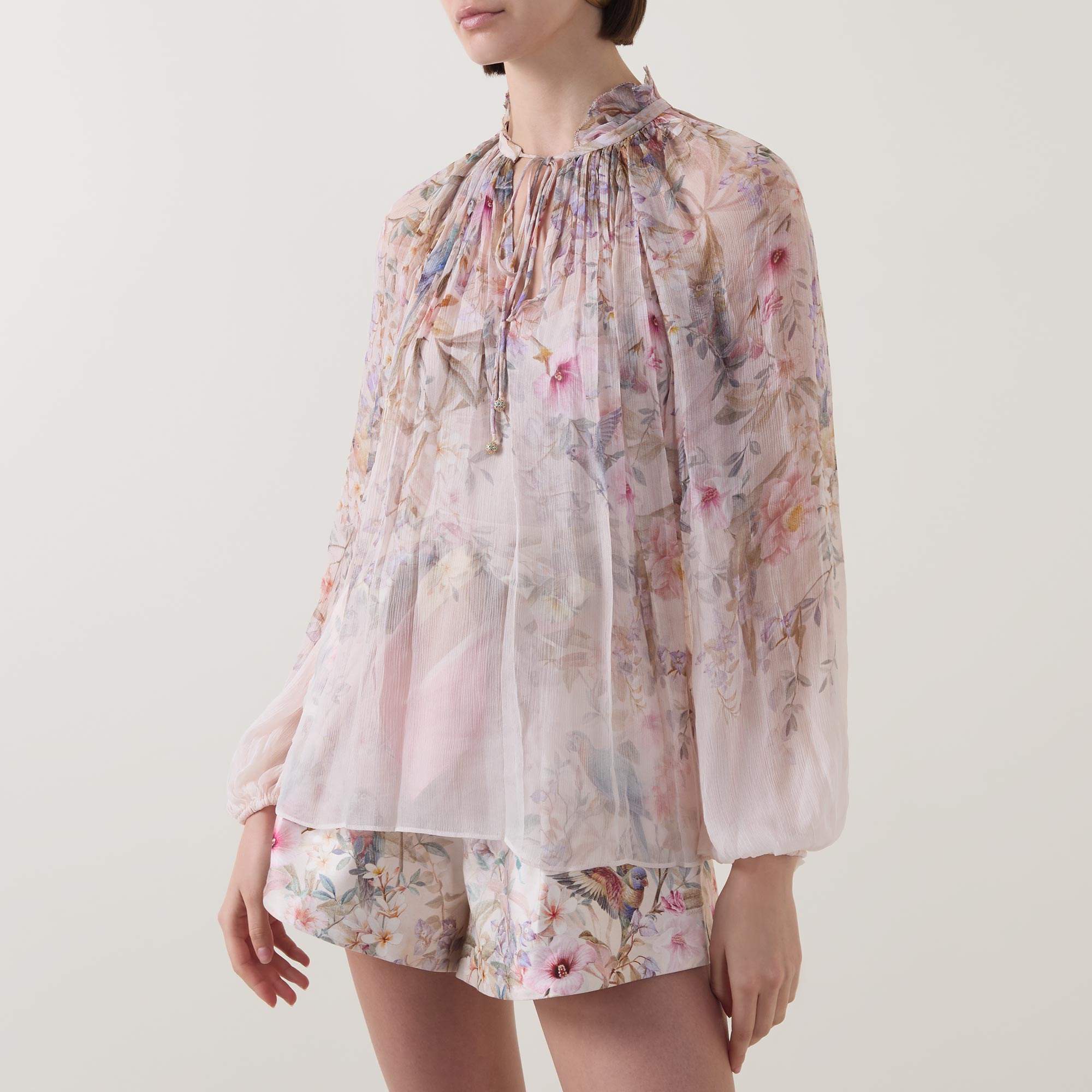 Zimmermann’s Twisted Romance Cruise 2026 collection celebrates feminine florals and airy silhouettes that balance structure with effortless ease, perfectly embodied by the Rebellion blouse. Designed with a soft, floating shape and long, billowing sleeves, it features a stand collar with a keyhole opening and tie-fastening neckline. The floral print enhances its romantic appeal, while elasticated cuffs ensure a comfortable, flexible fit.