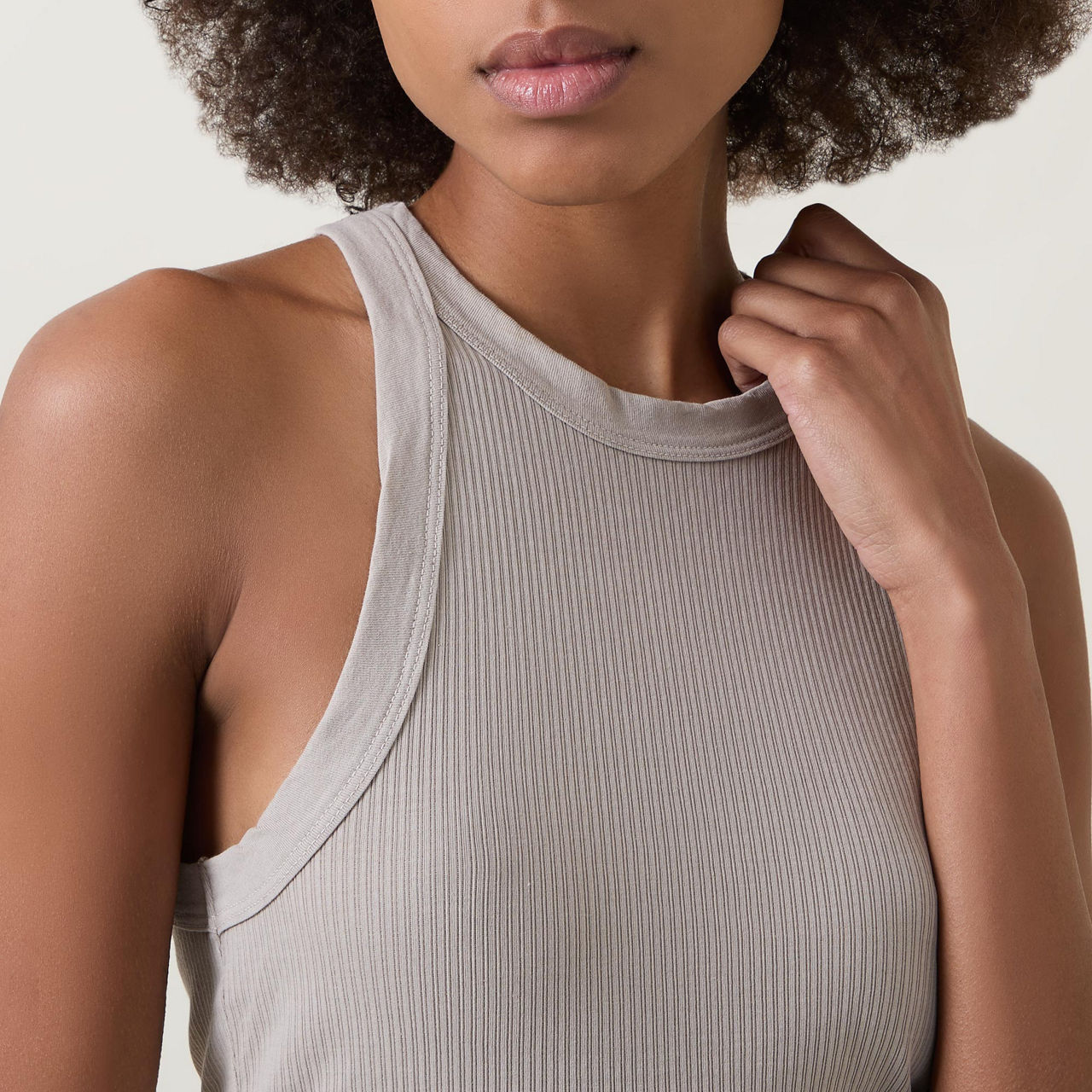 - Bold cut-away armholes, crew neckline, sleeveless, tonal stitching, straight hemline, ribbed fabric