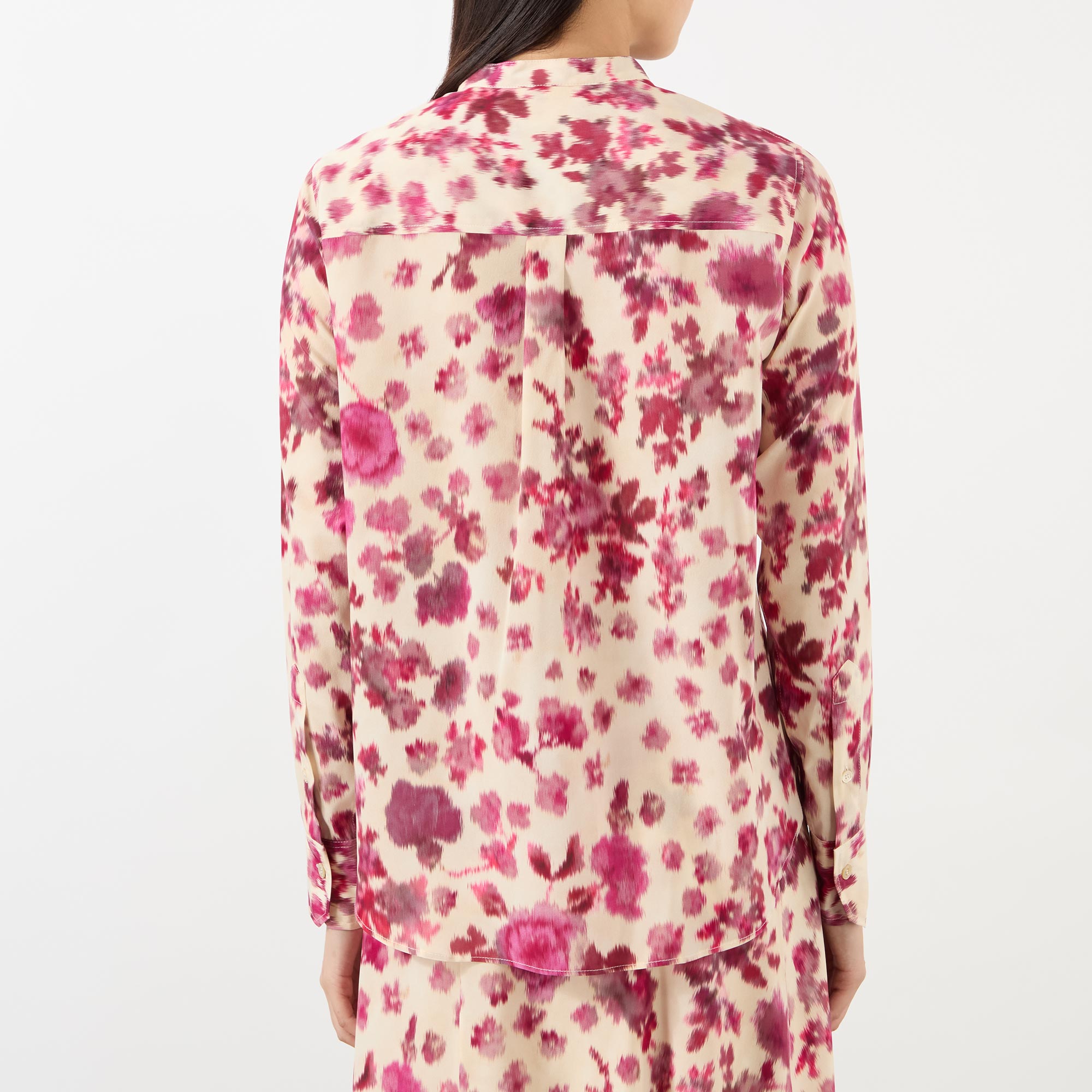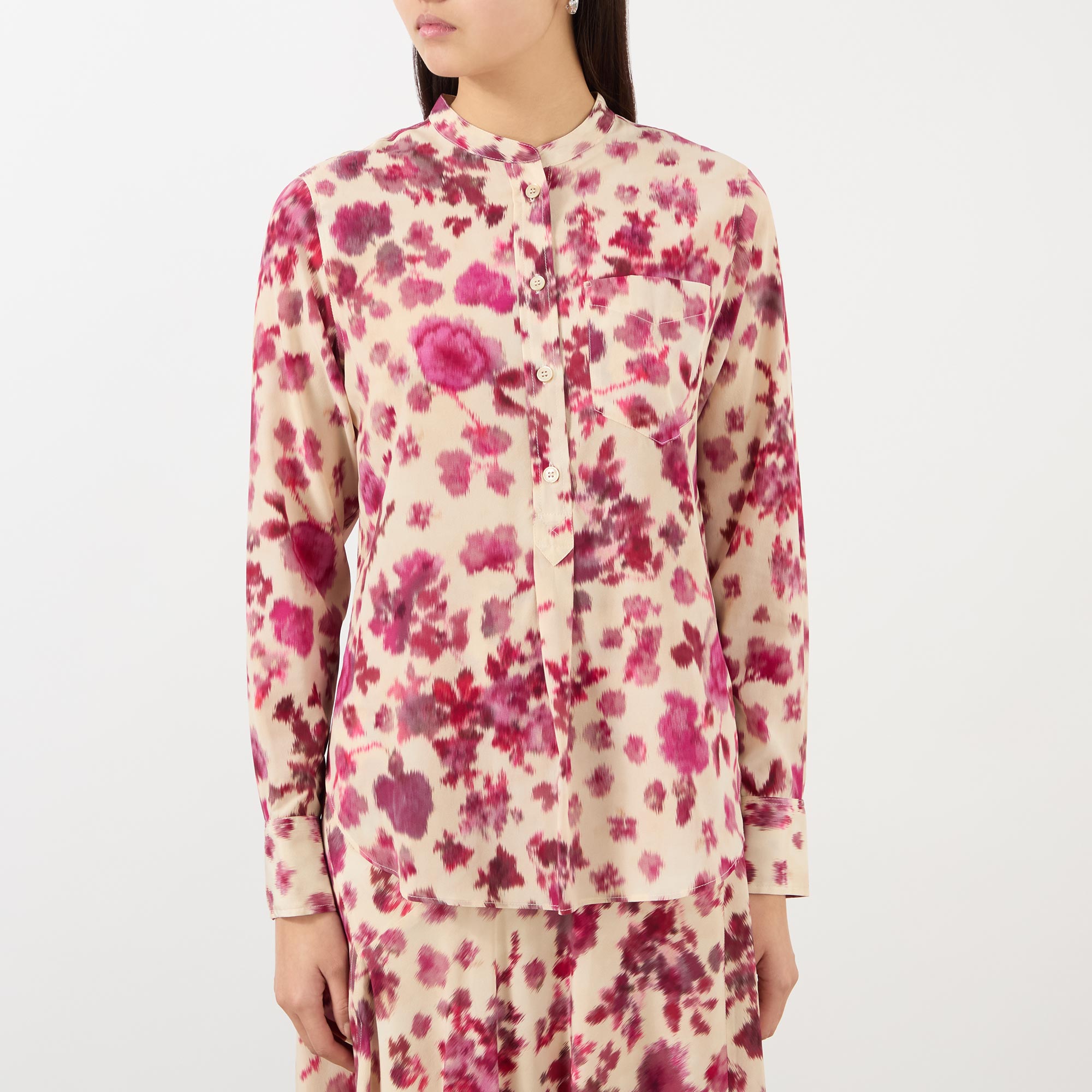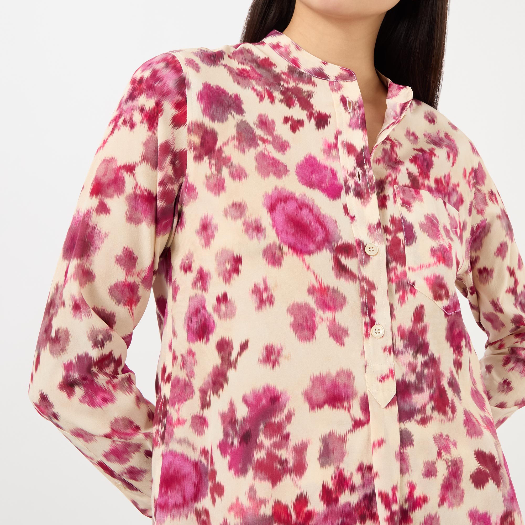 - Mandarin collar, long sleeves, front button placket, chest patch pocket, floral pattern, single-button cuffs, back box pleat, curved hemline, smooth silk finish