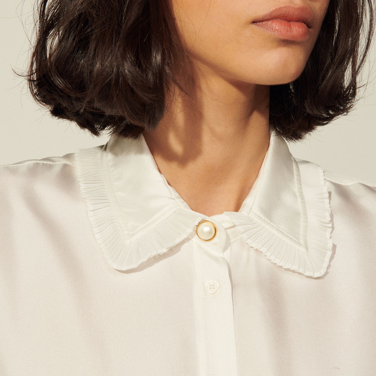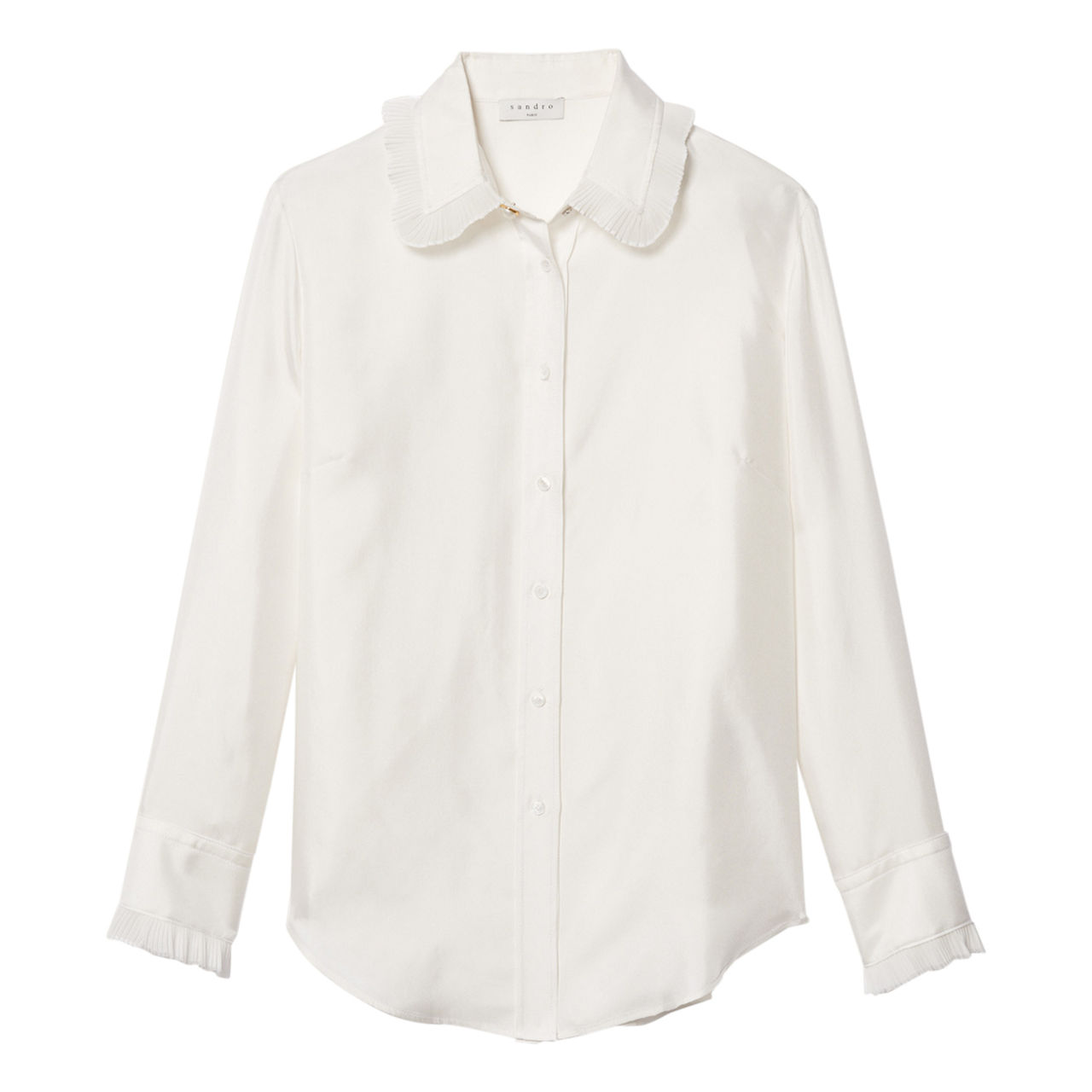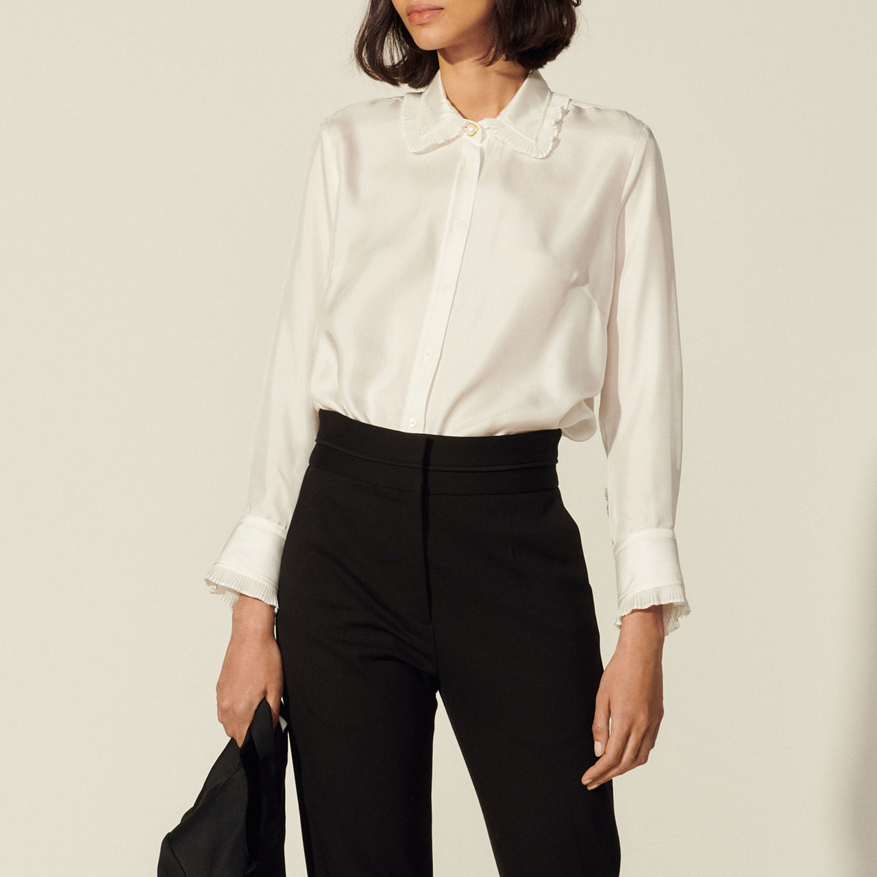 Look and feel flawless in this beautiful silk blouse from Parisian label, Sandro. Cut from silk to a classic fit, it features pretty pleating detail at the collar and cuffs, while it's finished with a pearl button. Team with tailored trousers and pointed flats for a sharp finish.