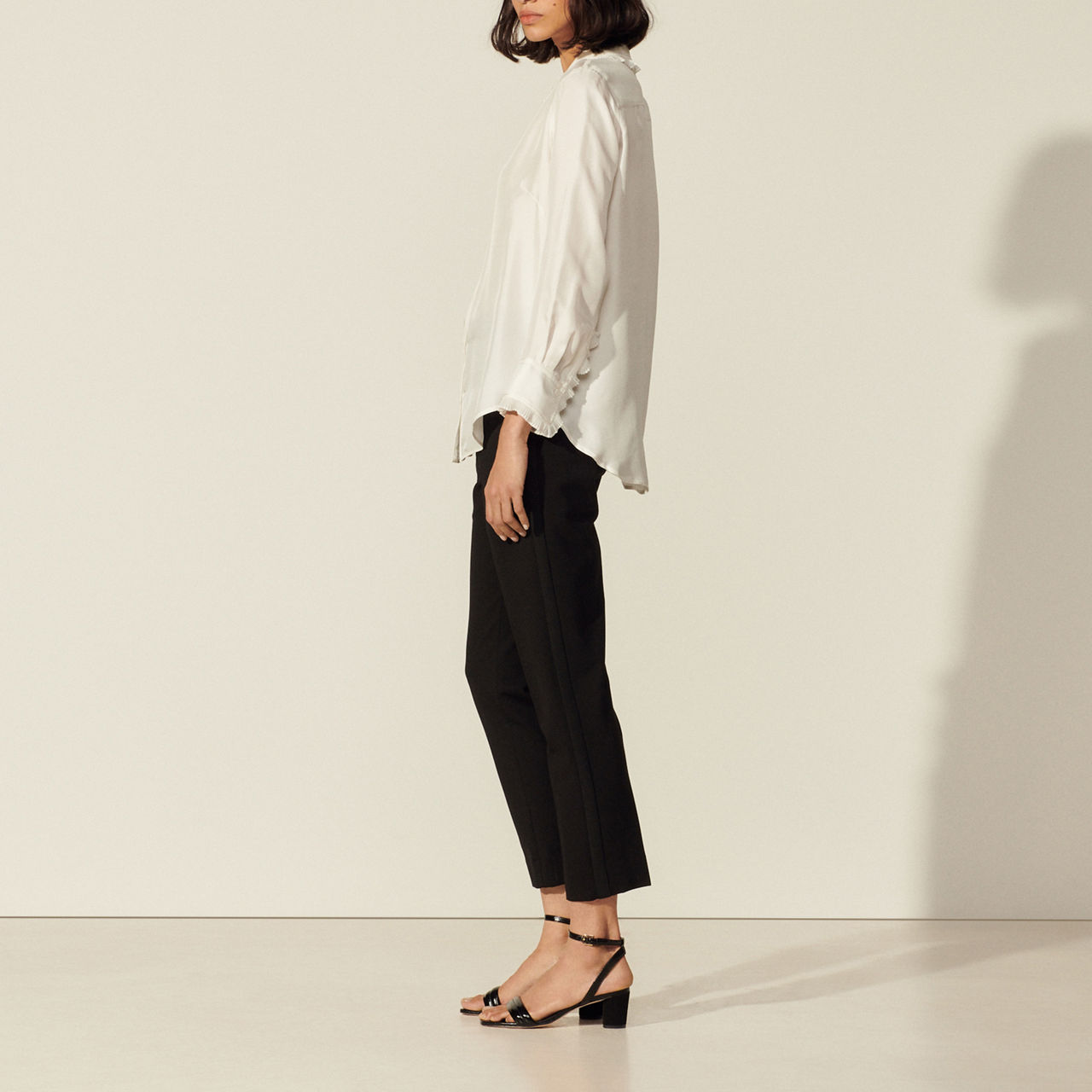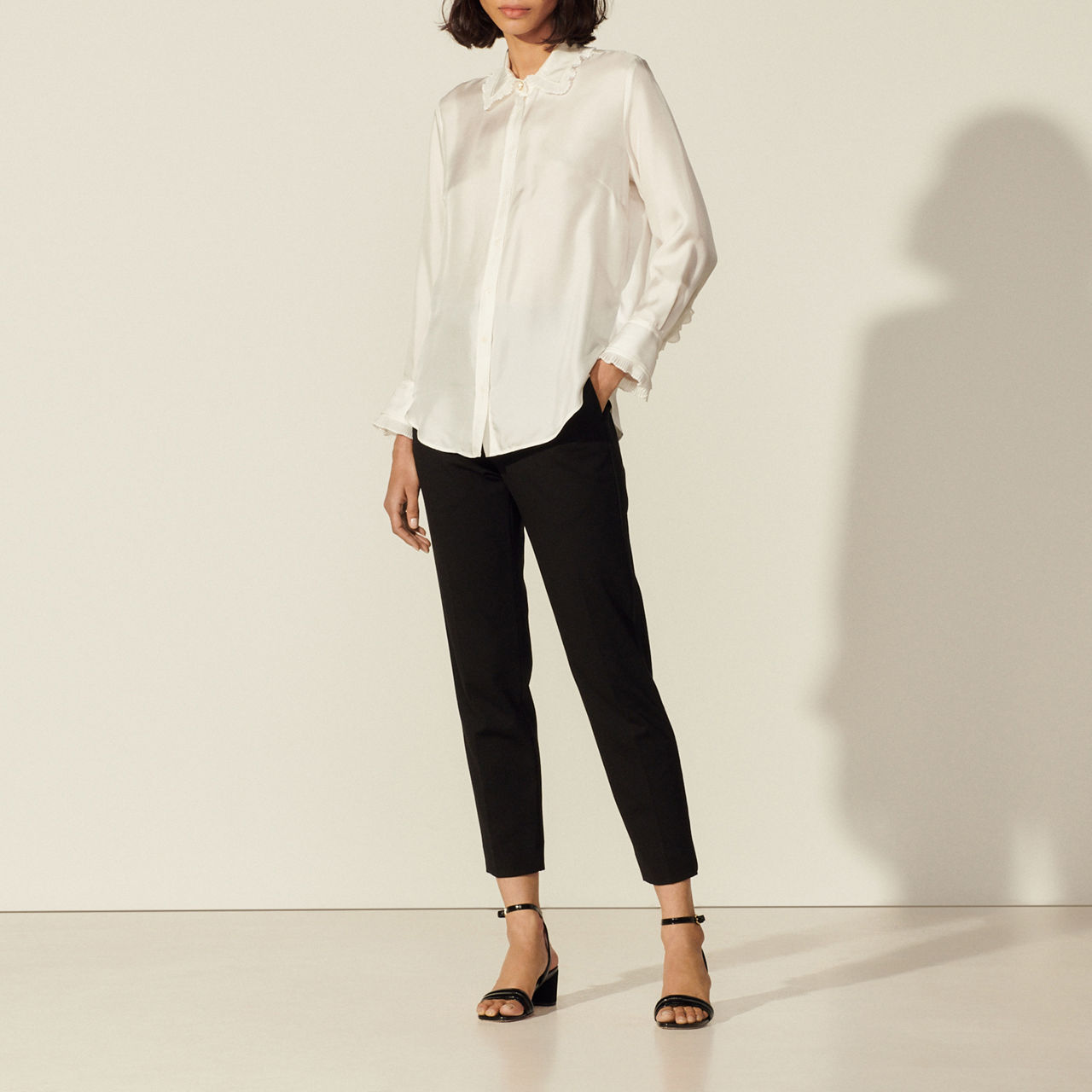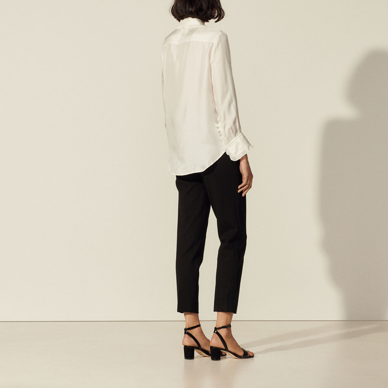 Look and feel flawless in this beautiful silk blouse from Parisian label, Sandro. Cut from silk to a classic fit, it features pretty pleating detail at the collar and cuffs, while it's finished with a pearl button. Team with tailored trousers and pointed flats for a sharp finish.