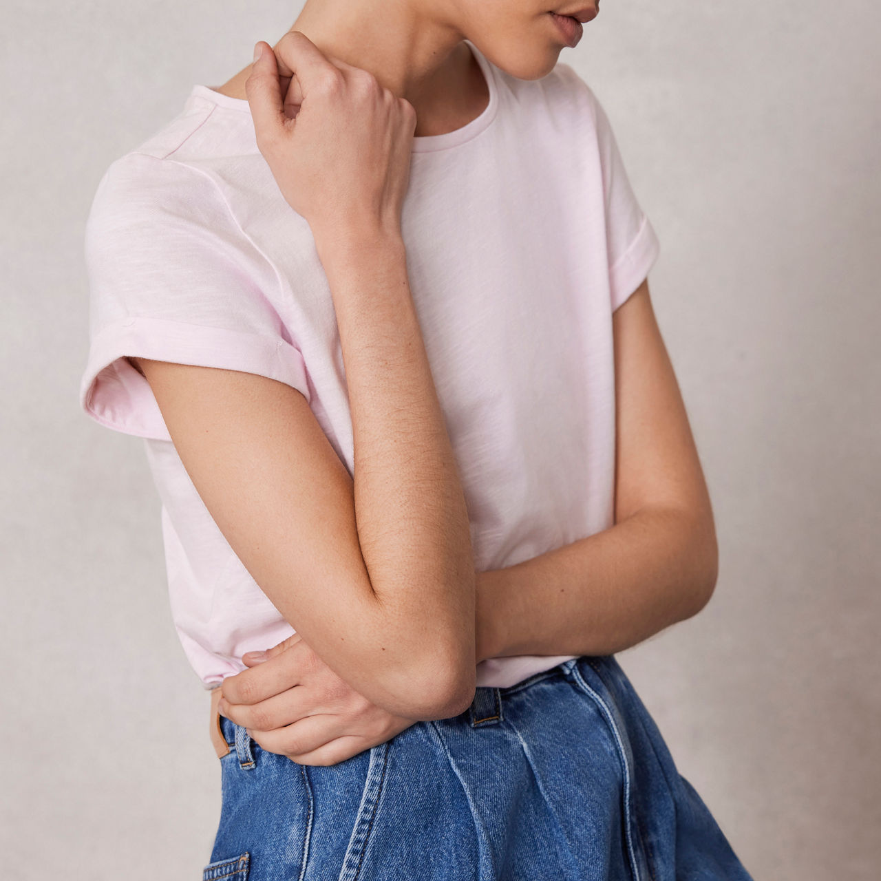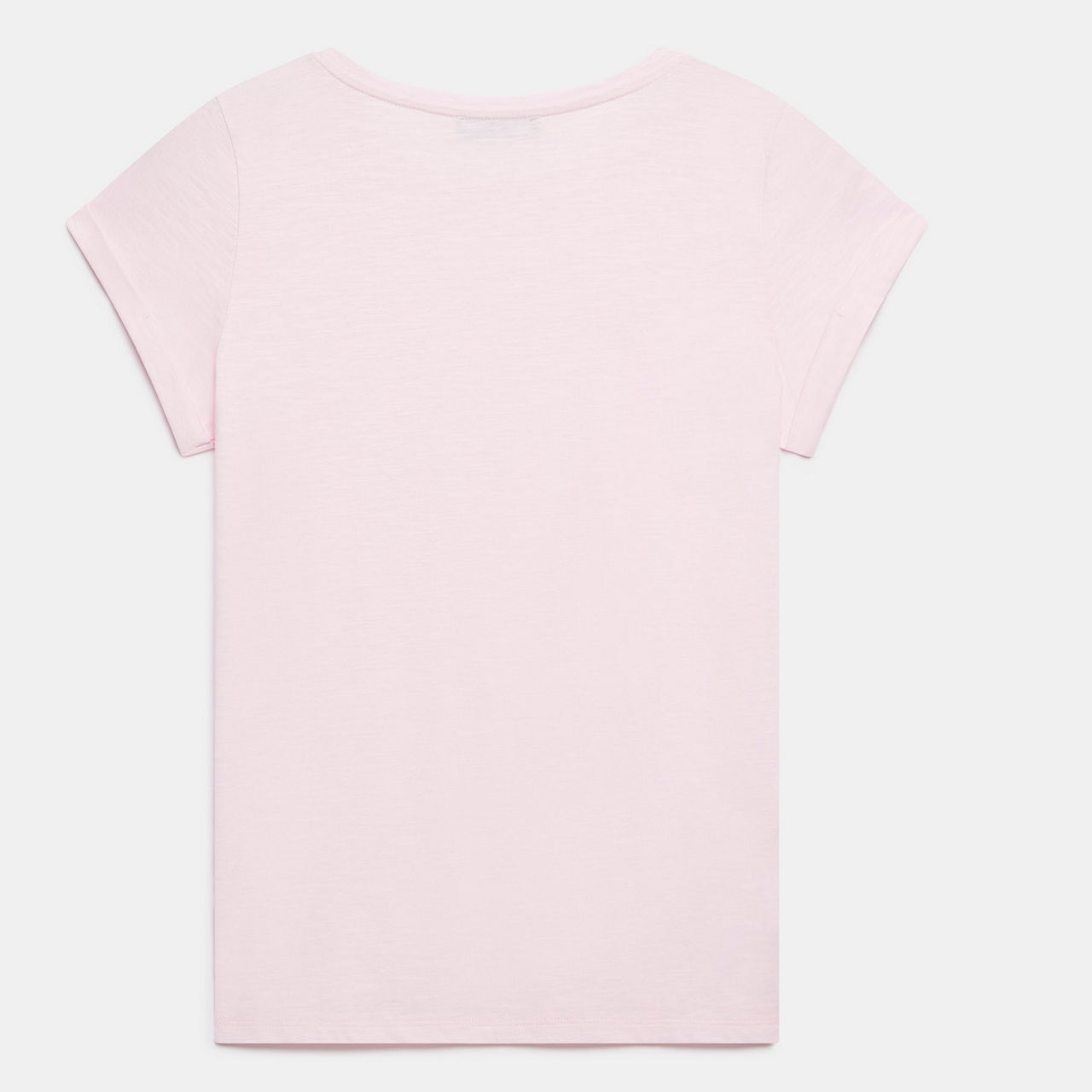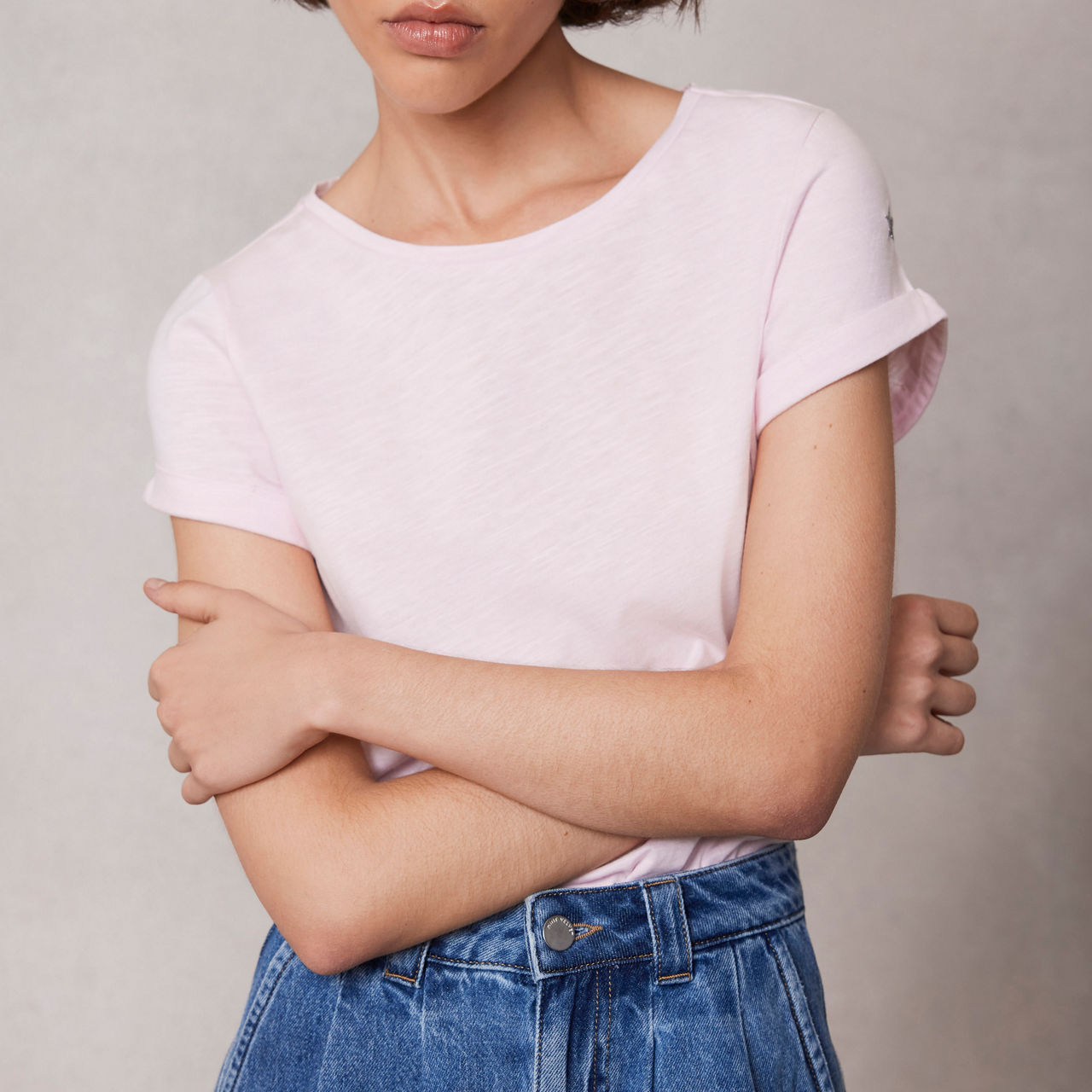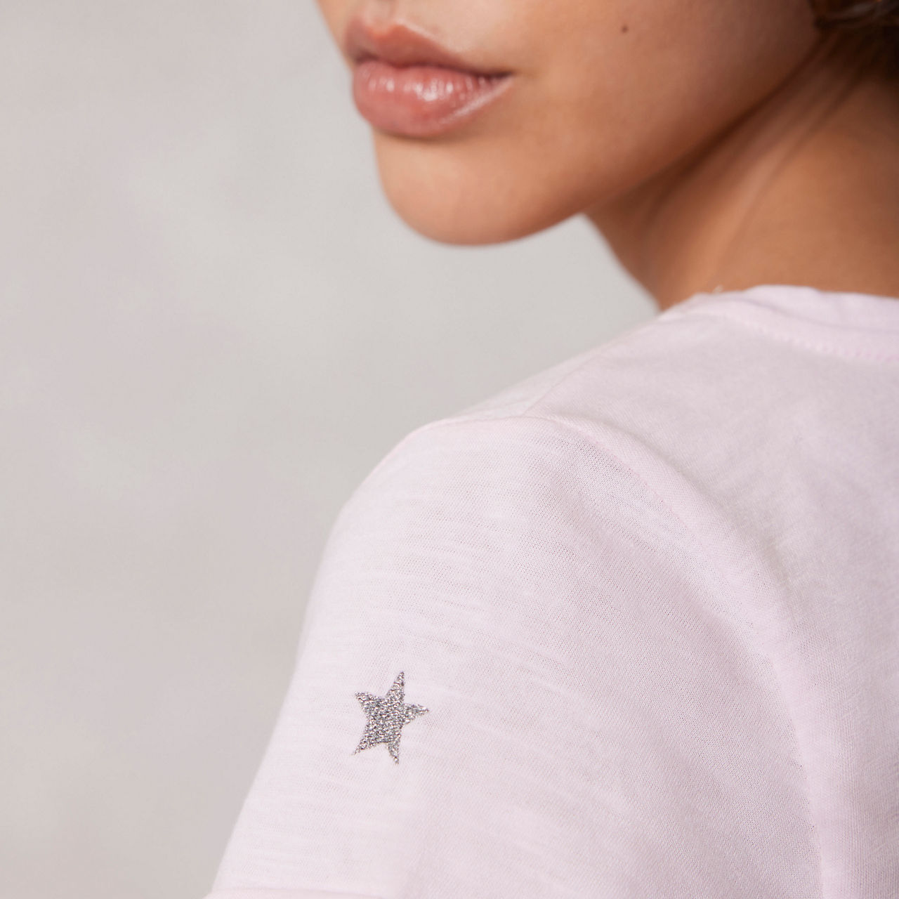 - Crew neckline, short fold-back sleeves, embroidered metallic star detail, tonal stitching, straight hemline, smooth fabric
