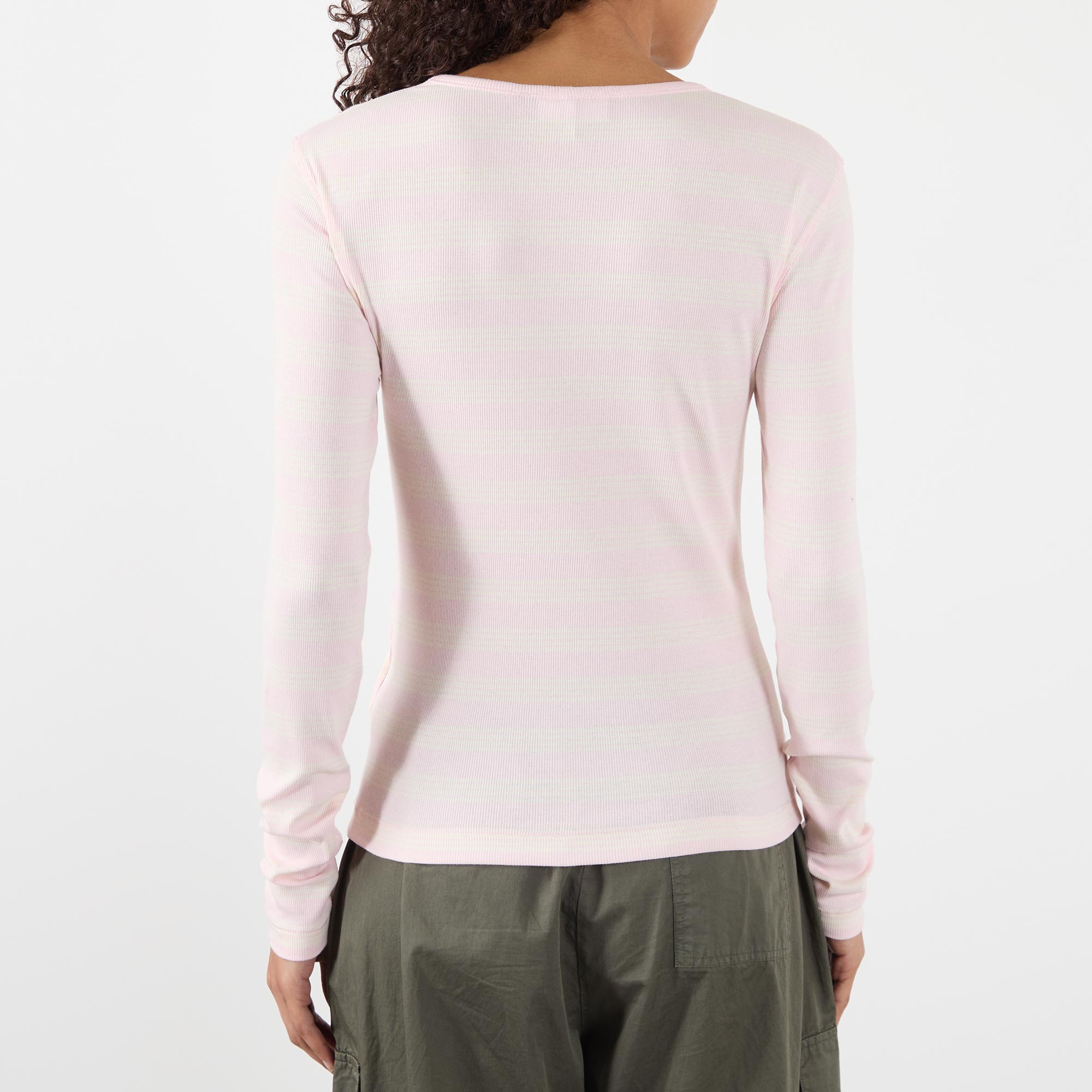 - Long sleeves, round neckline, tonal butterfly logo, striped pattern, smooth fabric