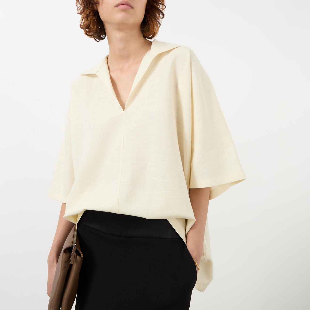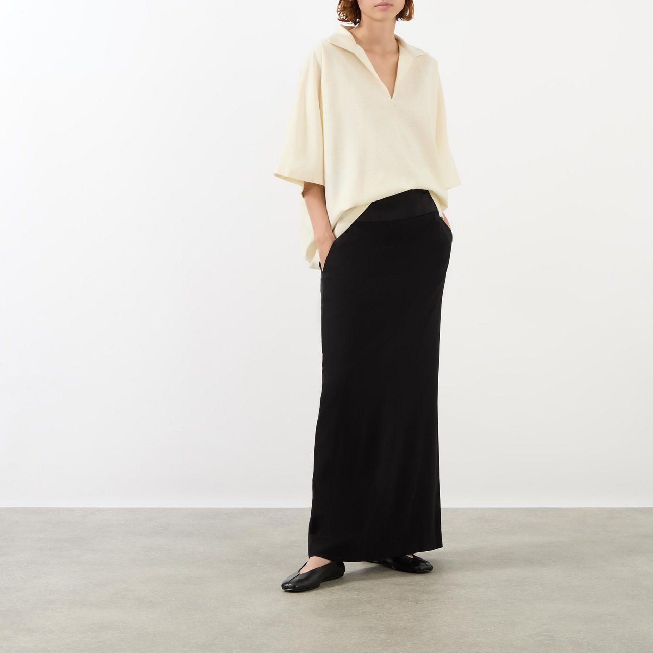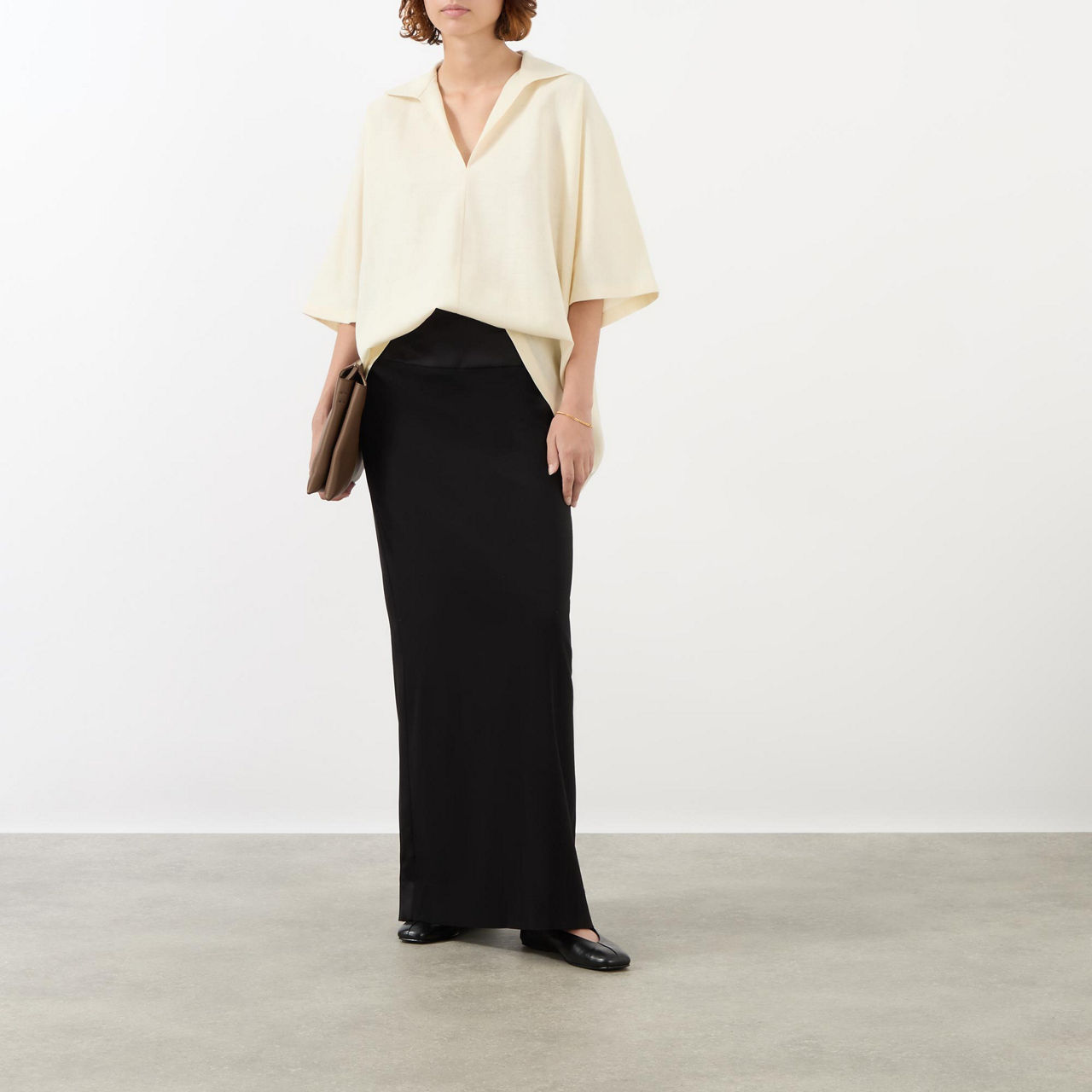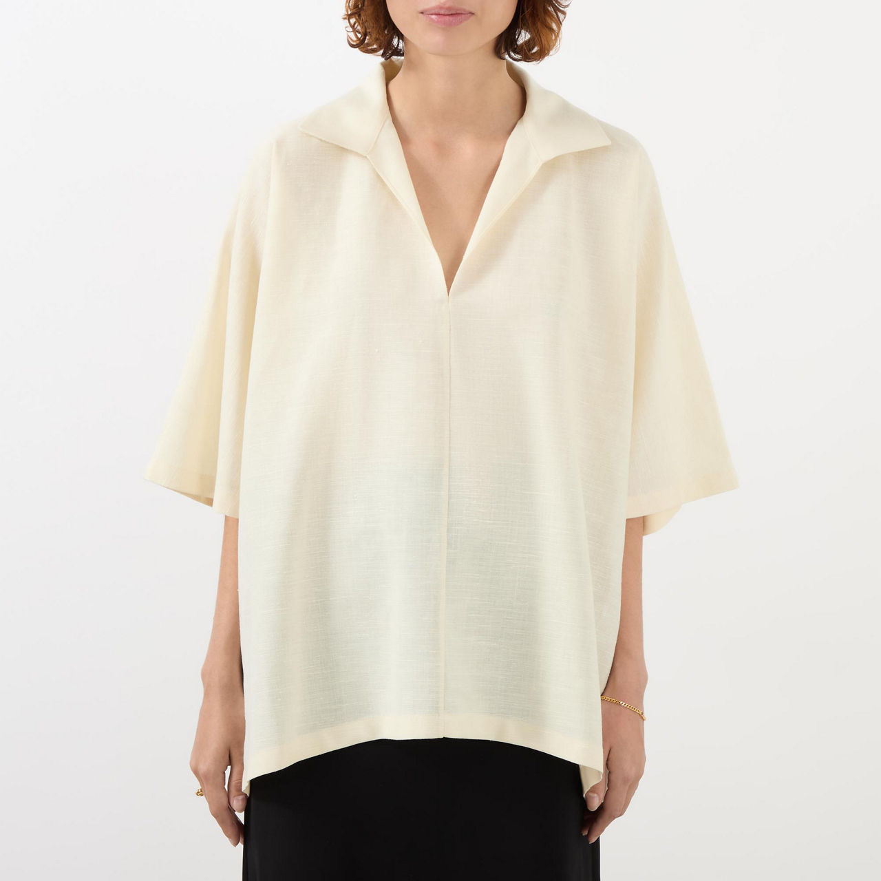 The Row, renowned for its roomy yet defined silhouettes, offers an exquisitely tailored collection this AW '24, take the Wen shirt. Spun from a luxurious blend of wool, silk, and linen, it is framed by a polo collar and kimono sleeves, enveloping the frame and cascading just beyond the hips, wear tucked into a pair of high waisted suit trousers for a polished edit.