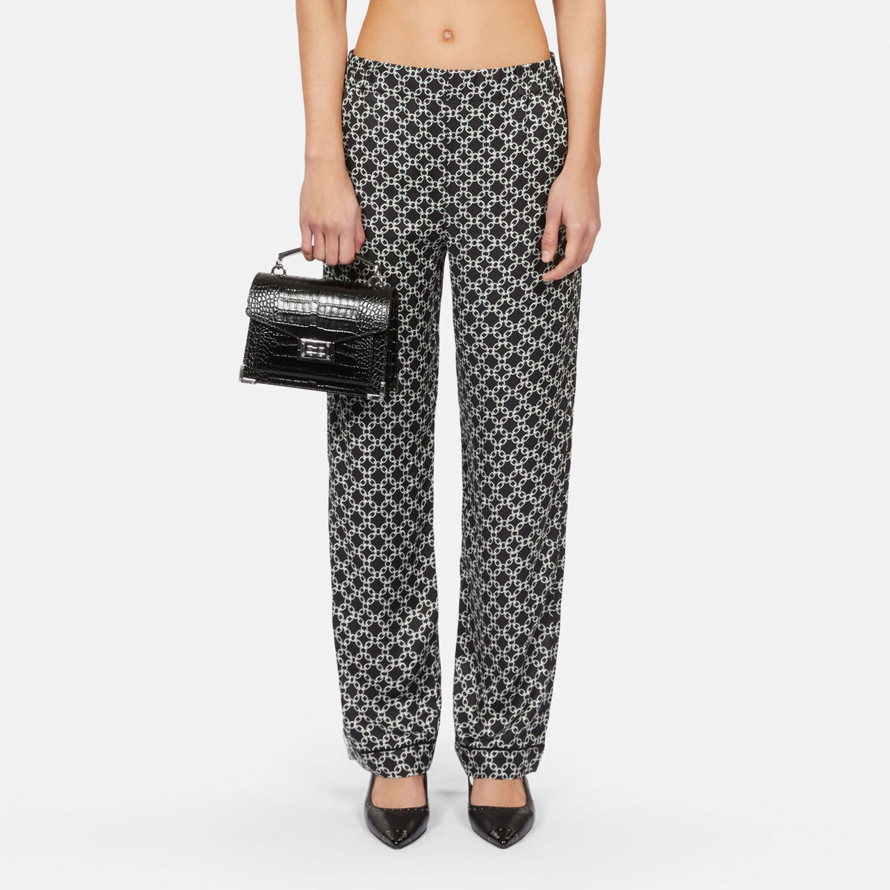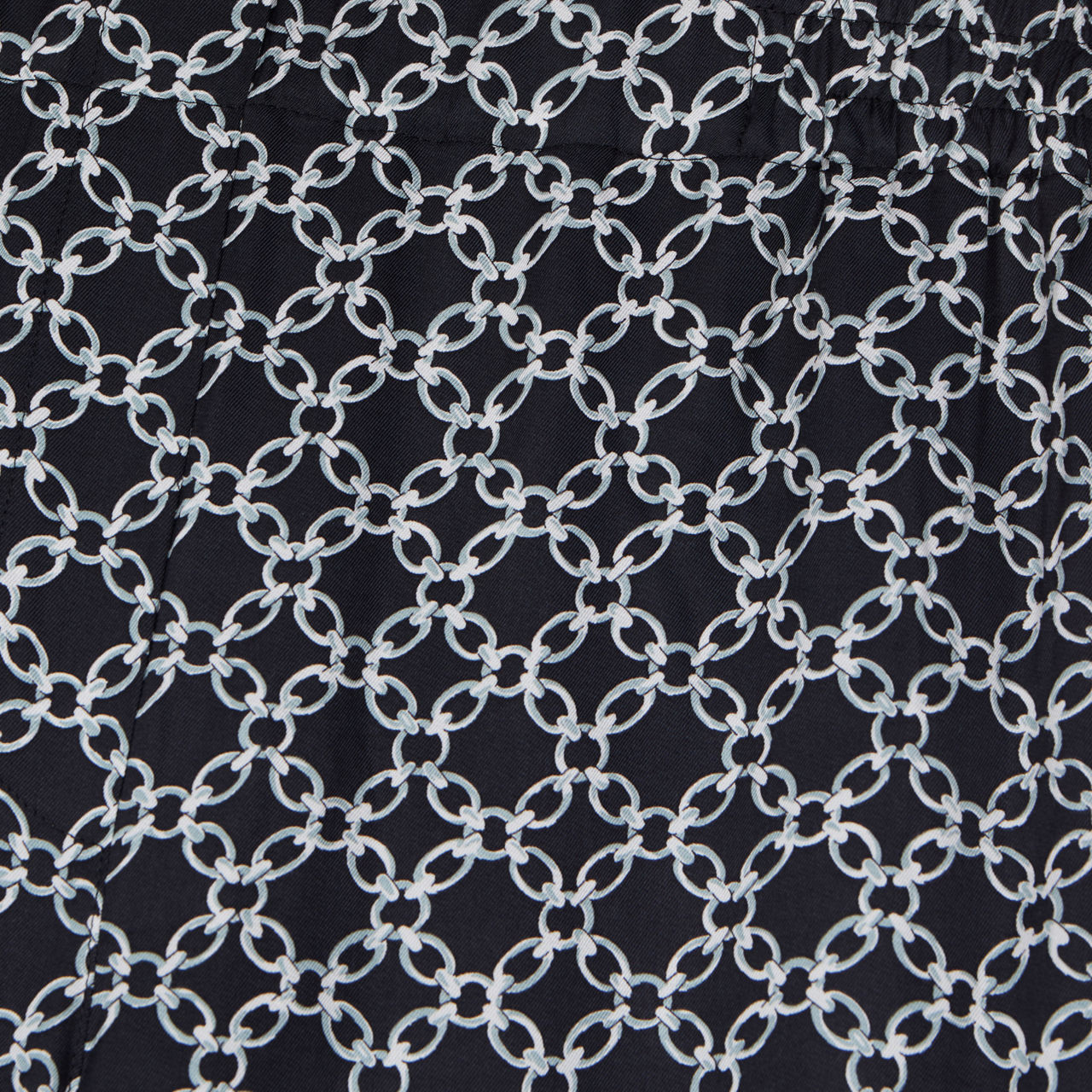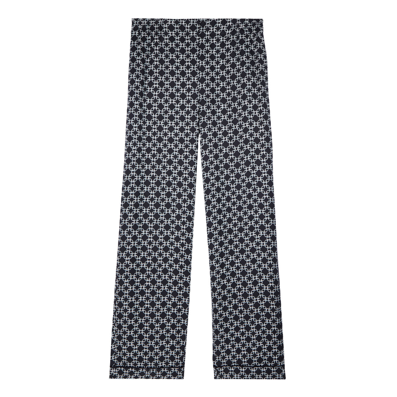 - Chain print, straight silhouette, elasticated waist, invisible side pockets, patch pocket to the back, piping