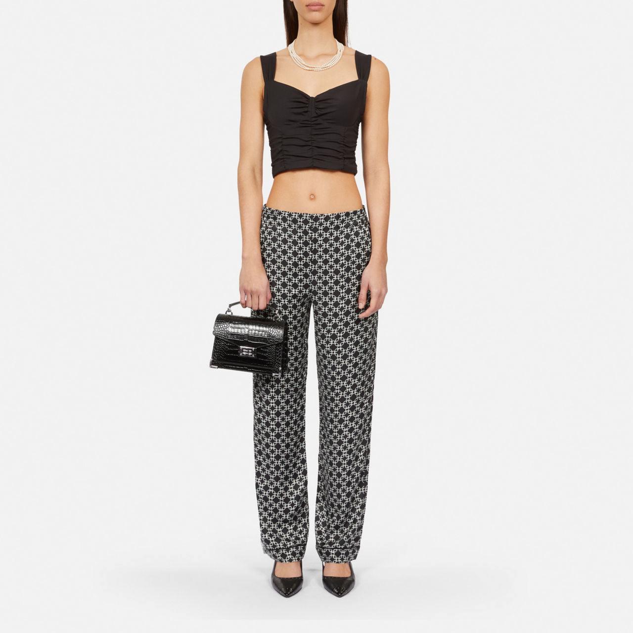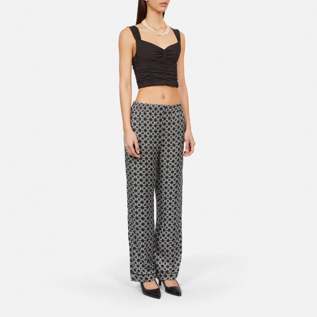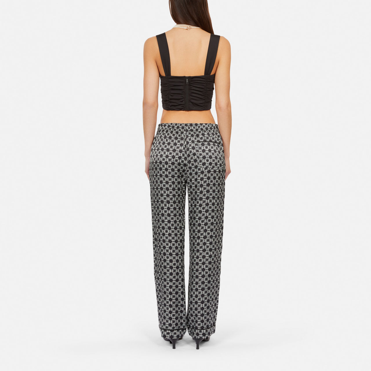 - Chain print, straight silhouette, elasticated waist, invisible side pockets, patch pocket to the back, piping
