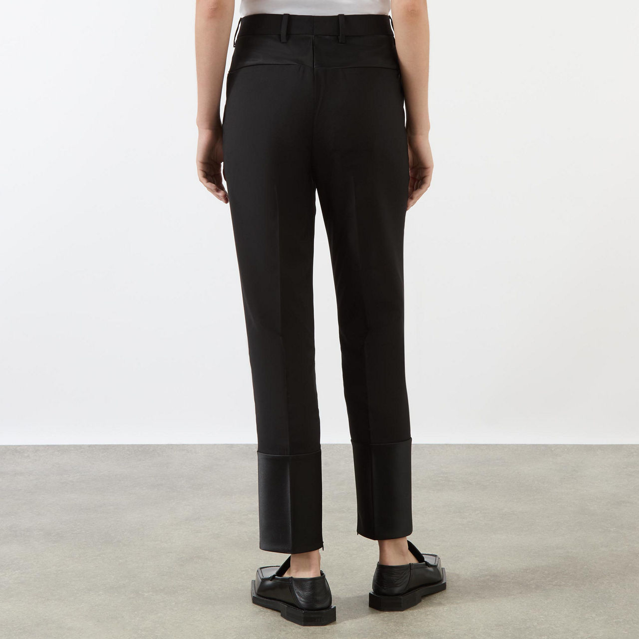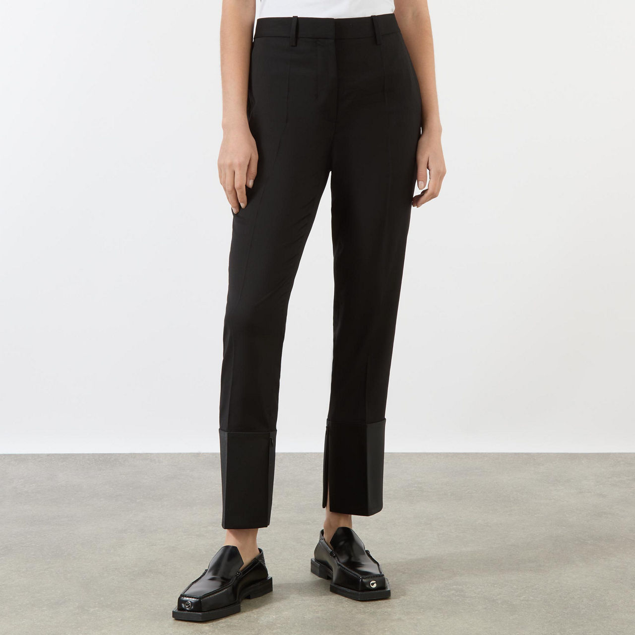 - Mid-rise, slim-leg, cropped length, belt loops, flat front, zip fly with hook-and-eye fastening, two side slit pockets, two rear pockets with zip fastening, adjustable zip satin cuffs, tailored design,
