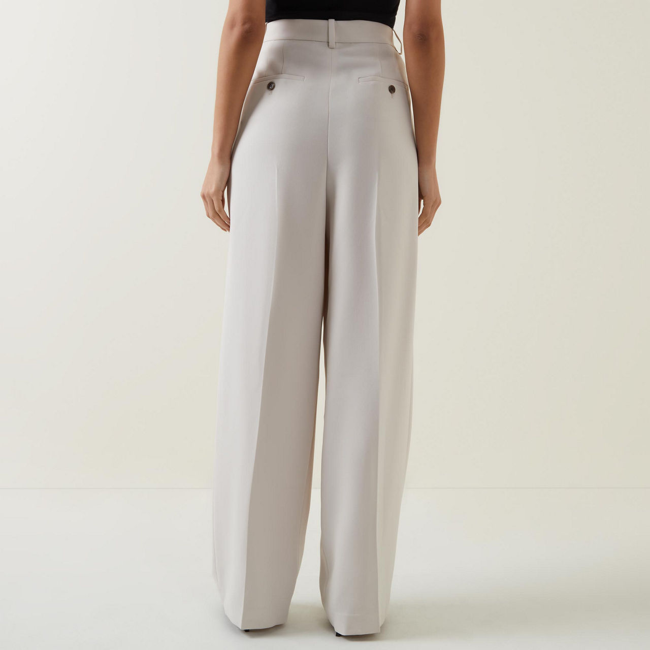 - High-rise, wide-leg, covered waistband, belt loops, zip fly with hook-and-eye fastening, double-pleat detailing at the front, two side slit pockets, two rear welt pockets with button fastening, clean hems, pressed creases