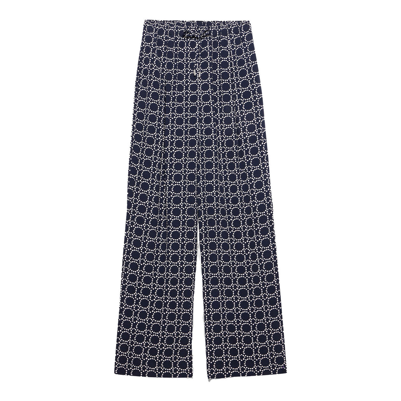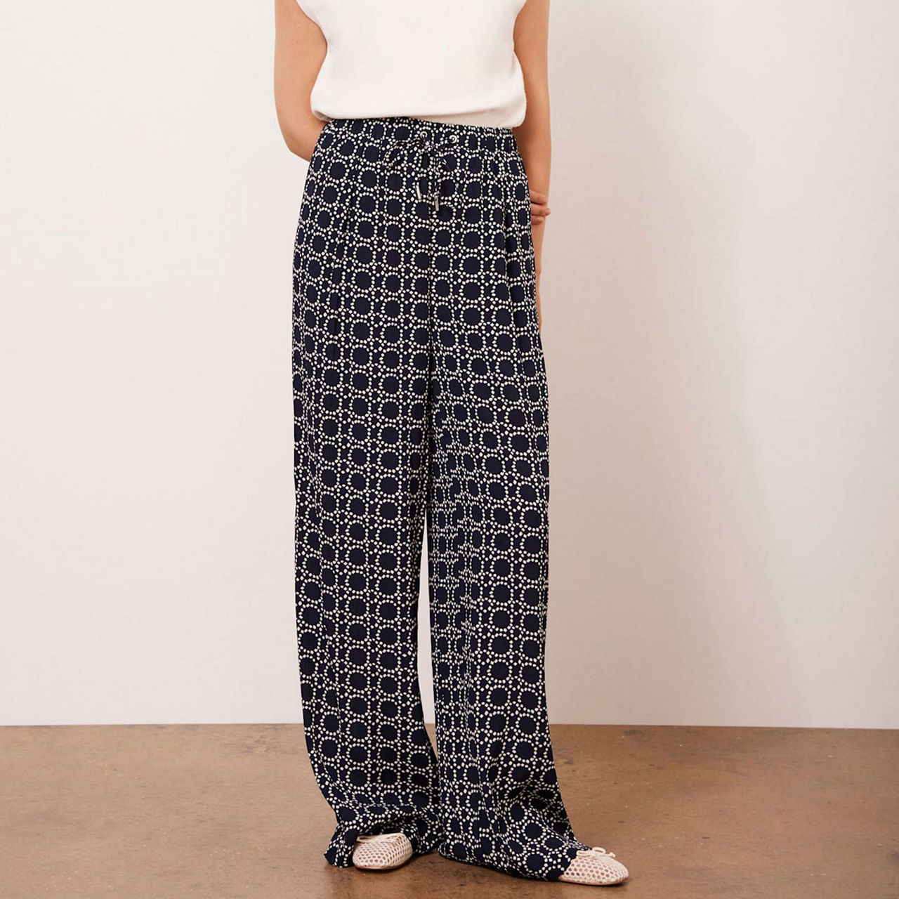 - Geometric print, high rise, elasticated waistband, wide cut leg, drawstring fastening