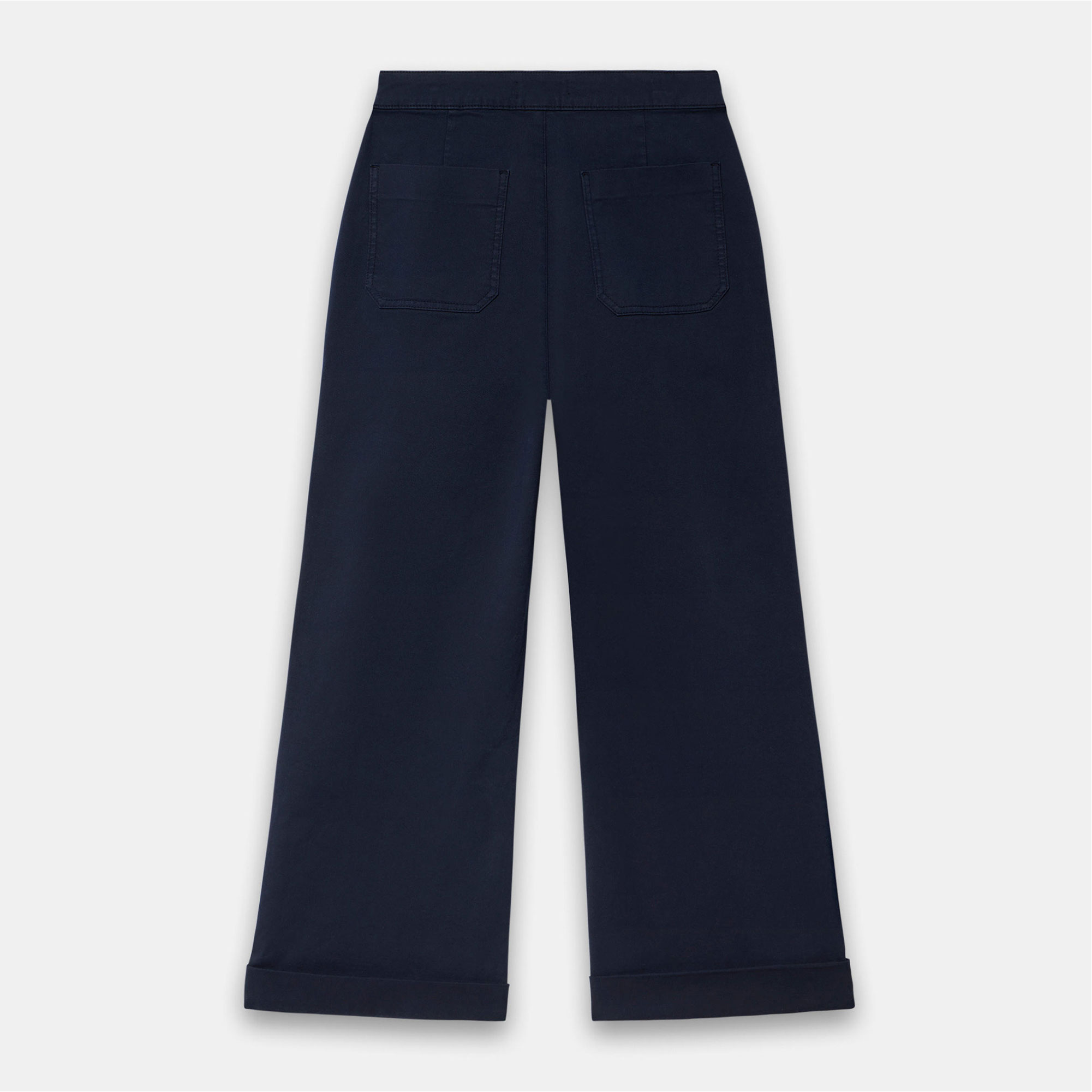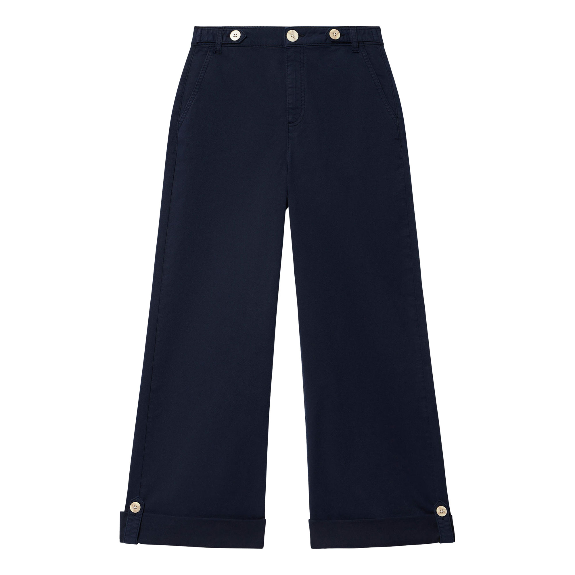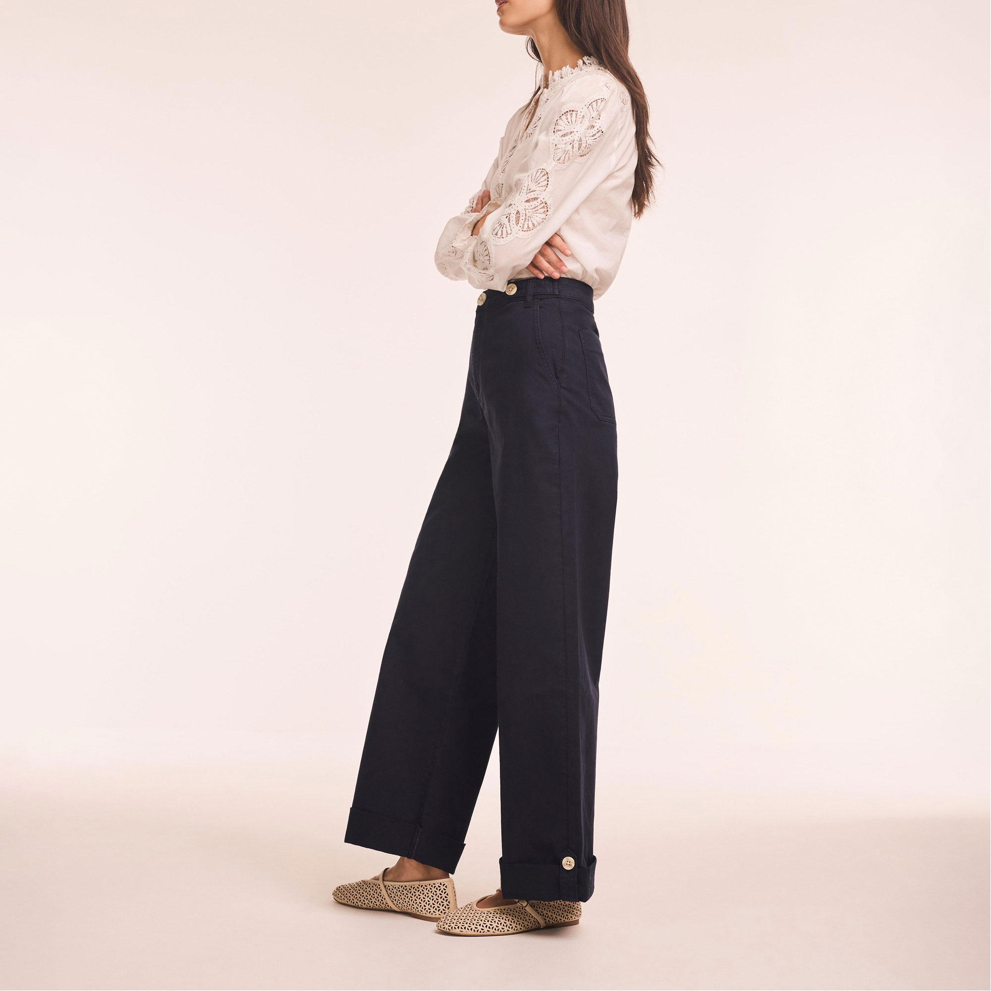 - Wide-leg silhouette, chino style