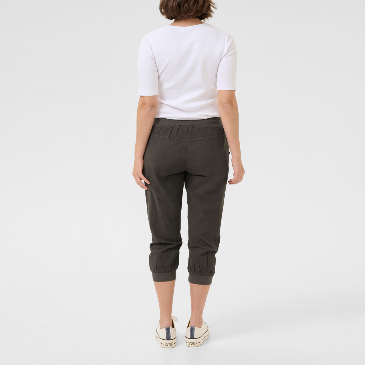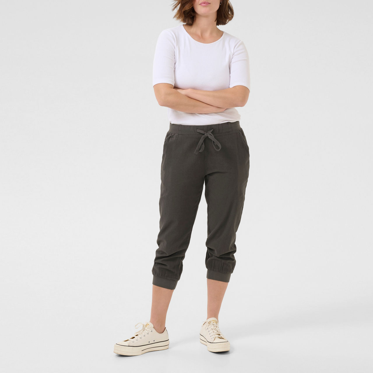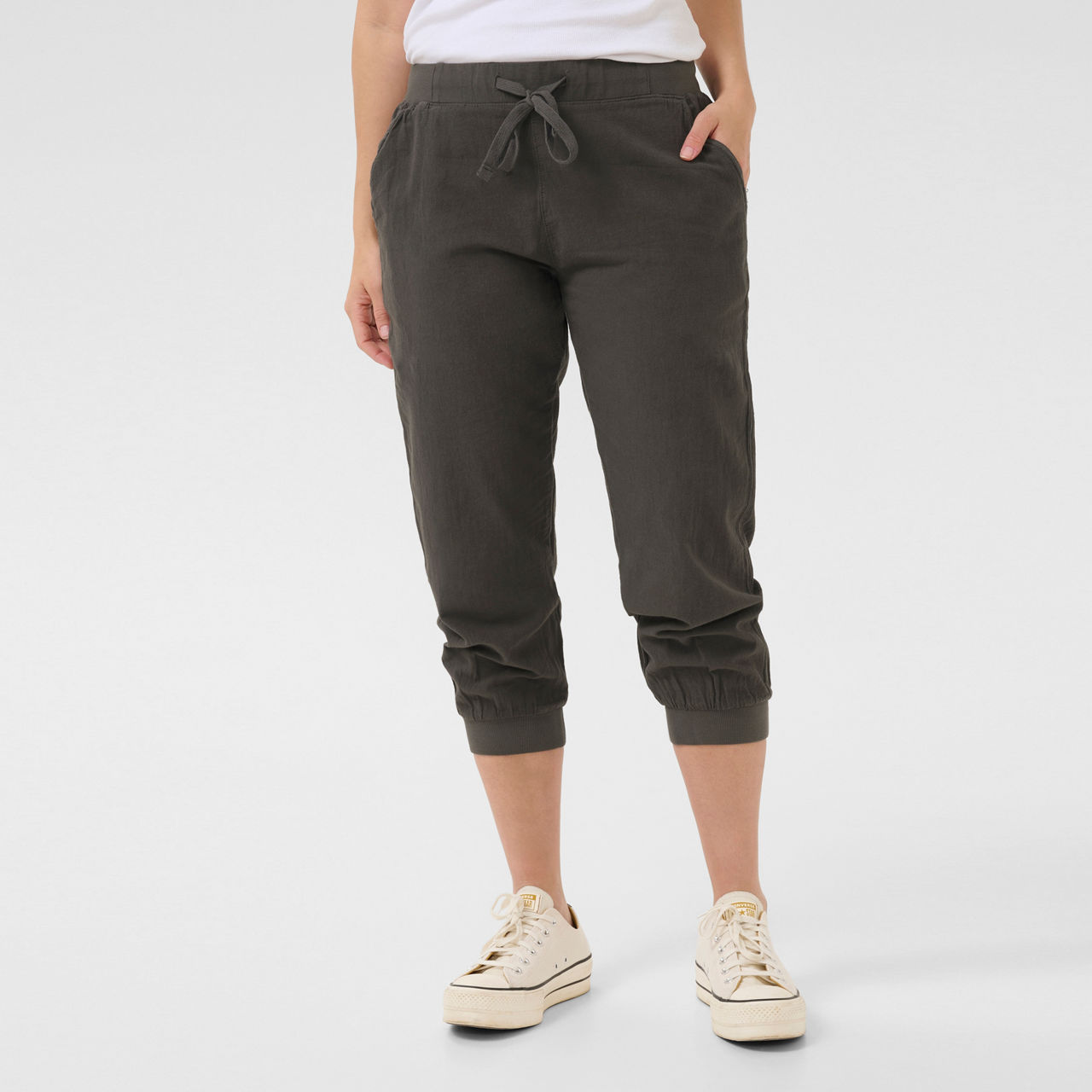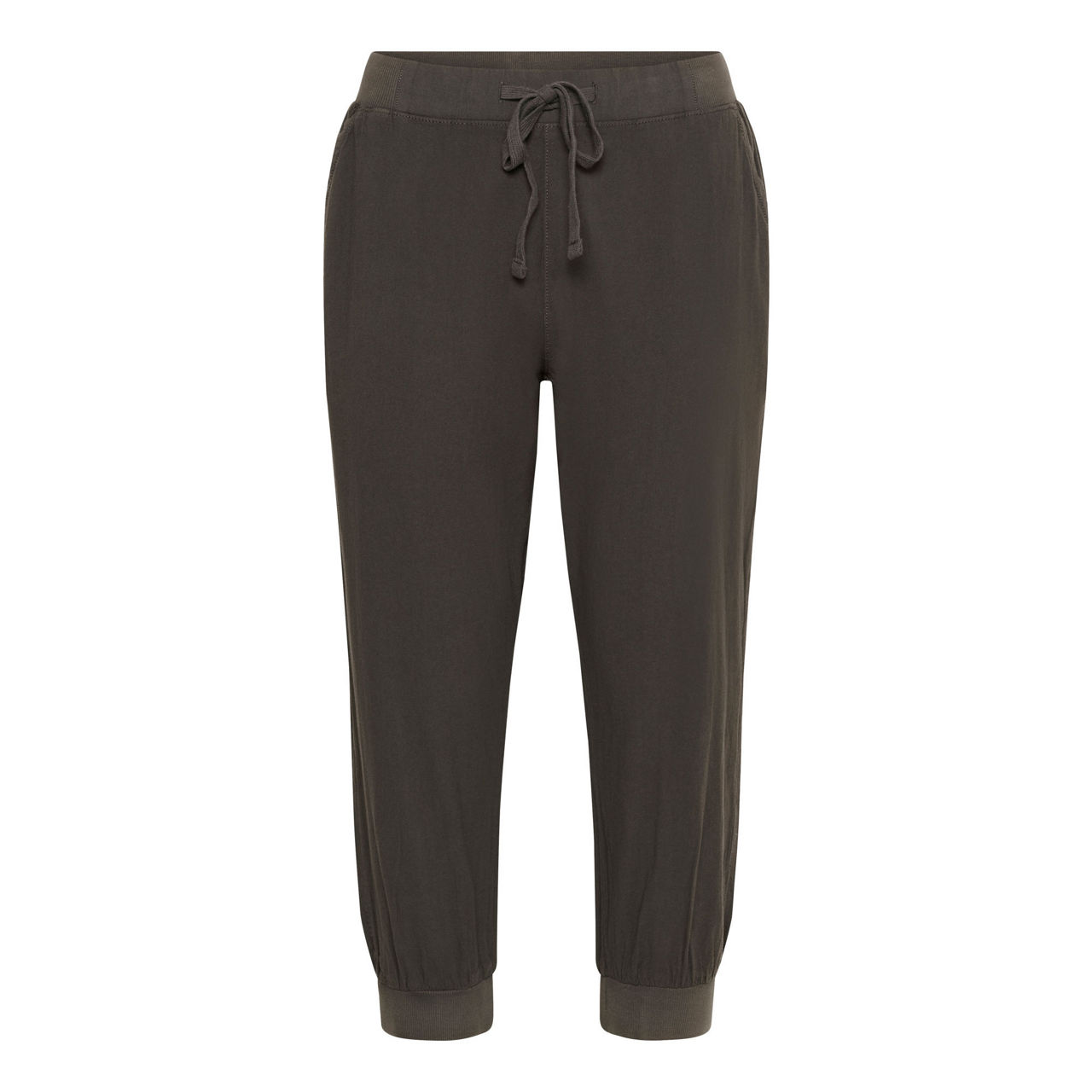 - High rise, elasticated waistband with adjustable drawstring fastening, oblique front pockets, cropped below the calves, elasticated cuffs