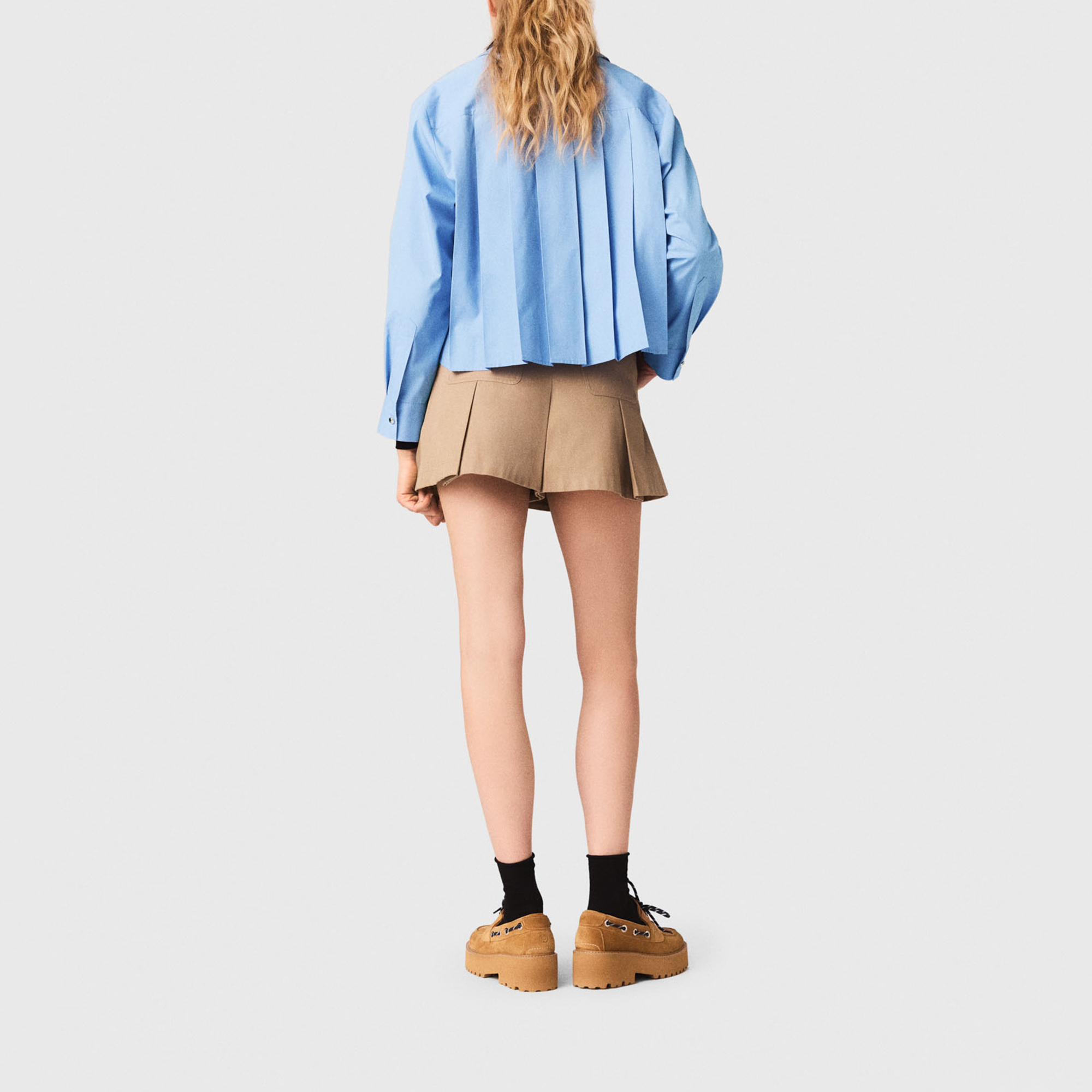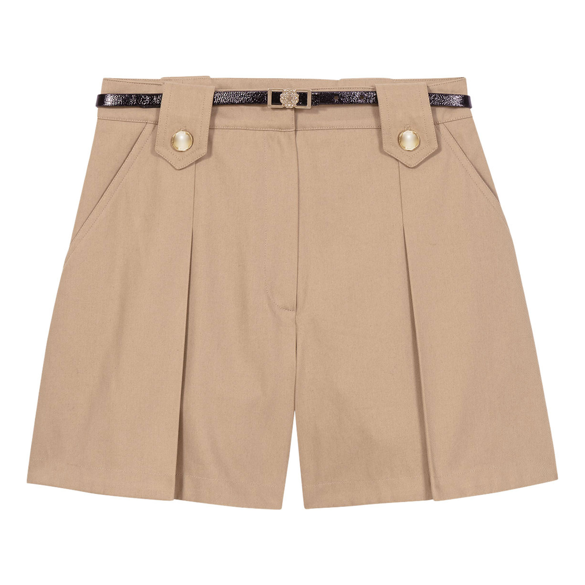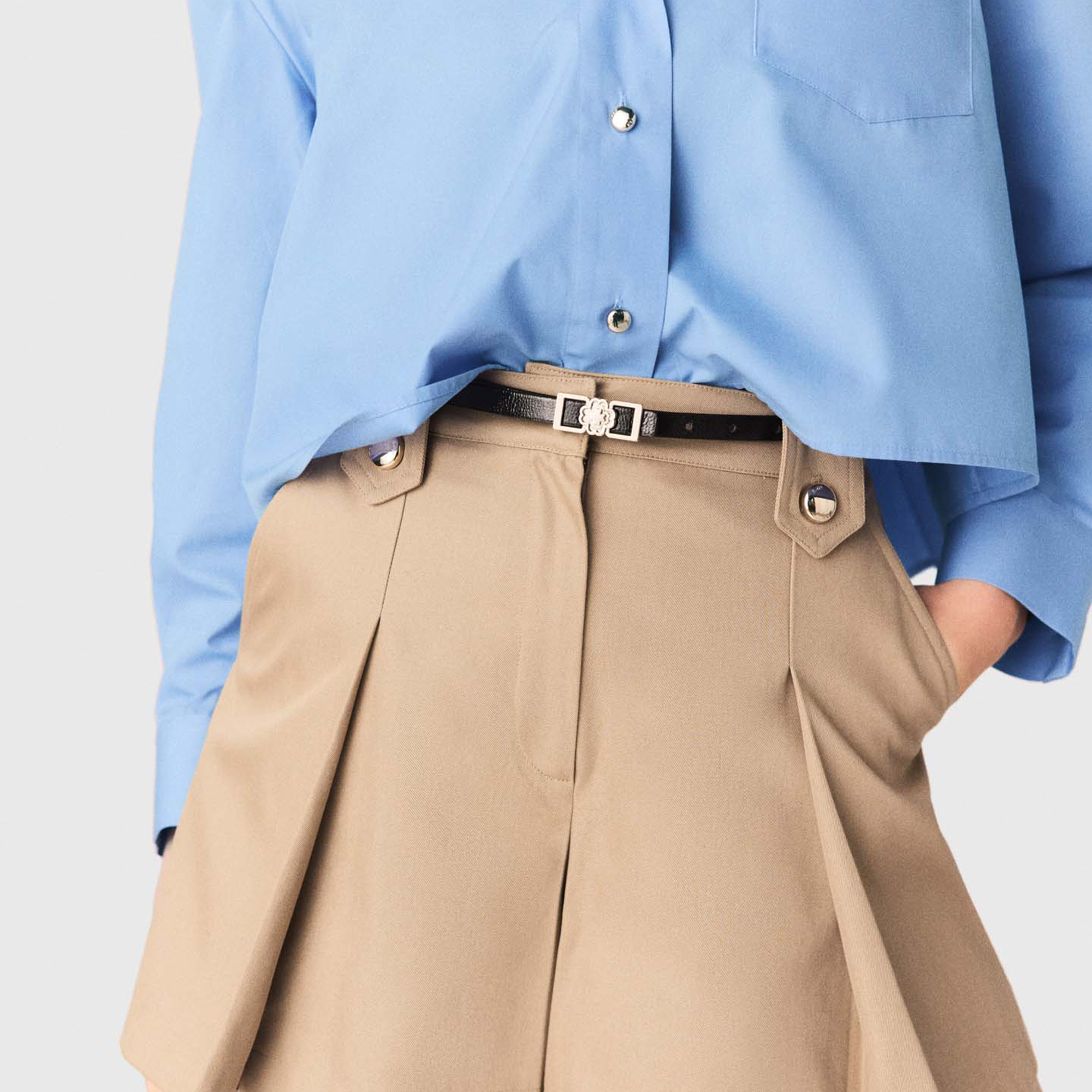 • Wide-leg cut, box pleats, belt with gold-tone Clover buckle, two front Italian pockets, two large belt loops with gold-tone buttons
