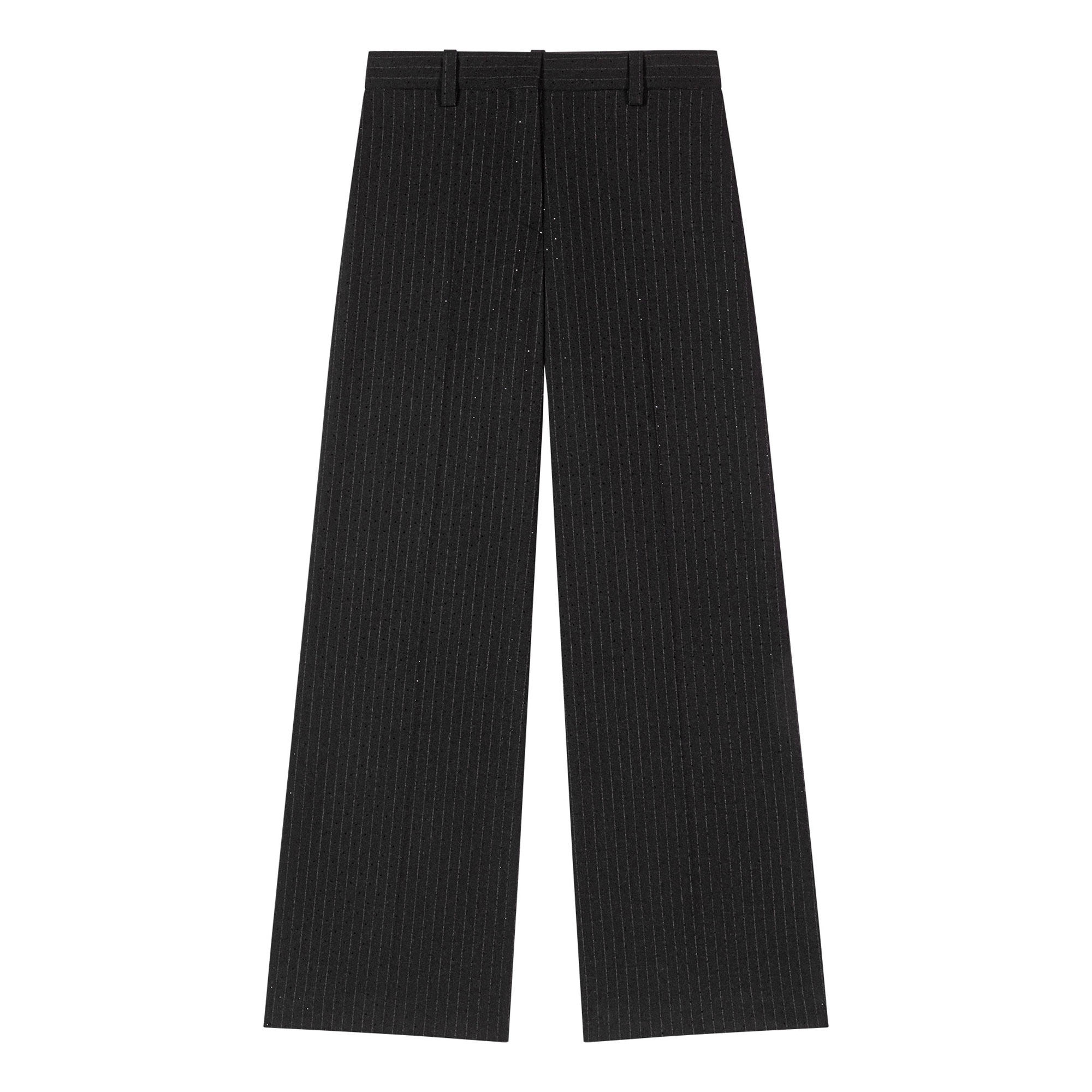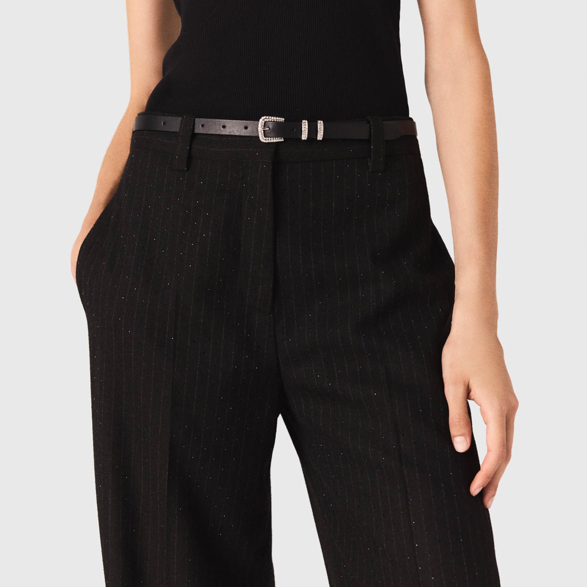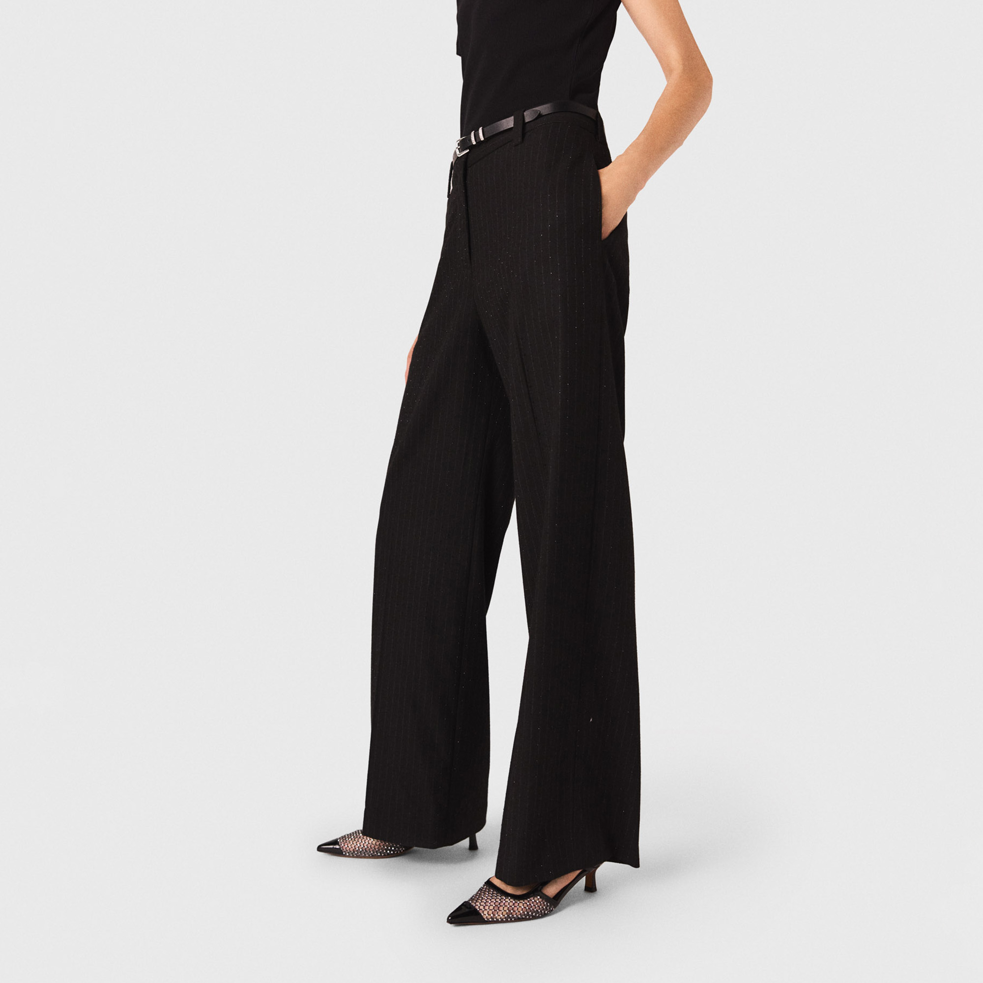 - Discreet rhinestone details, belt loops at the waist, zip and hook fastening, wide flowing fit, striped pattern