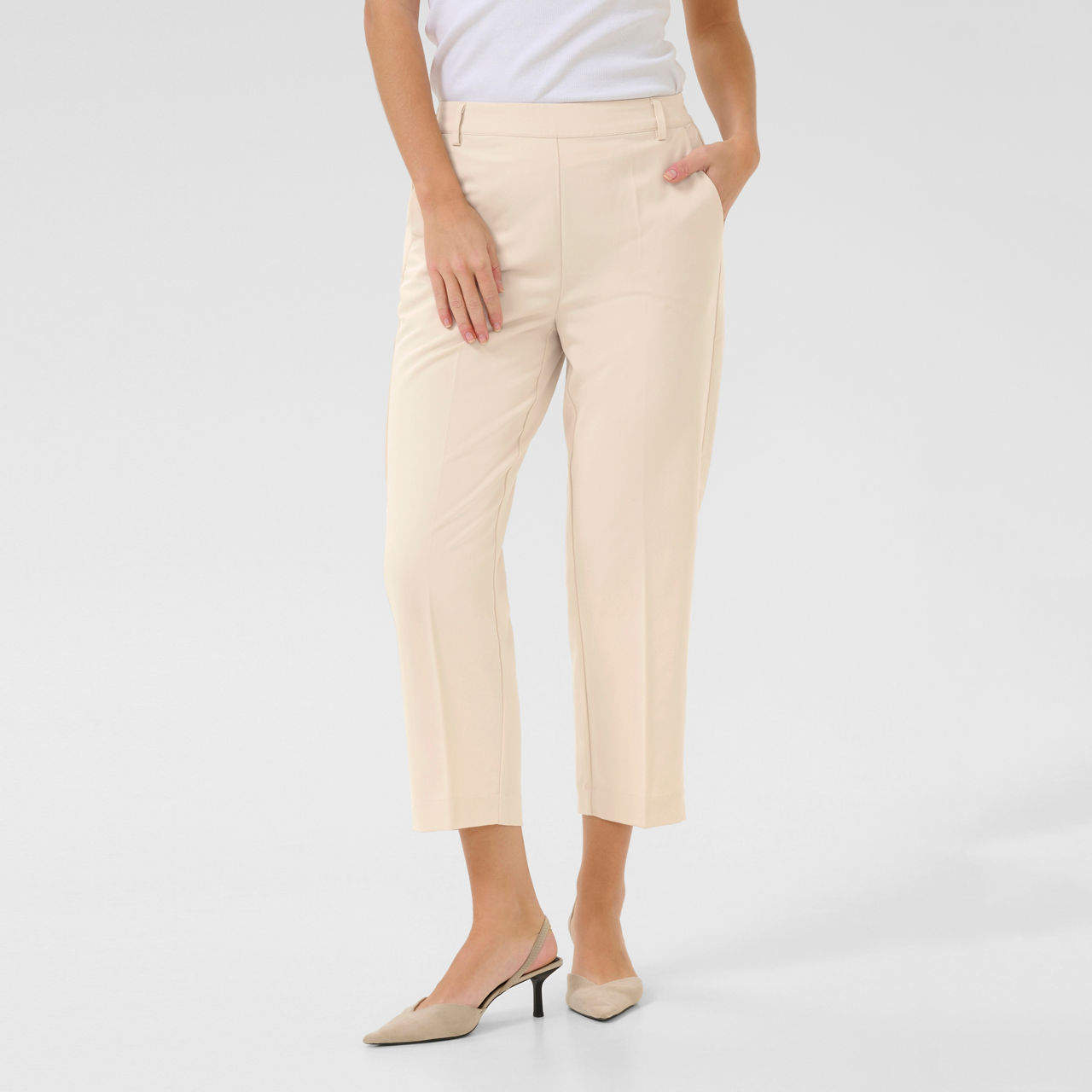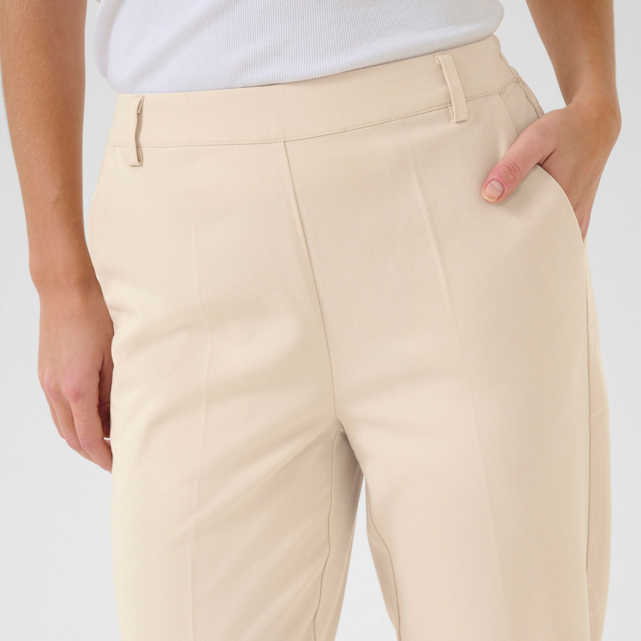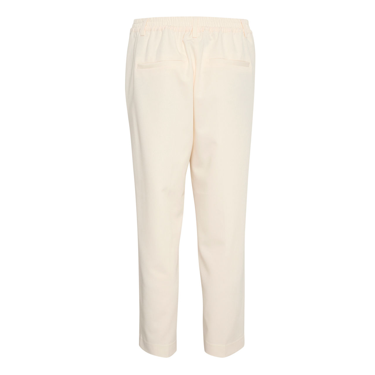 - Straight leg, cropped length, gathered elasticated waistband at the back, oblique front pockets, jetted back pockets, pressed creases