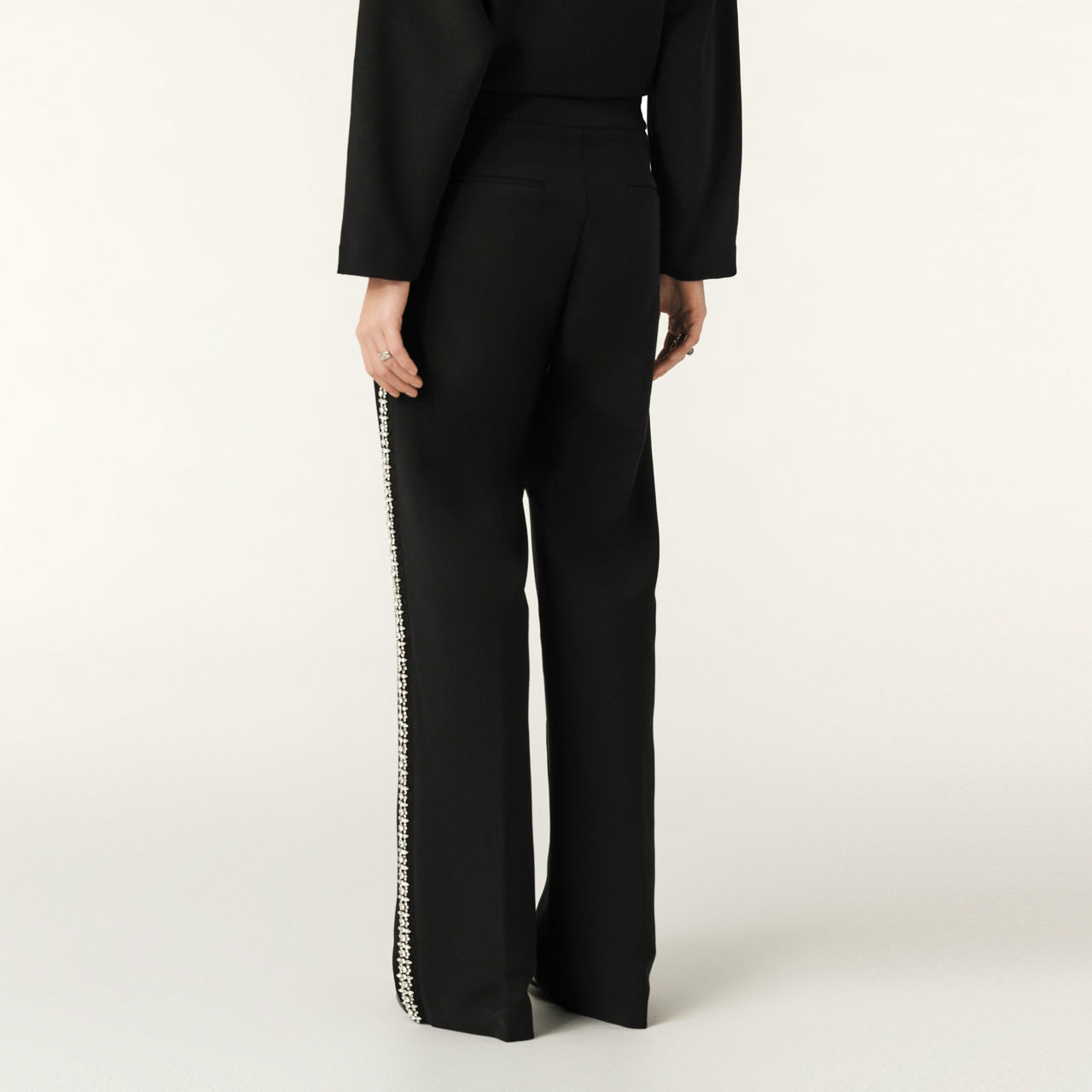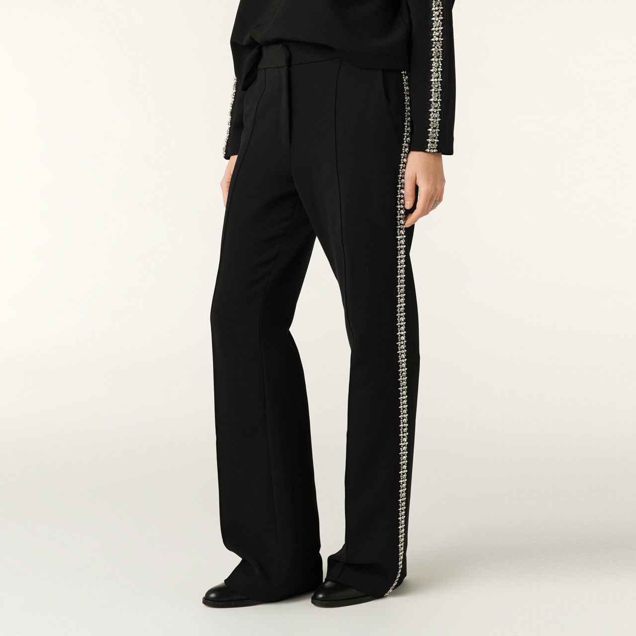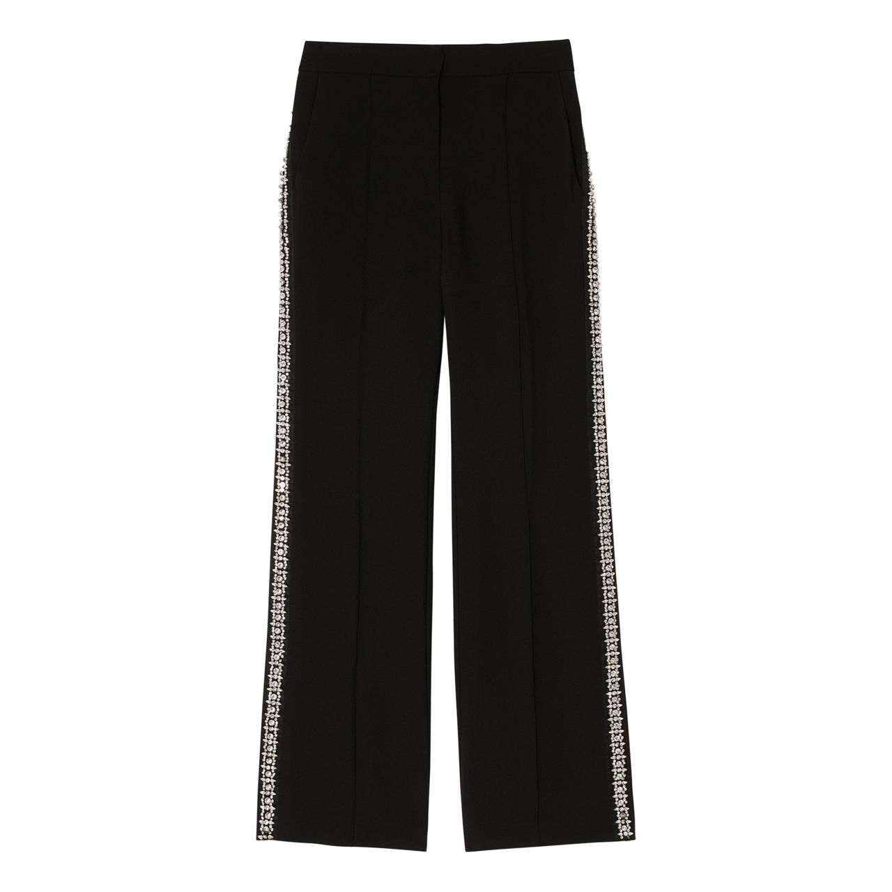 - Straight leg, diamanté bands on the sides, button and zip fastening, slant pockets on the sides, back welt pockets