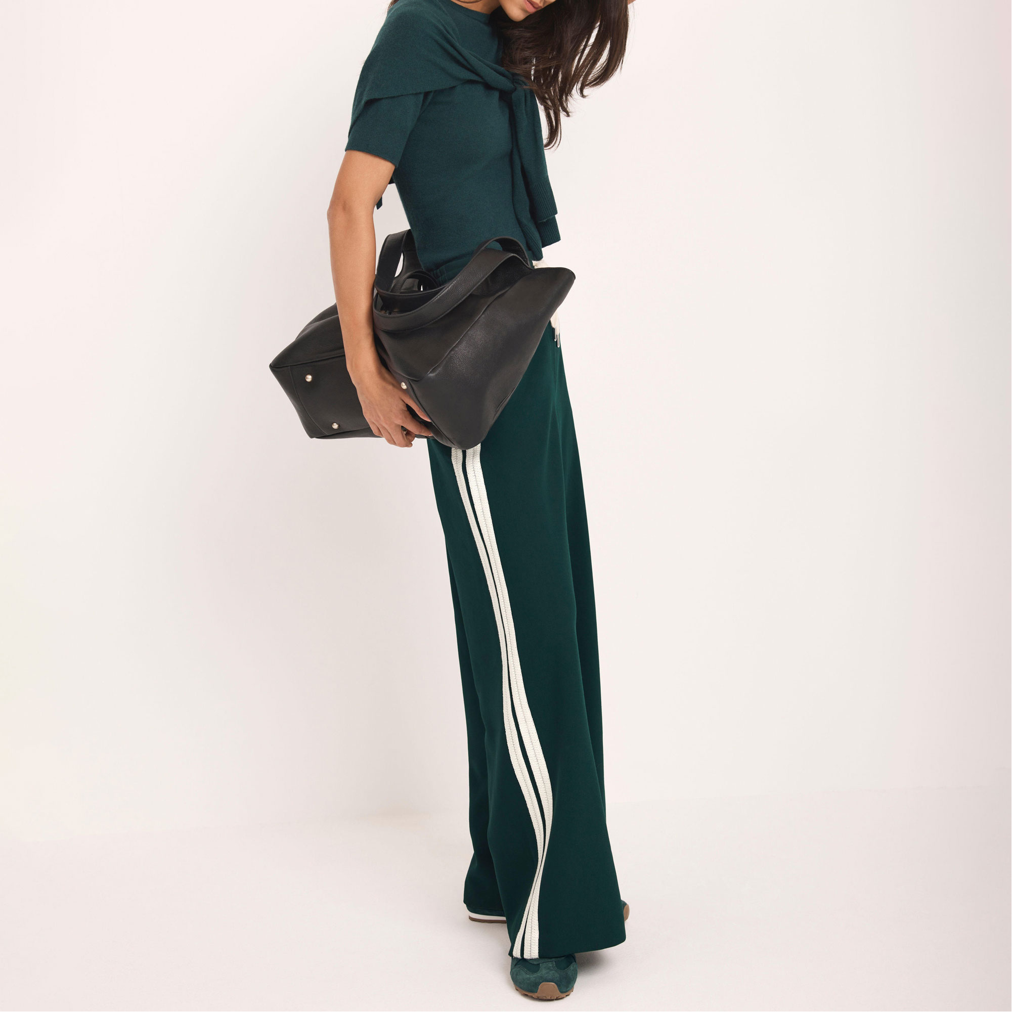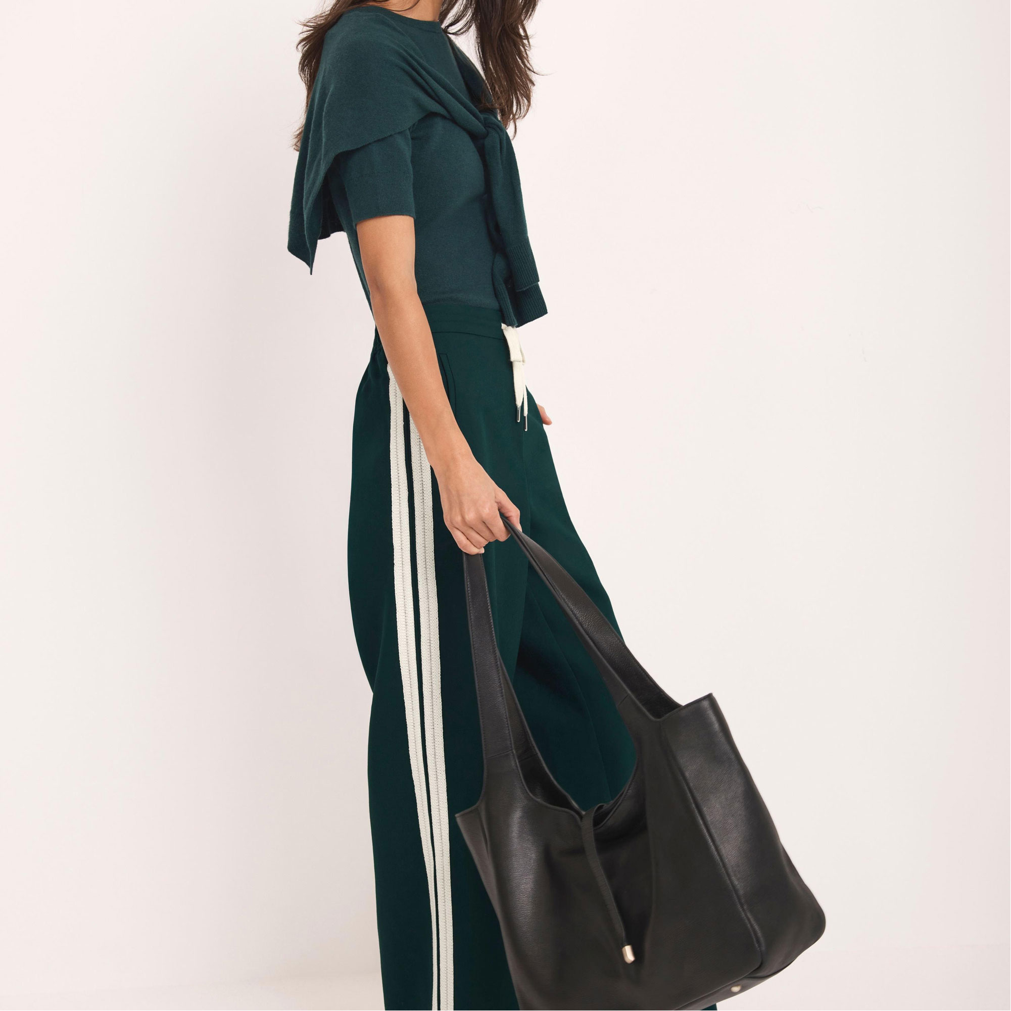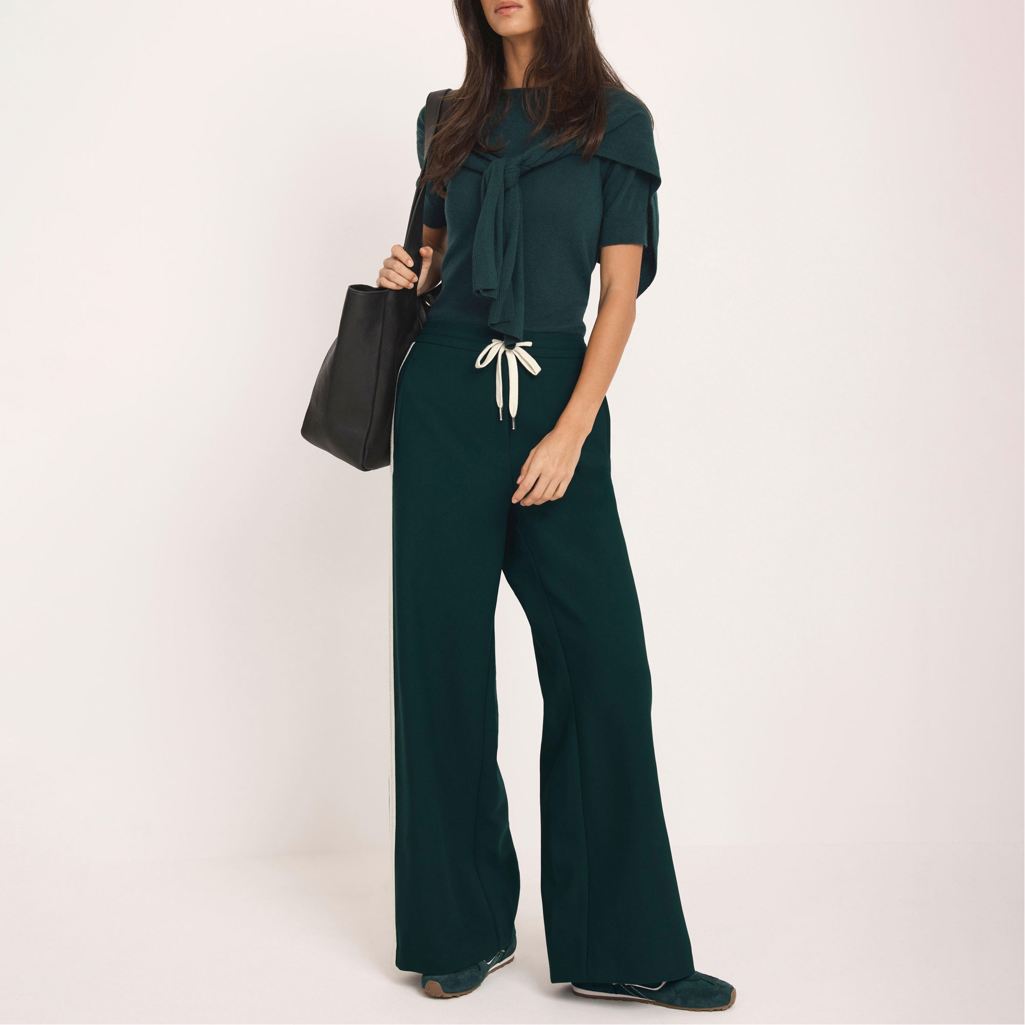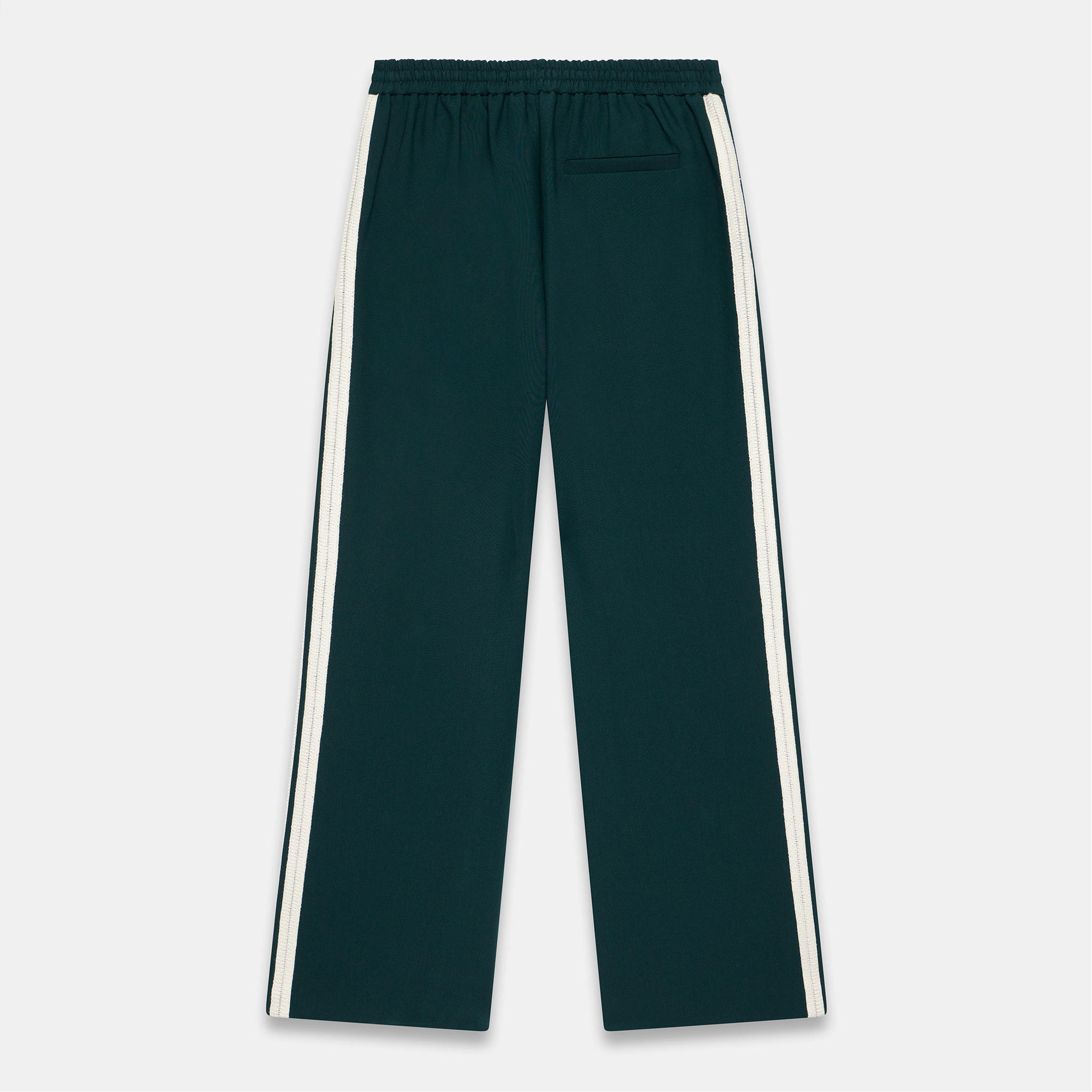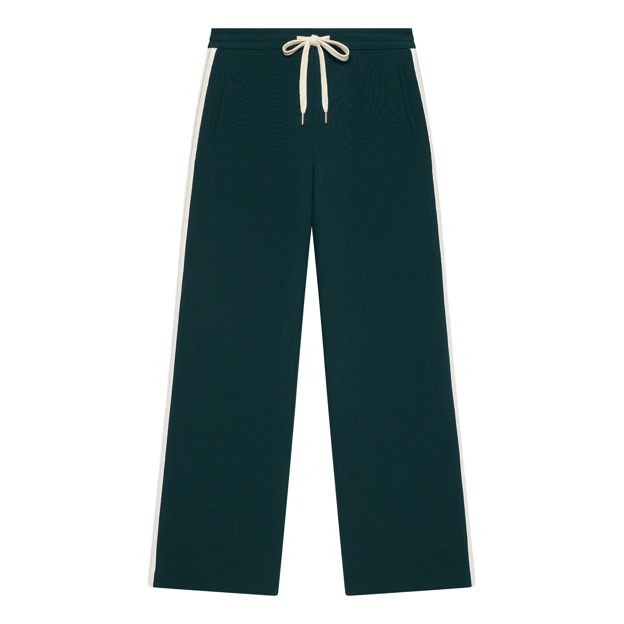 - Mid rise, wide leg, full length, drawstring fastening, clean hems, contrast stripe detailing along each leg
