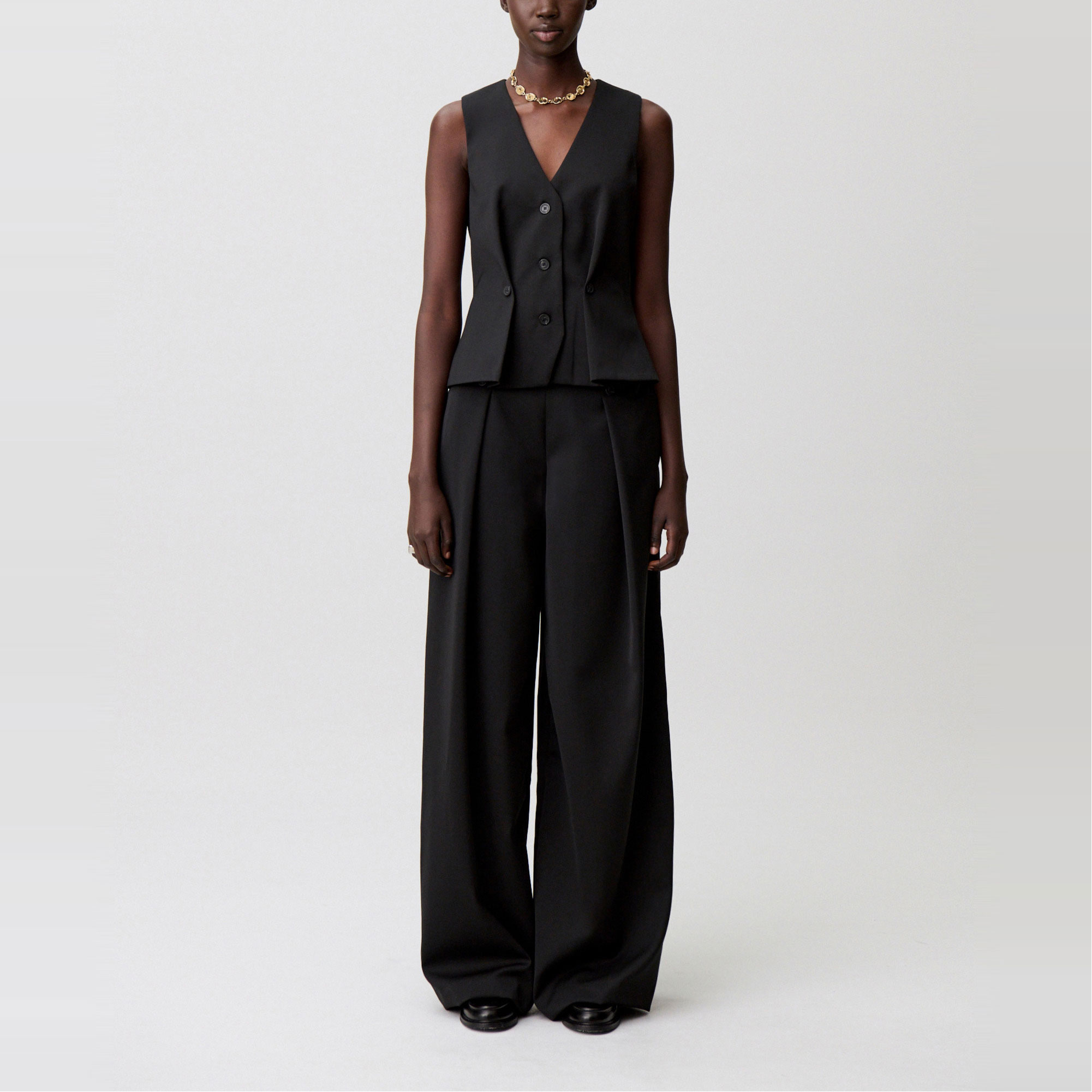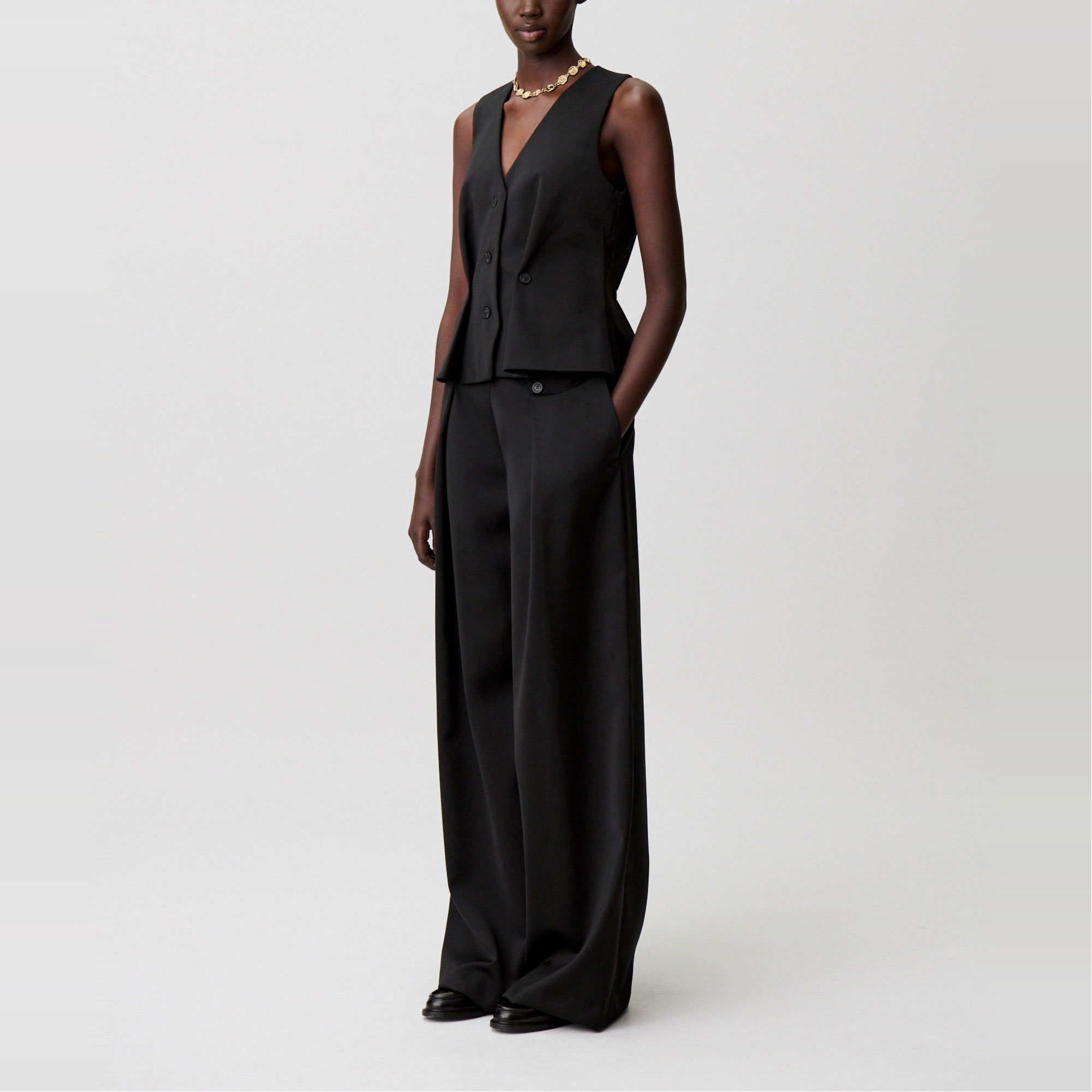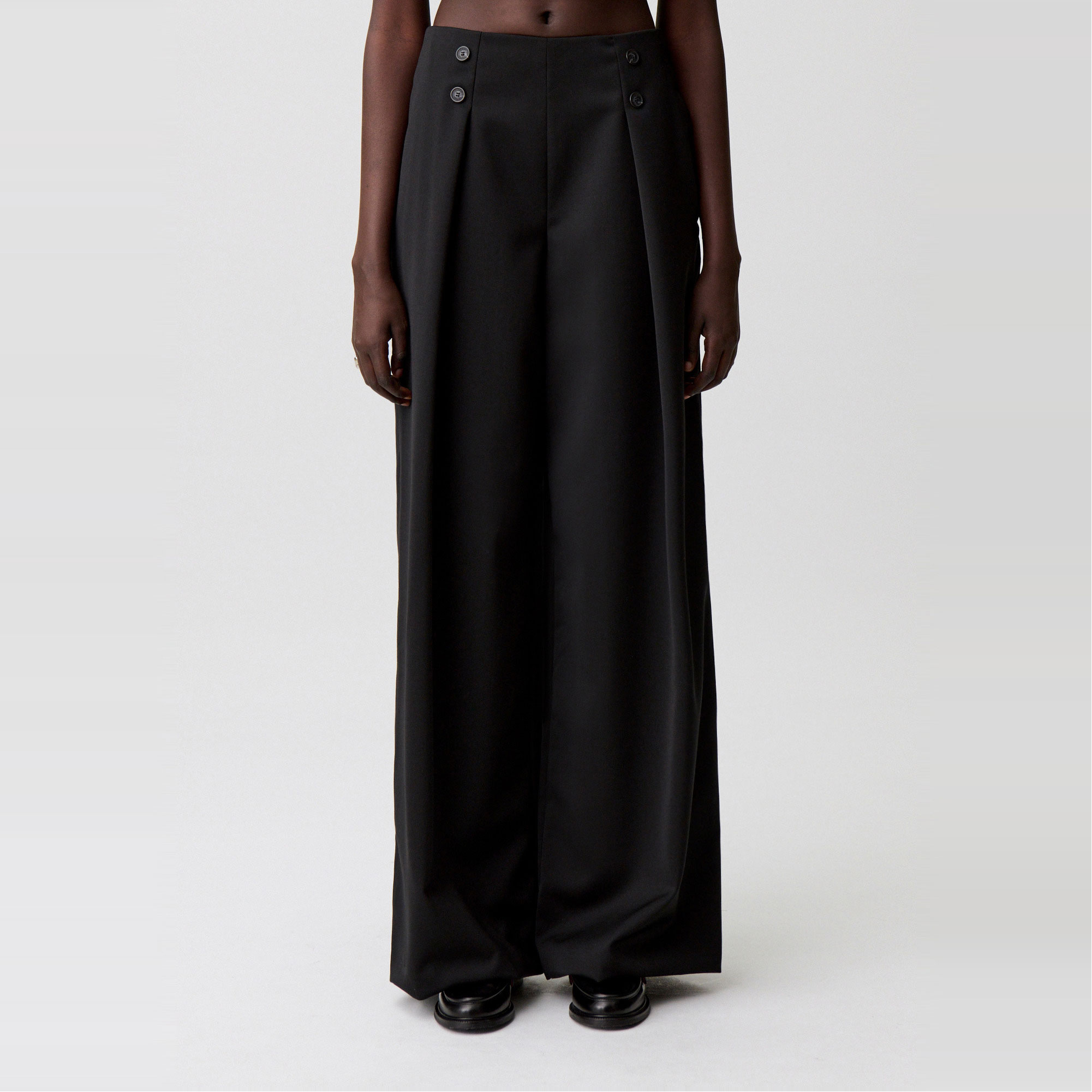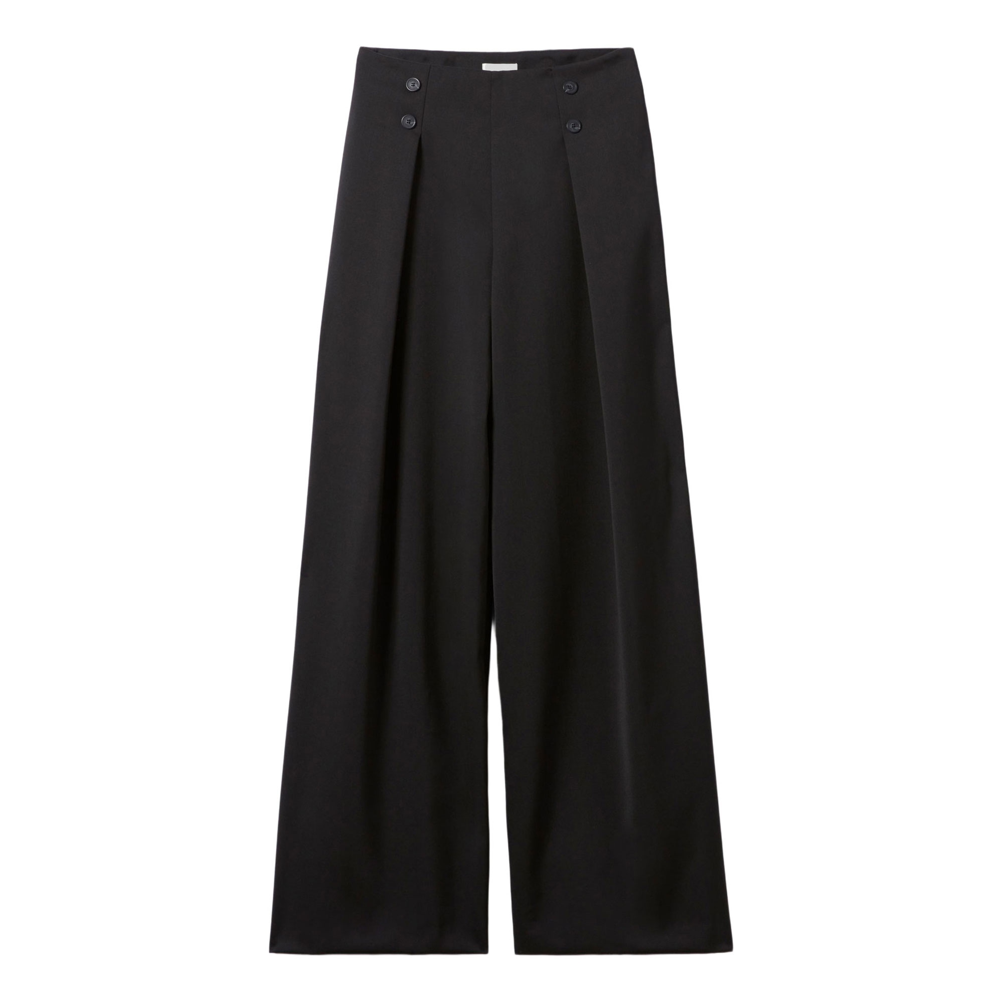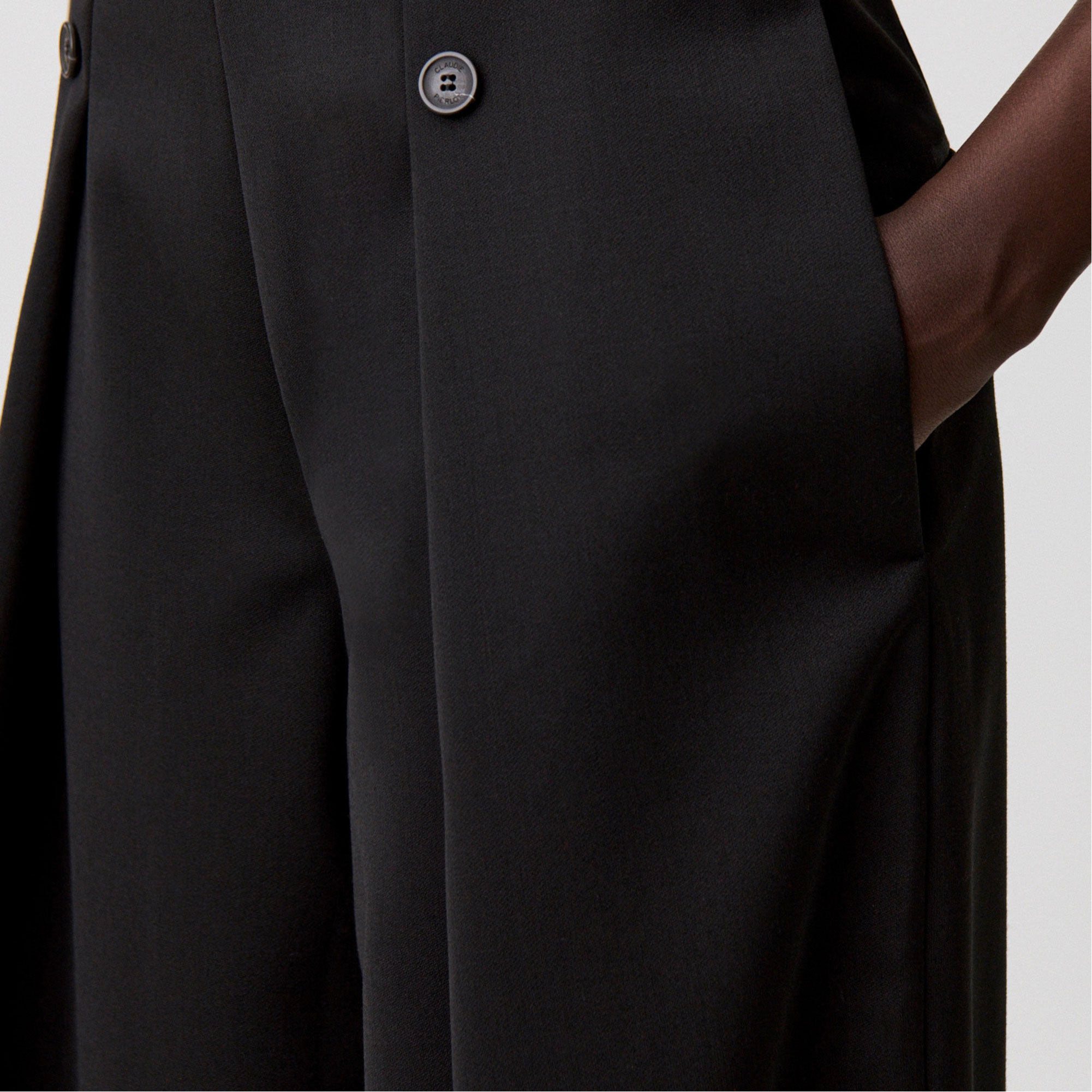 - Double button details, stitched pleats, clean waistband, side seam pockets, back welt pockets, wide leg, hook and invisible zip closure