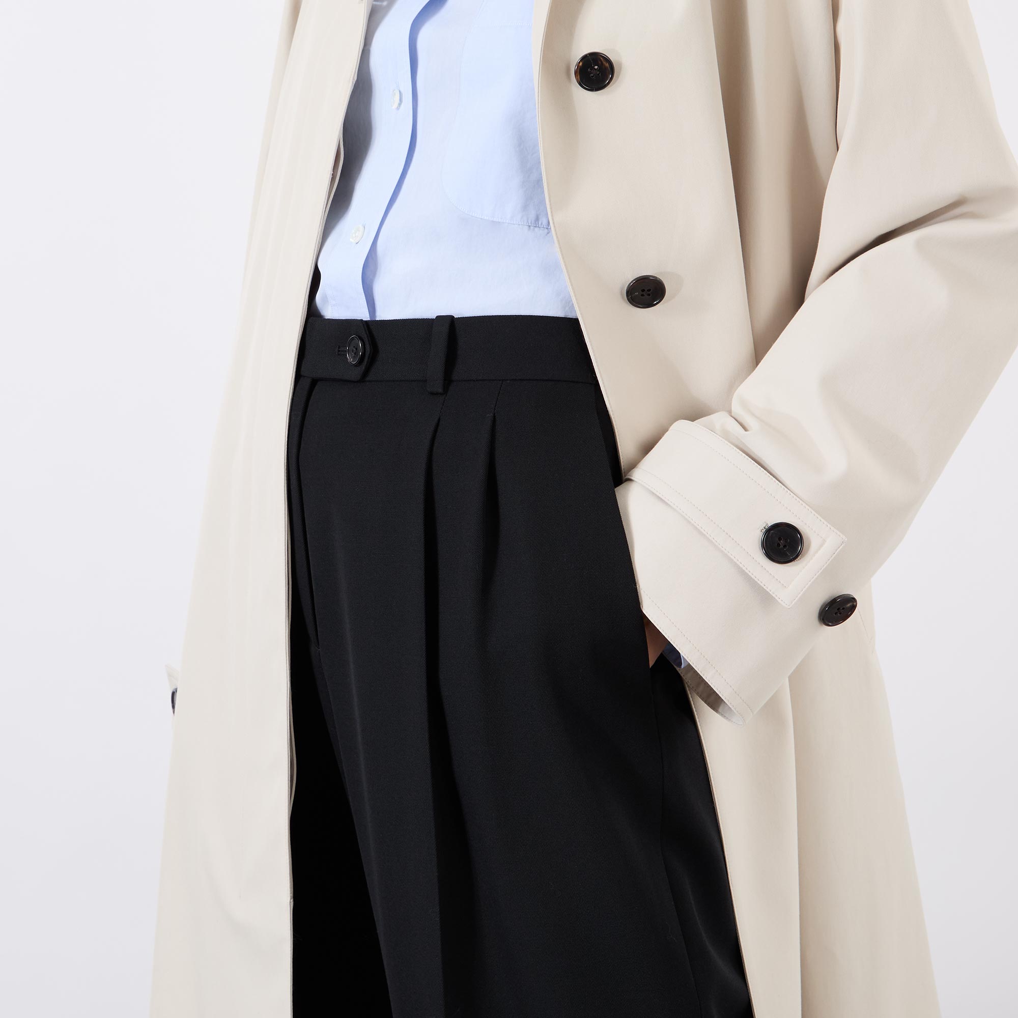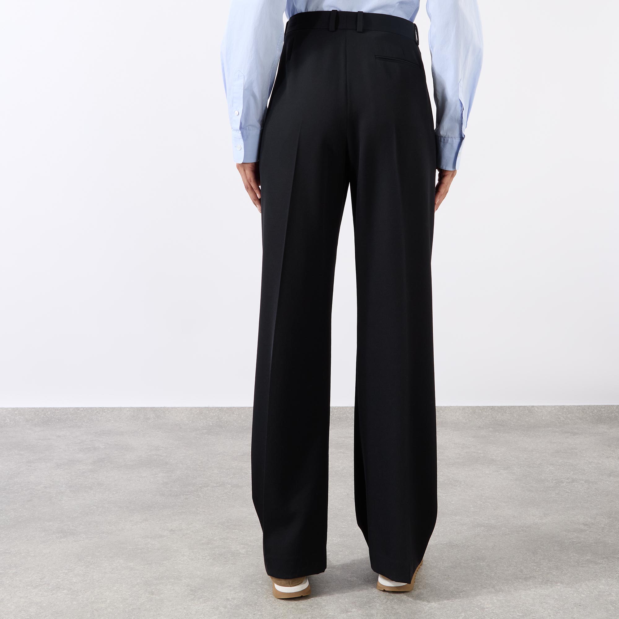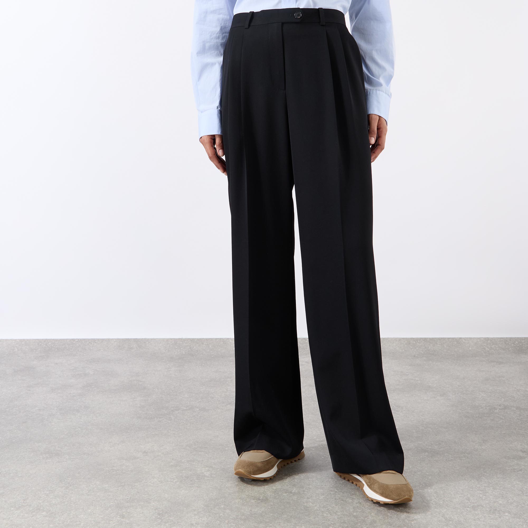 - Buttoned tab and fly zip fastening, belt loops, front double pleats, side slash pockets, rear jet pocket, wool gabardine fabric, straight-cut legs