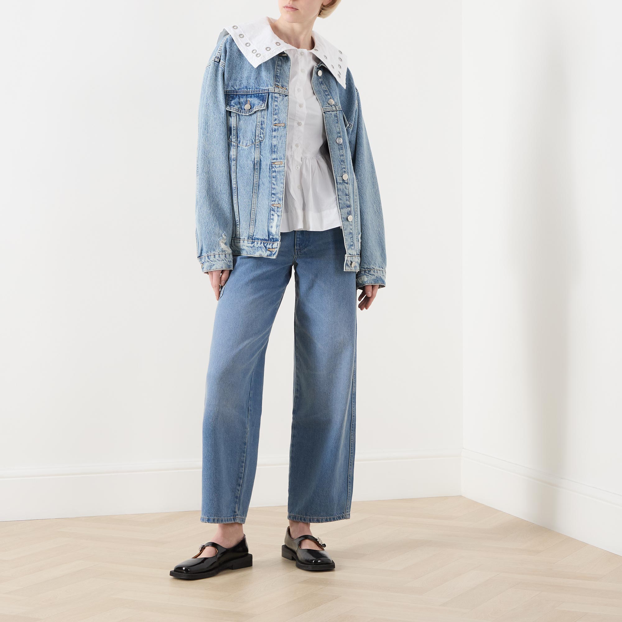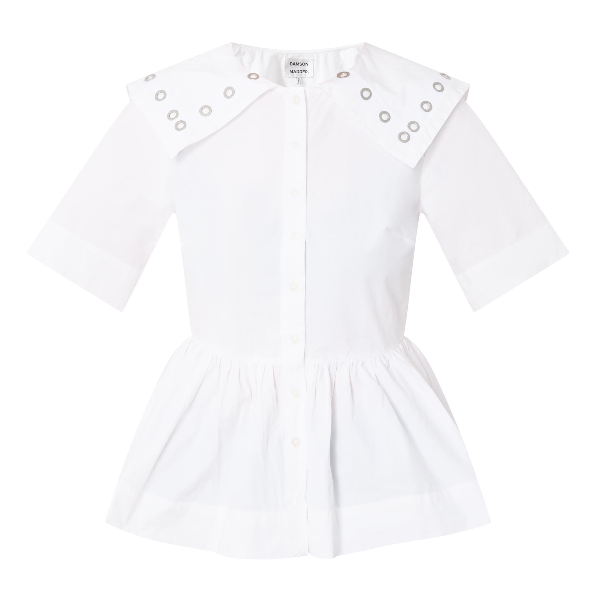 - Oversized collar, metal eyelet detailing, short sleeves, front button fastening, peplum hem, lightweight