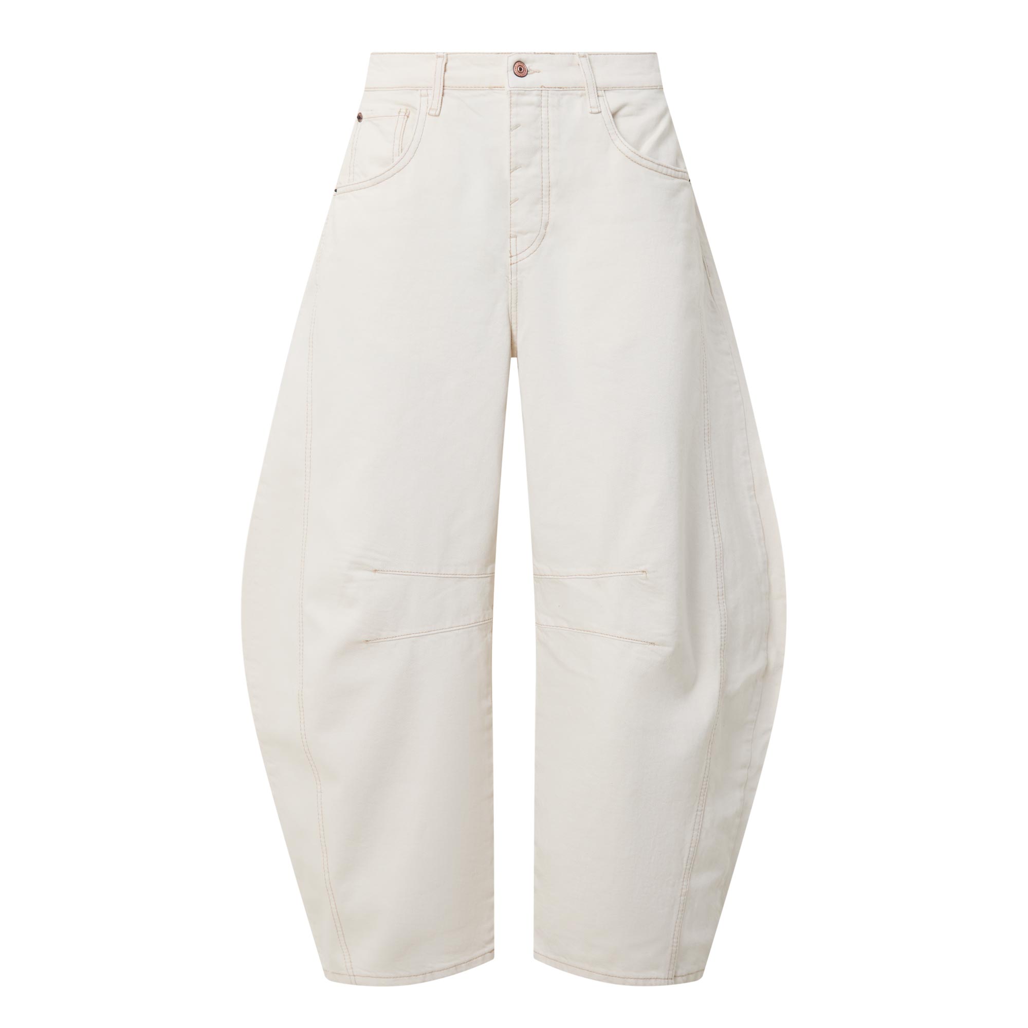 - Button and fly zip fastening, four-pocket style, belt loops, subtle distressing, barrel-shaped leg