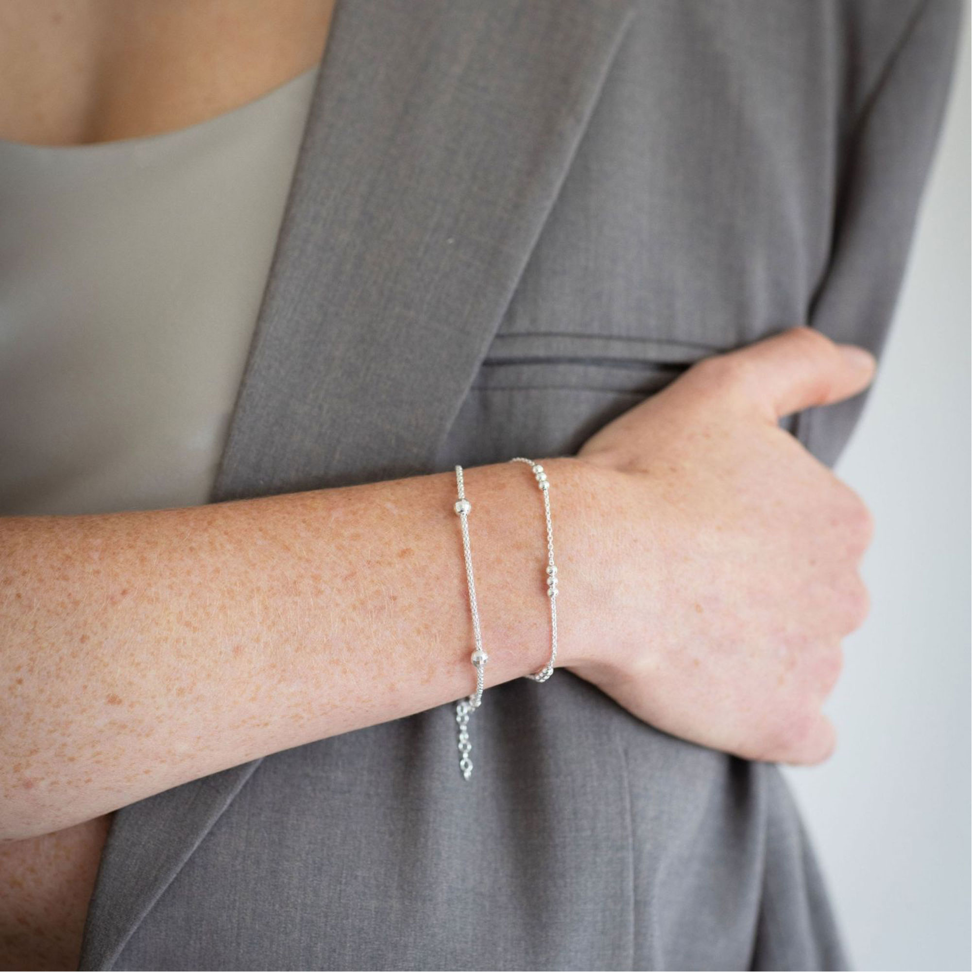 - Ball cluster design, sparkling chain, polished beads, versatile for layering or solo, logo detail
