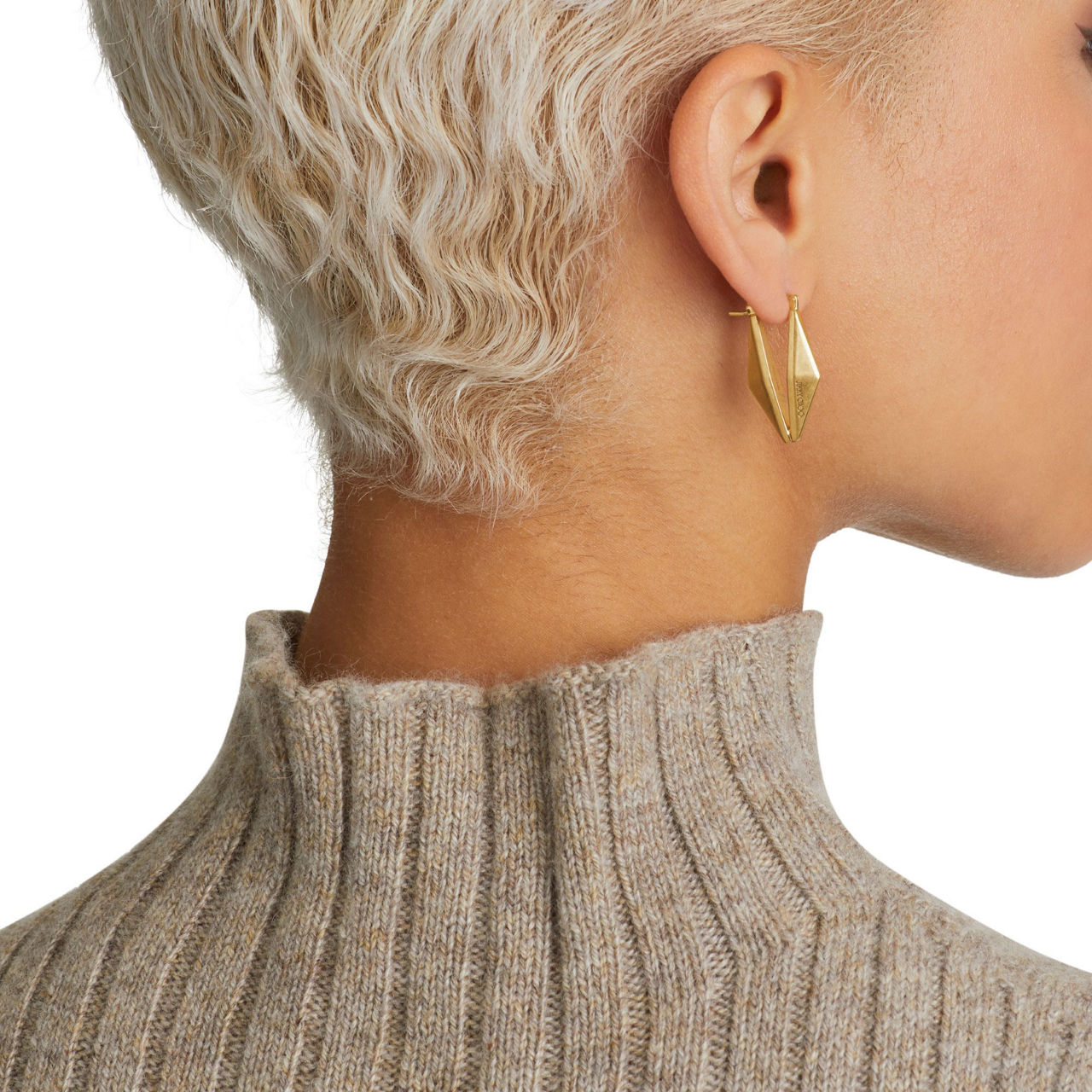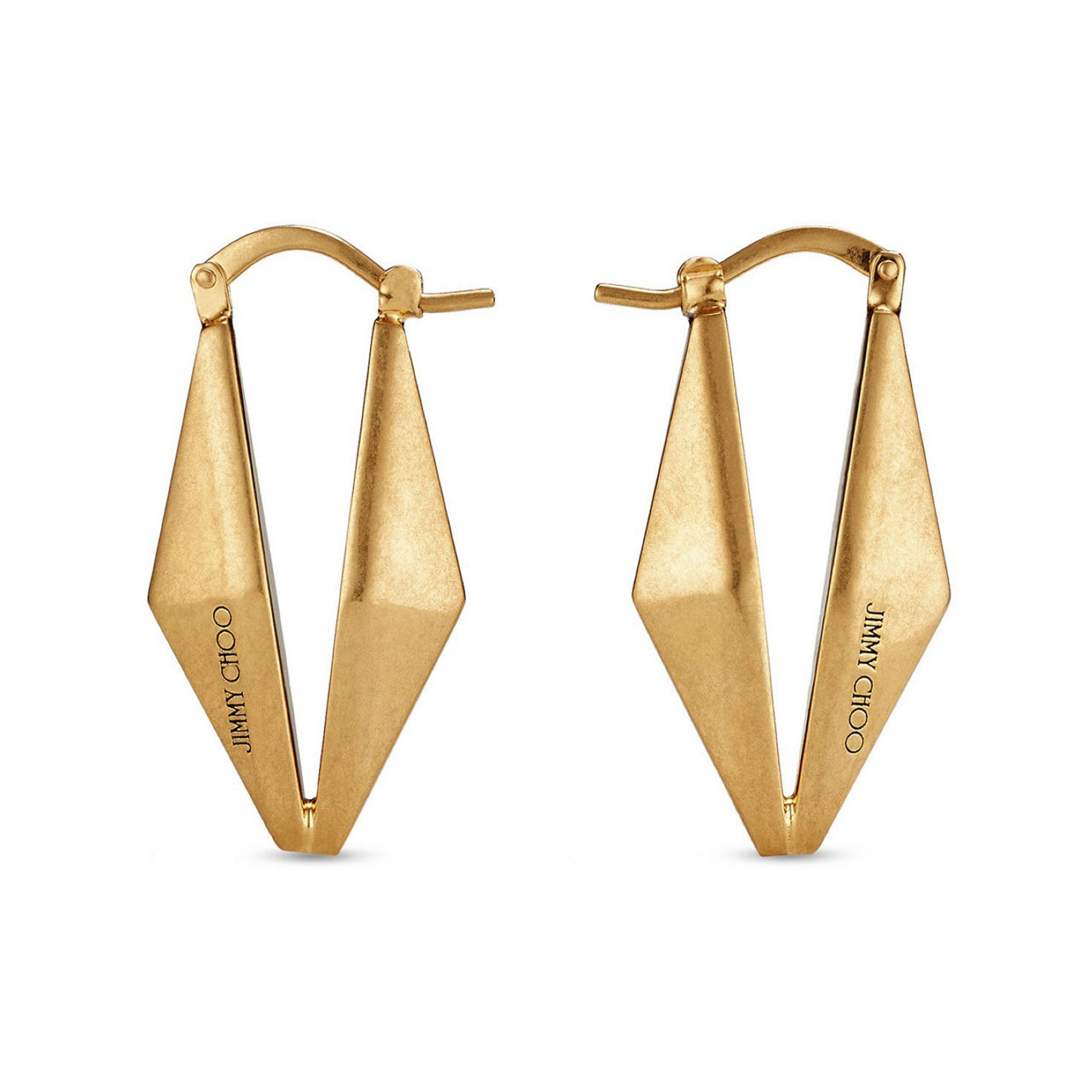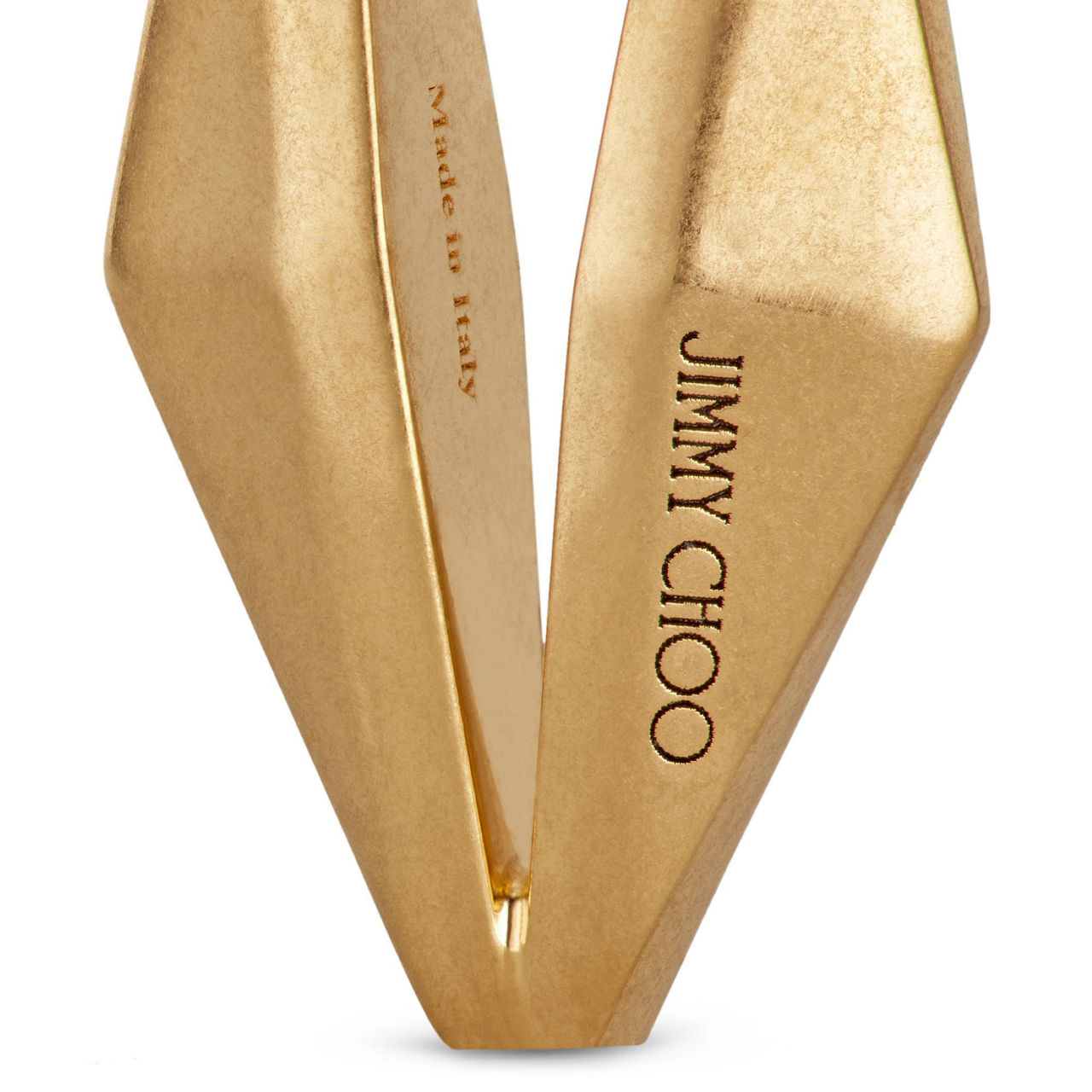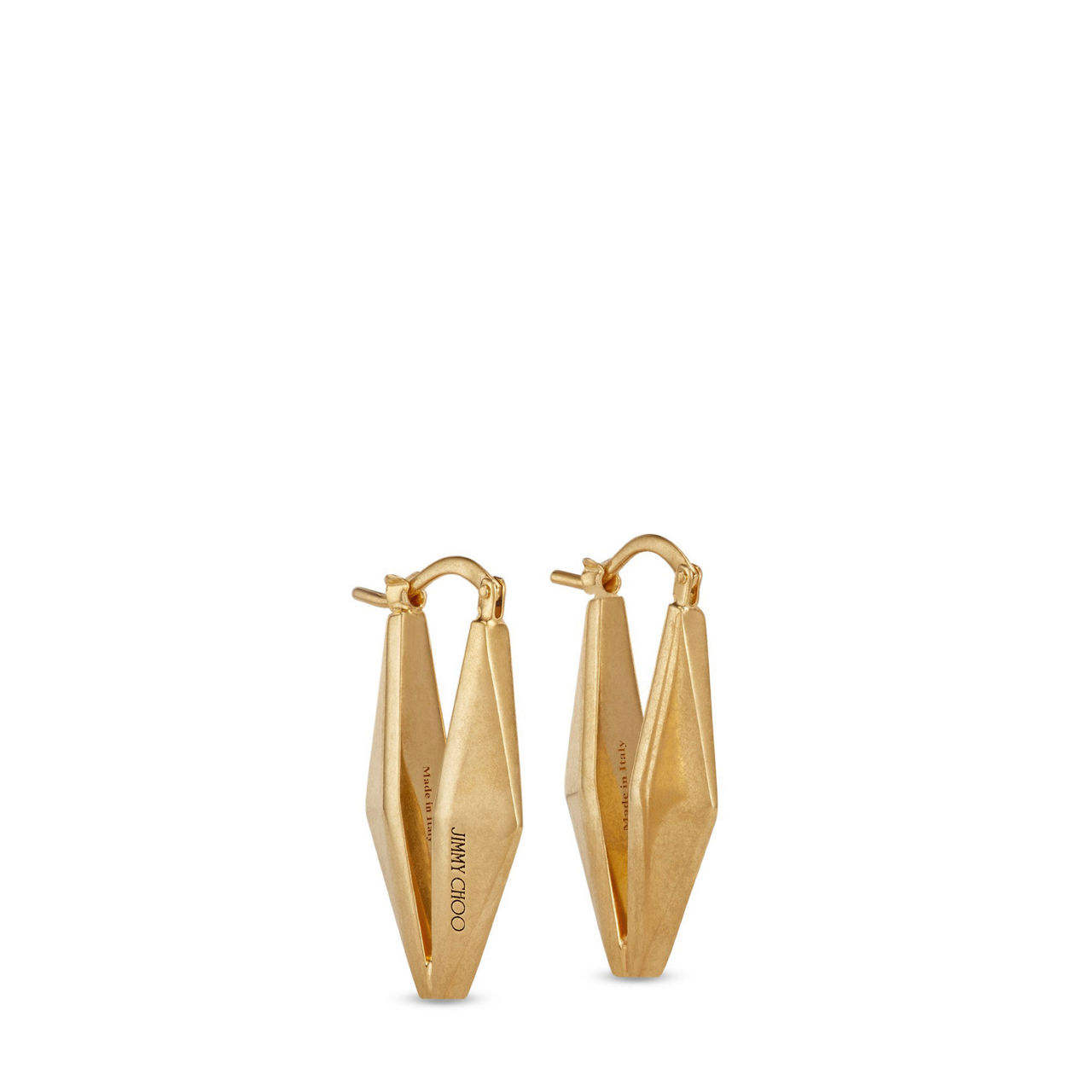 - Geometric diamond design, nickel-free brass with gold metal finishing, handcrafted, engraved logo, hinge-pin fastening