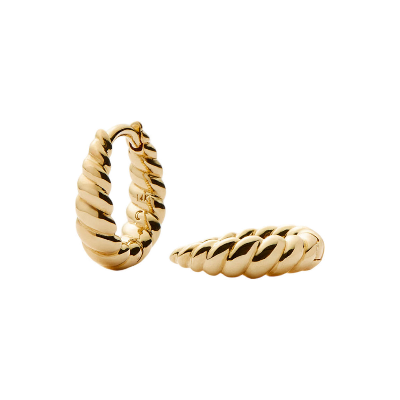 - 14kt solid gold, huggie style, twisted dome design, tapered silhouette, hinge fastening
