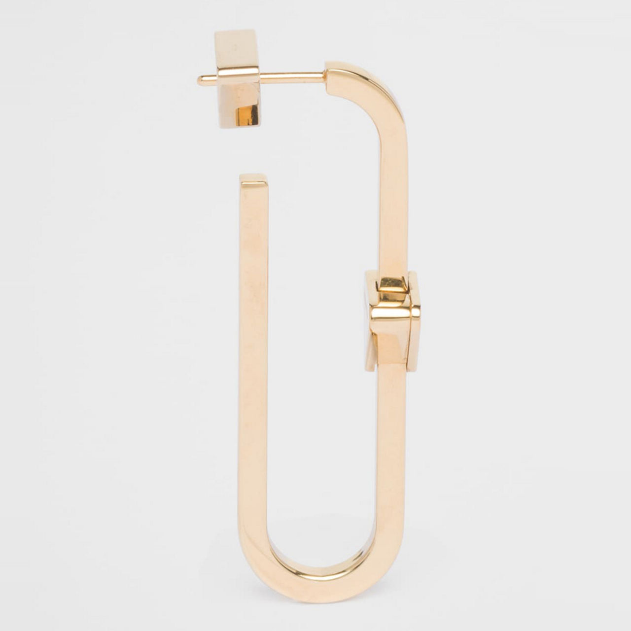 - Gold-tone metal hoops, earring backs for pierced ears, engraved triangle logo, oval shape