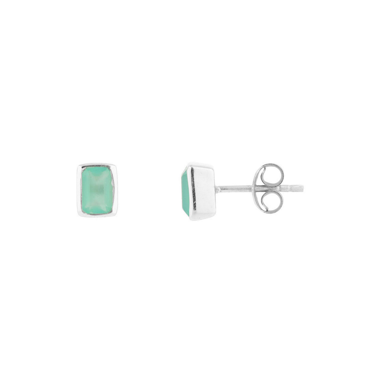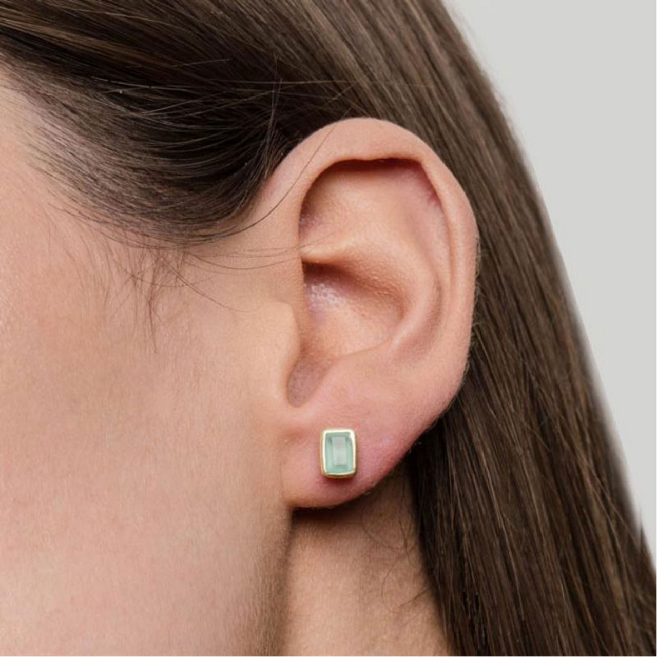 • Stud fastening, Aqua Chalcedony gemstone in a subtle polished setting, inspired by the twinkling windows of Manhattan’s Art Deco inspired architecture, silver-tone finish