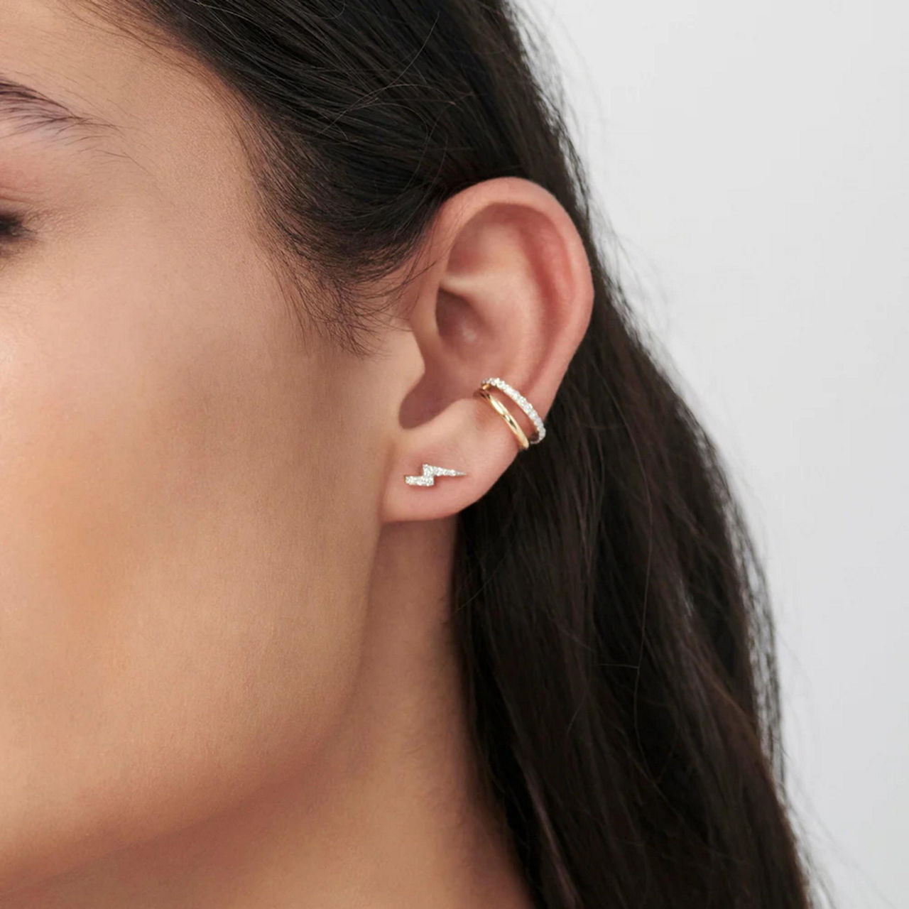 These solid gold lightning stud earrings are inset with diamond pavé set on a white rhodium finish. Pair with solid gold huggies for a refined ear stack.