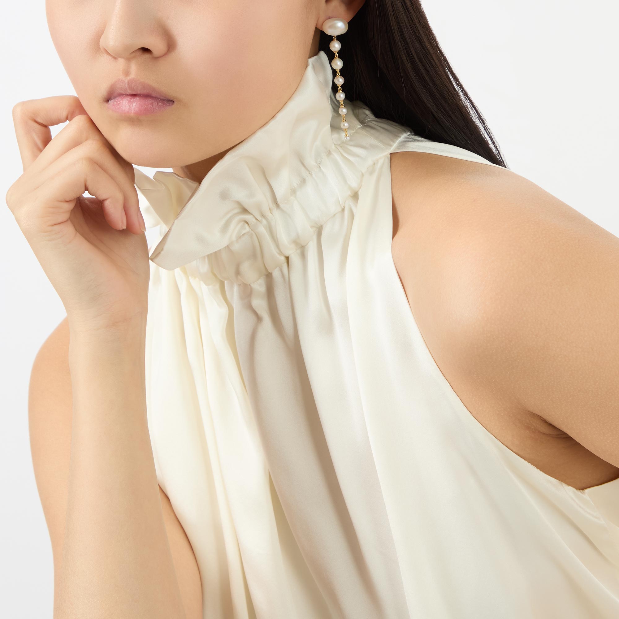 - Chandelier-style, post and pushback fastening, freshwater pearl details, gold-plated finish