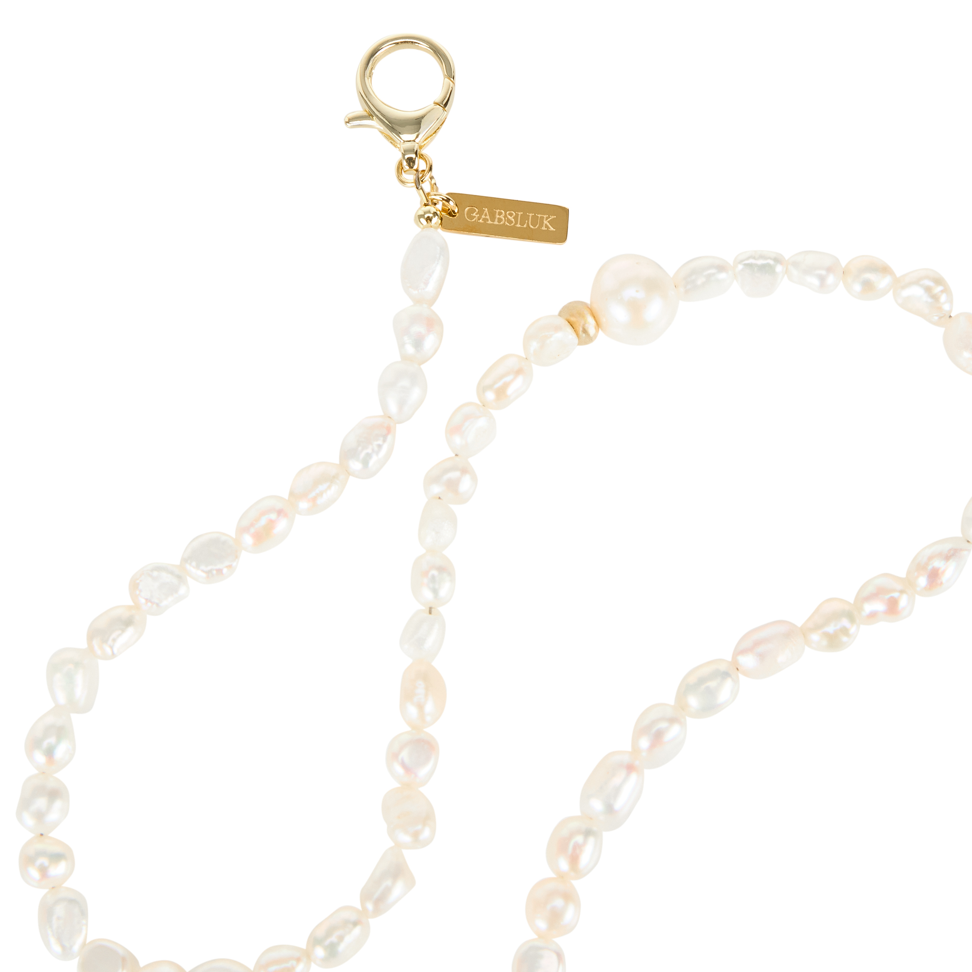 - Lobster claw clasp, gold-tone hardware, engraved logo nameplate, pearl beaded design