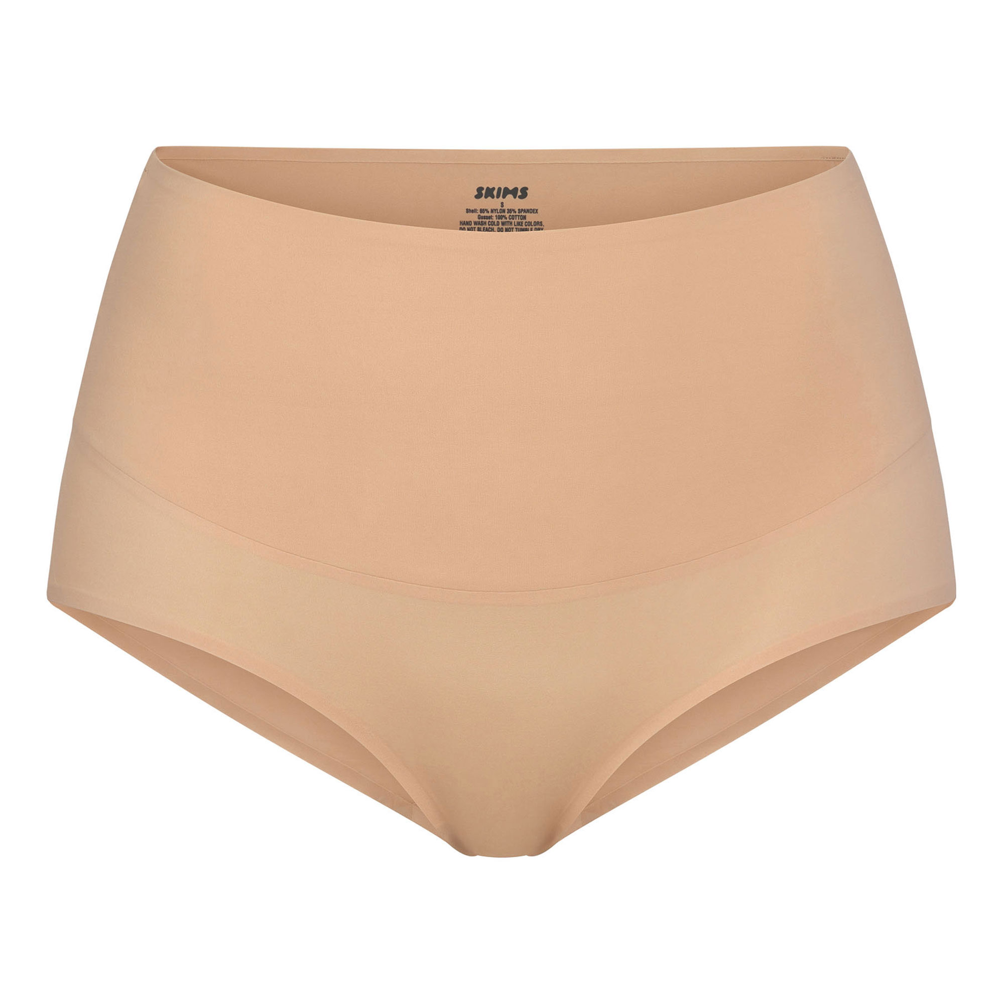 - High waist brief, wide, 2-ply smoothing waistband, clean bonded edges, 100% cotton gusset, brief back, maximum coverage