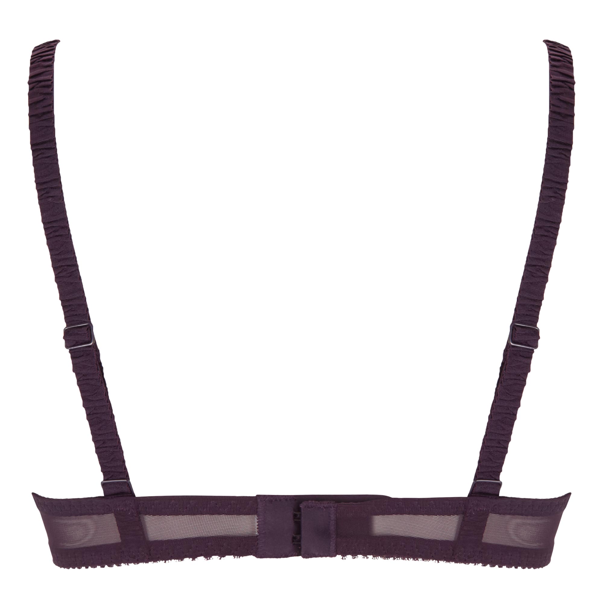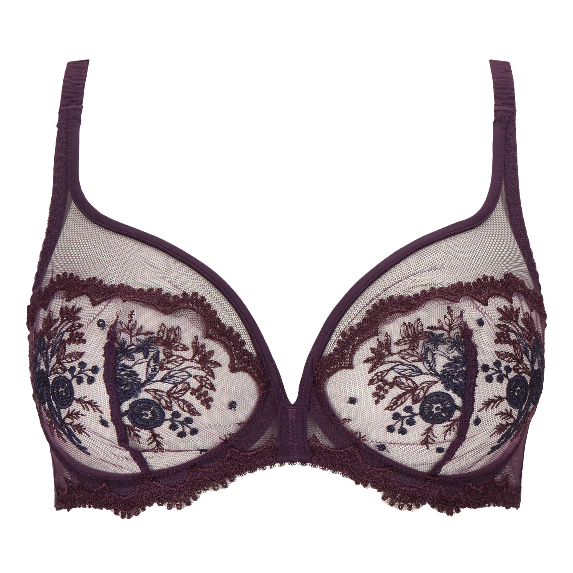 • Adjustable straps, mesh cups with floral embroidery, underwired support, plunge style, scalloped edges, hook-and-eye fastening, double clasp